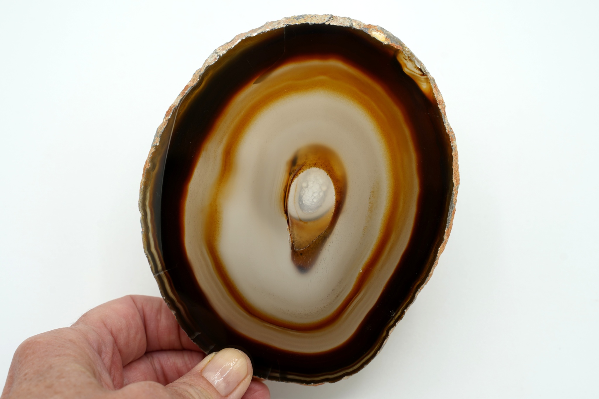 Velmi pěkná ametystová geoda se sytě fialovými drobnějšími krystaly a achátovým lemem, uvnitř je…