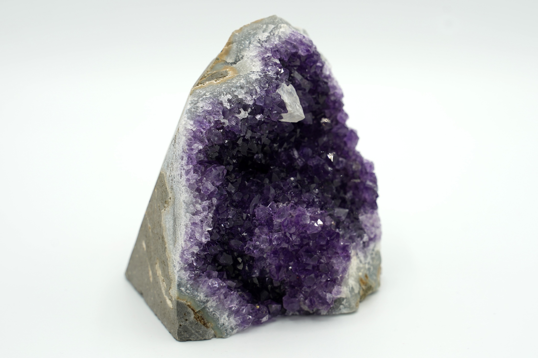 Velmi pěkná ametystová geoda se sytě fialovými drobnějšími krystaly a achátovým lemem, uvnitř je…