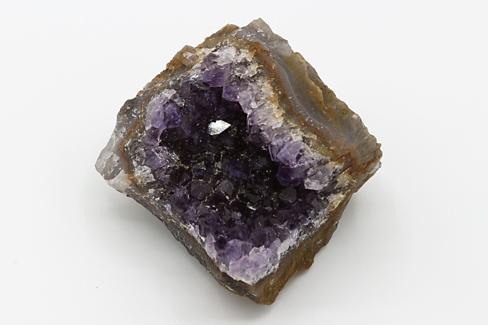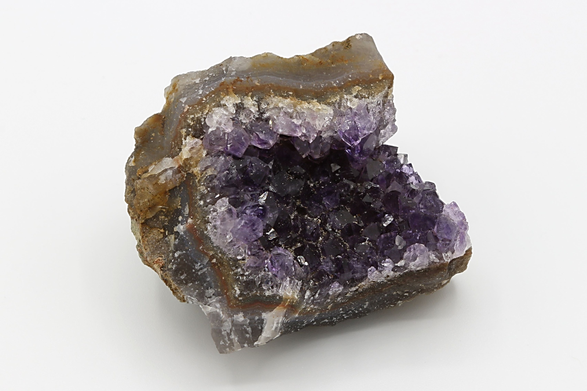 Velmi pěkná ametystová geoda se sytě fialovými drobnějšími krystaly a achátovým lemem, uvnitř je…