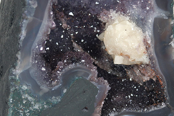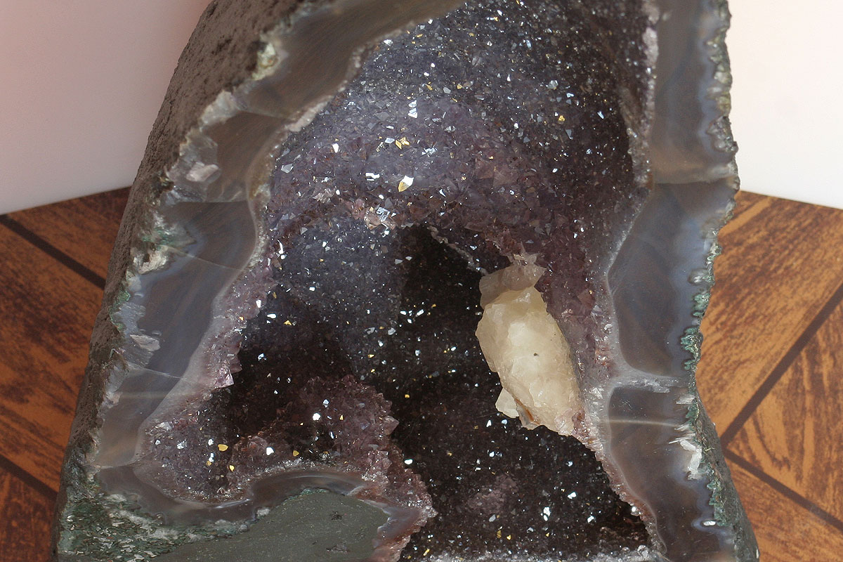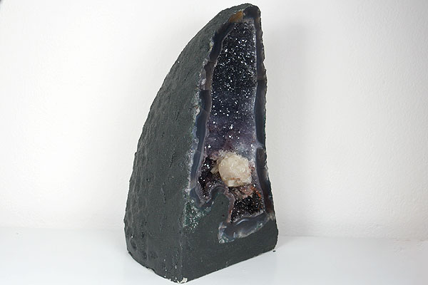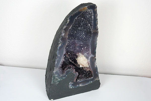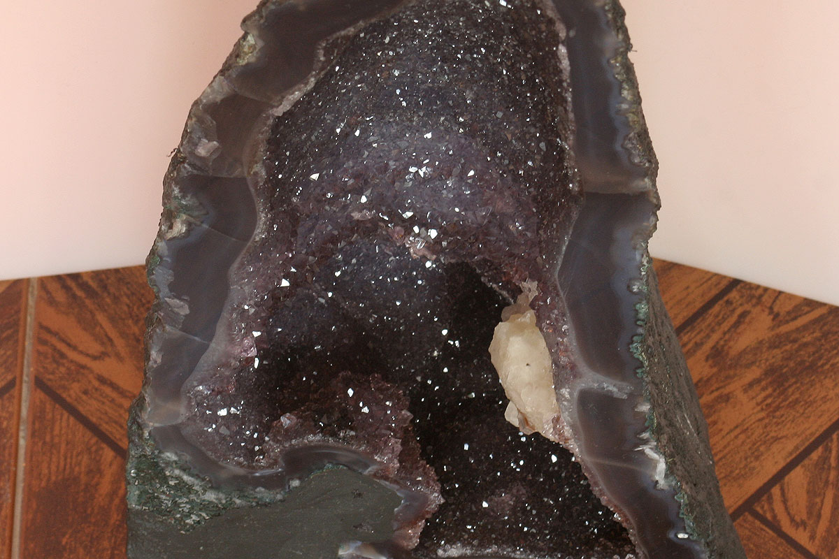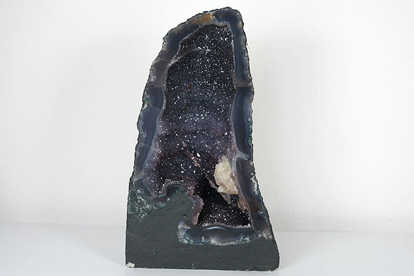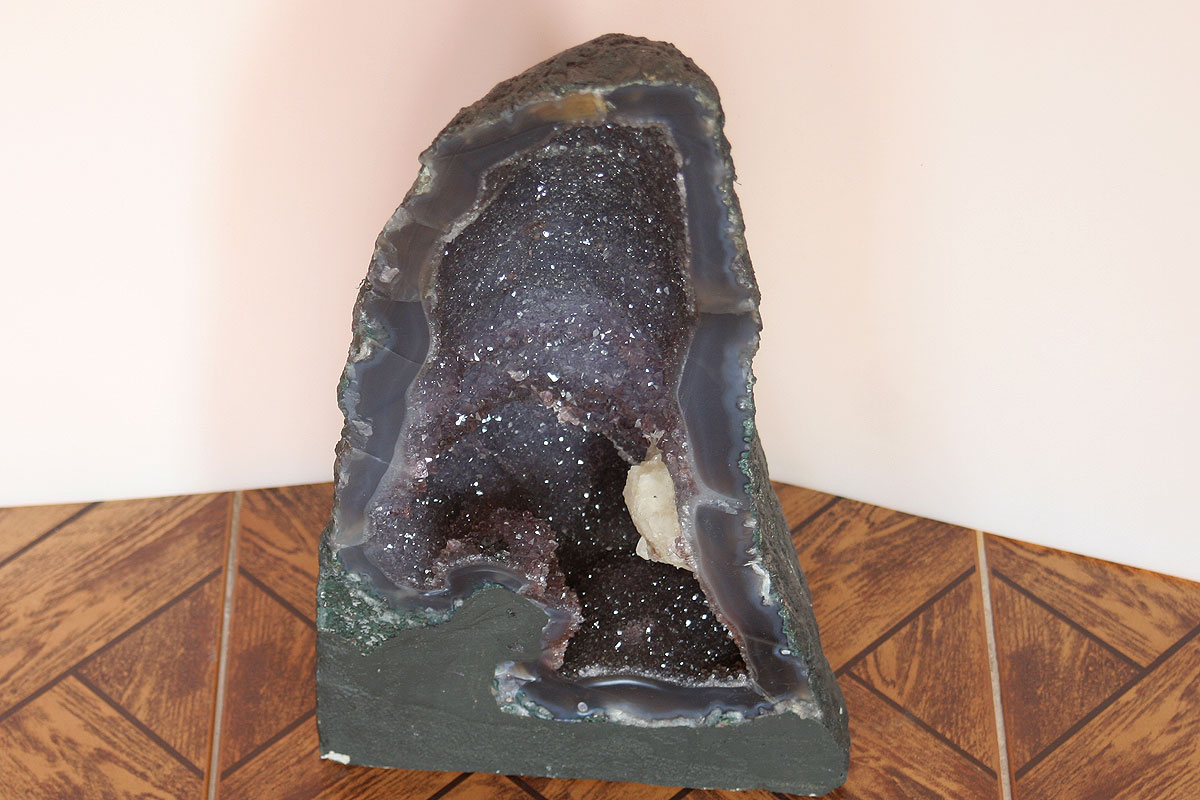 Velmi pěkná ametystová geoda se sytě fialovými drobnějšími krystaly a achátovým lemem, uvnitř je…
