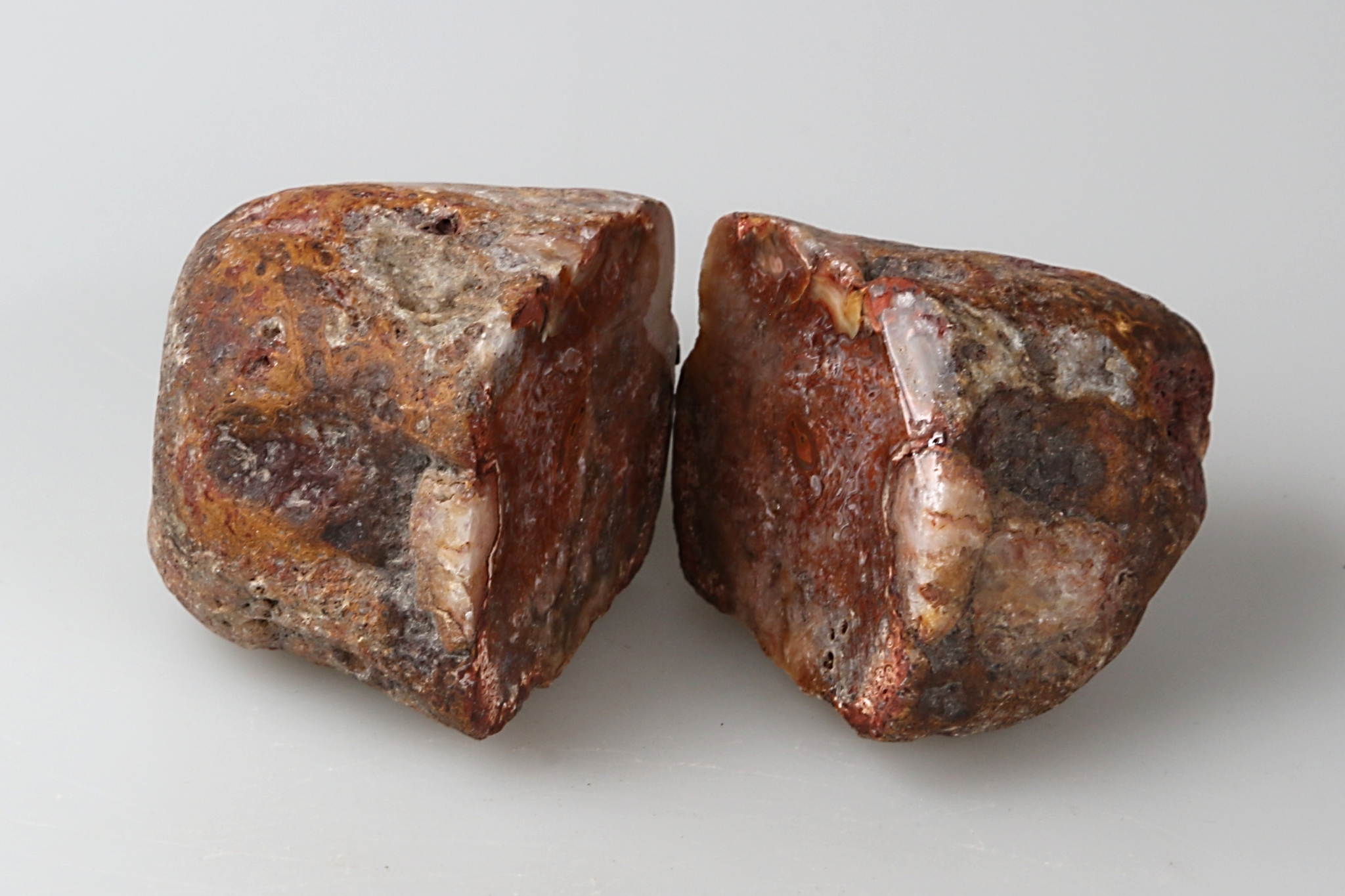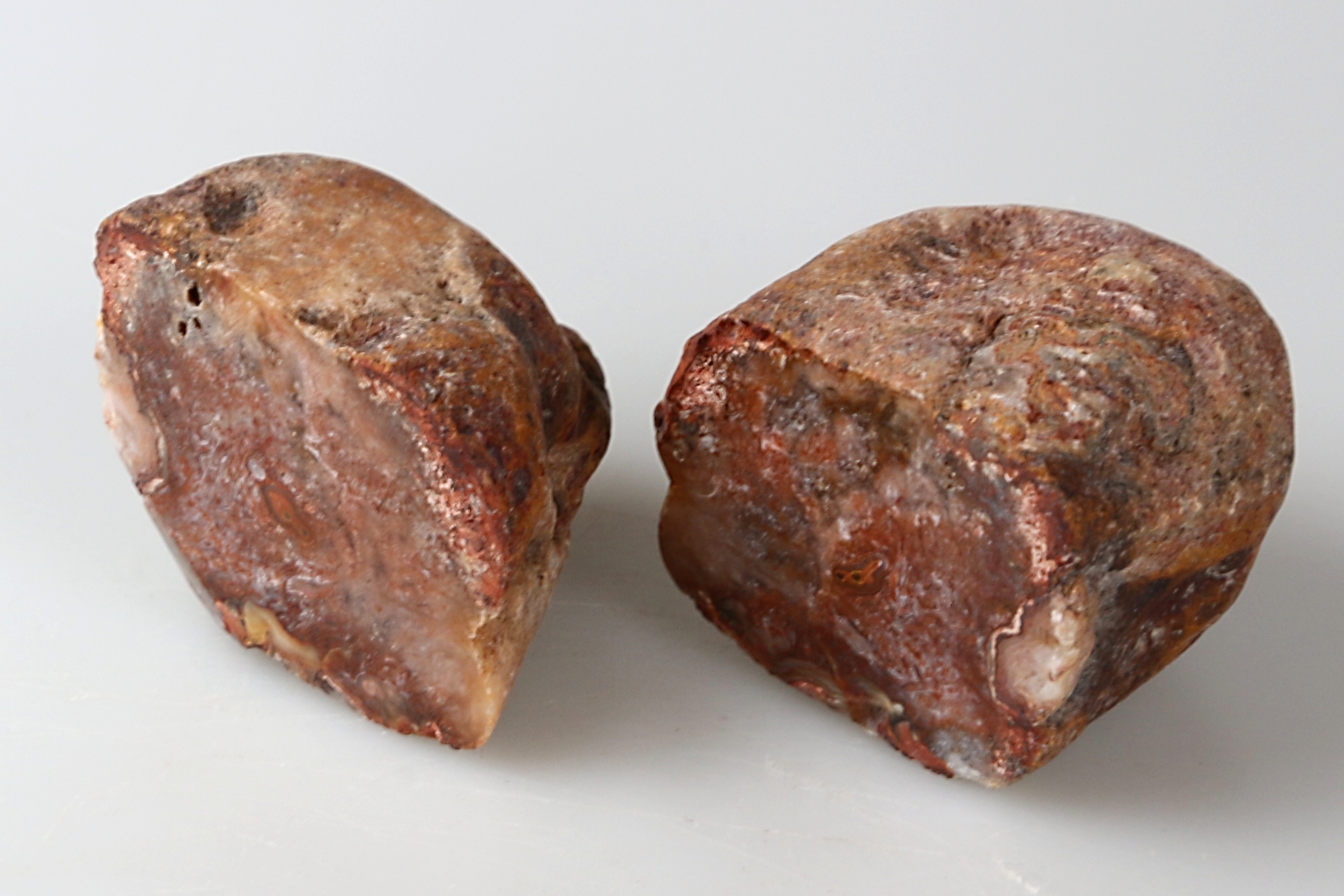 Pár geod z achátu Bahía, na řezu jsou plochy leštěné