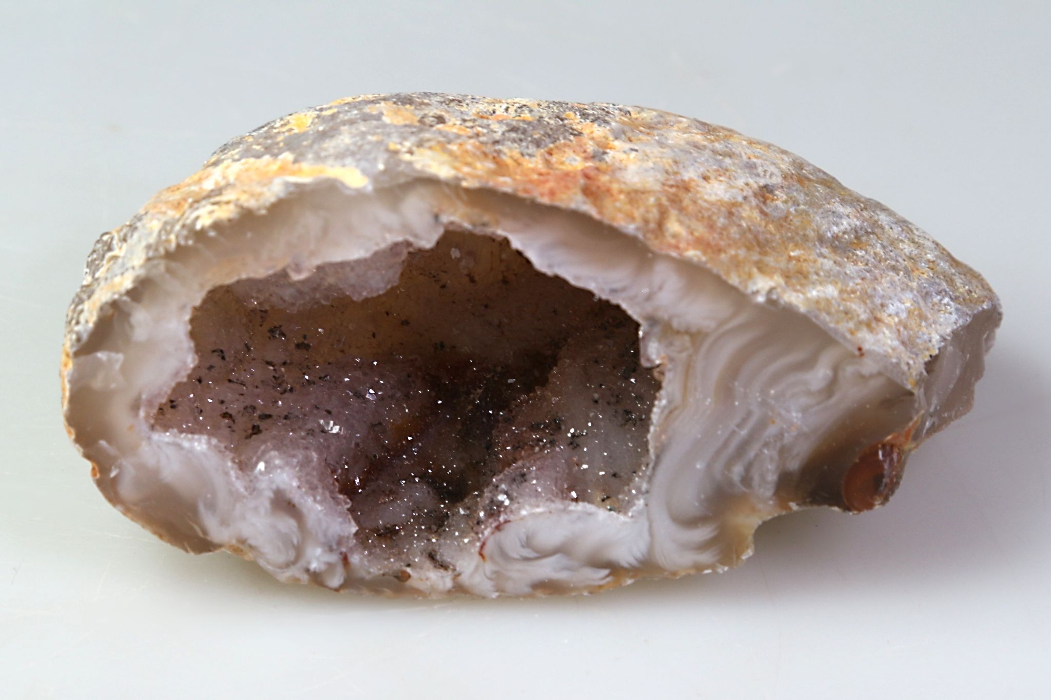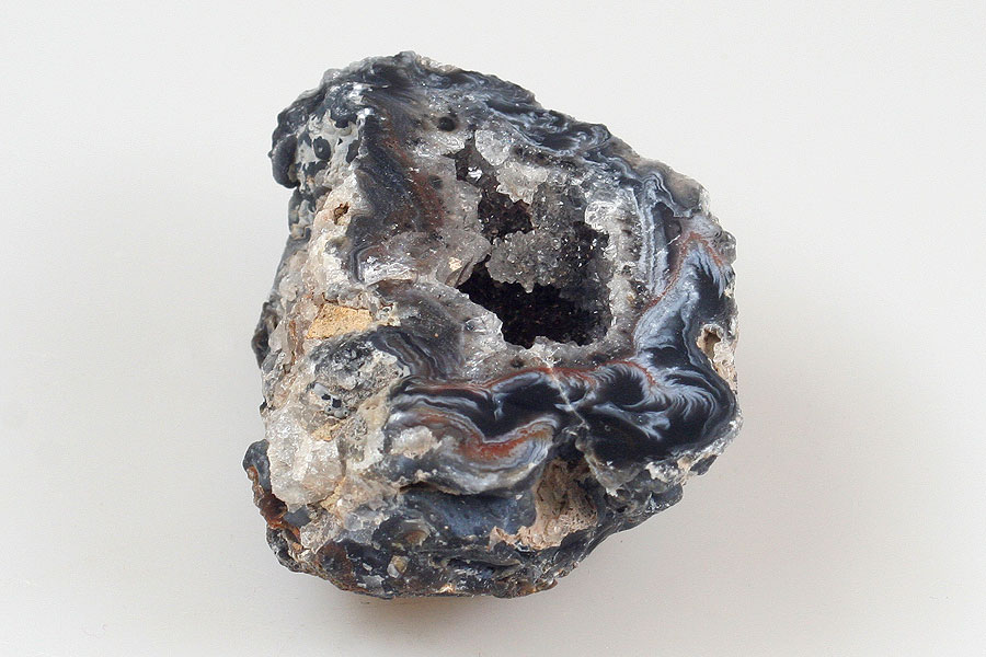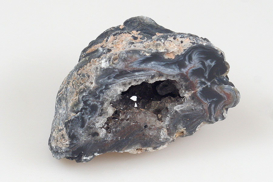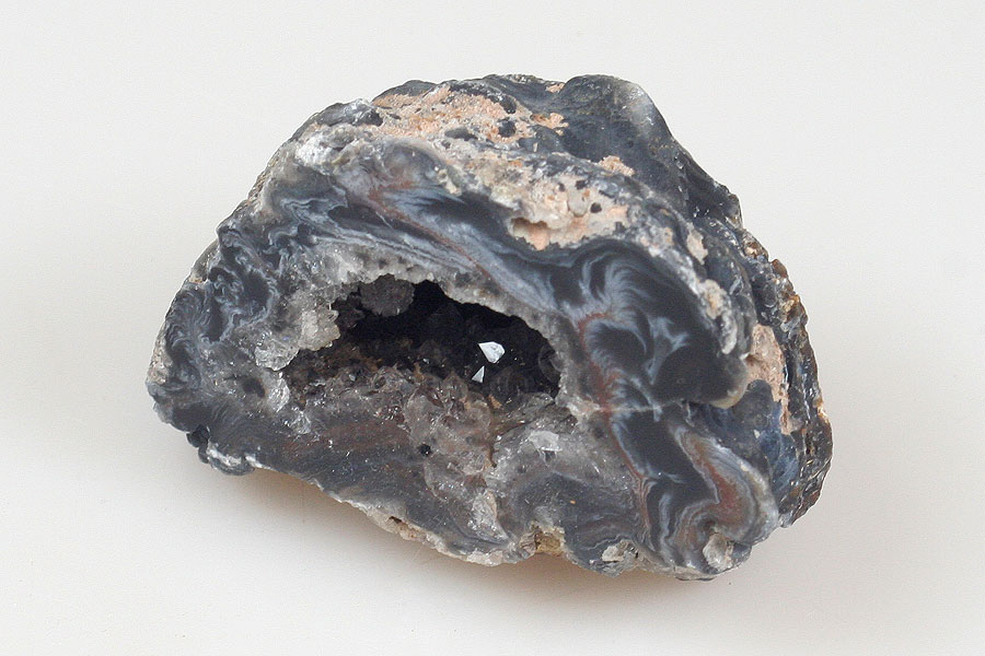 Geoda z peříčkového achátu s dutinkou tvořenou krystaly převážně křišťálu a s tenkým achátovým okrajem.