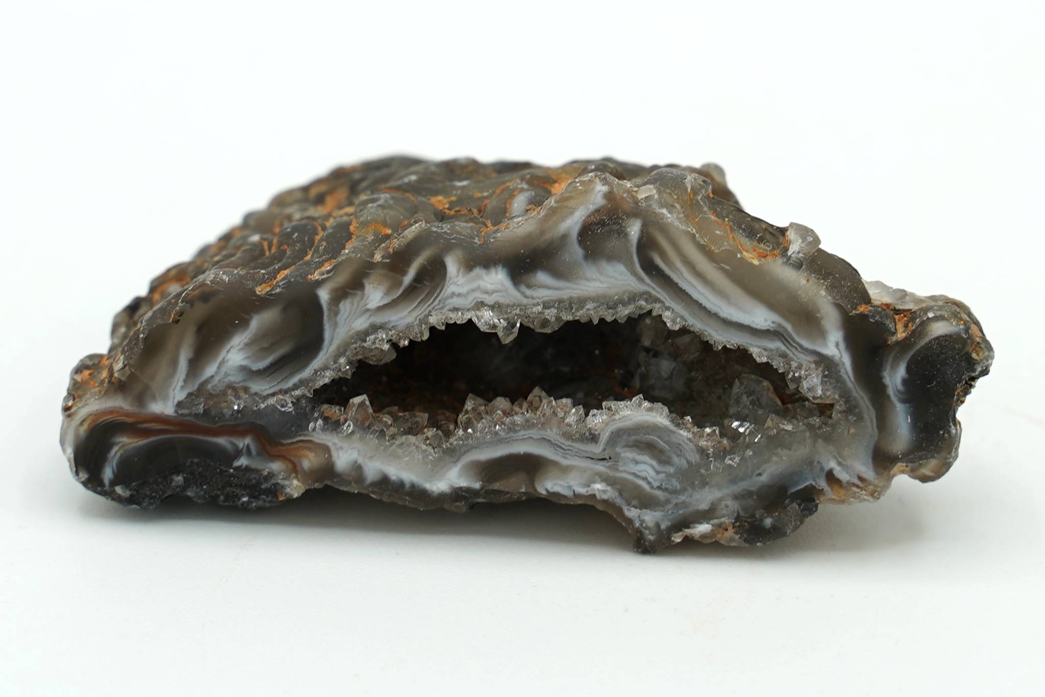 Achát peříčkový s dutinkou tvořenou krystaly převážně křišťálu a s achátovým okrajem.