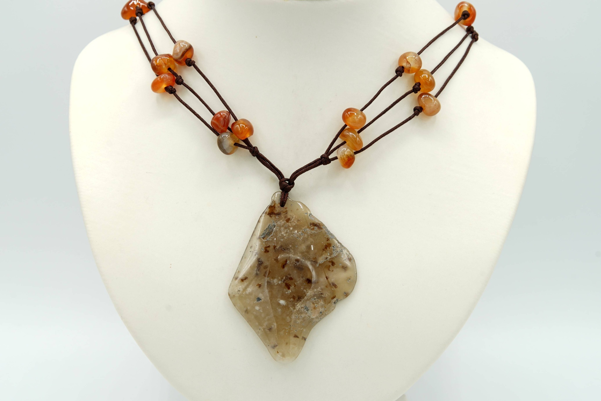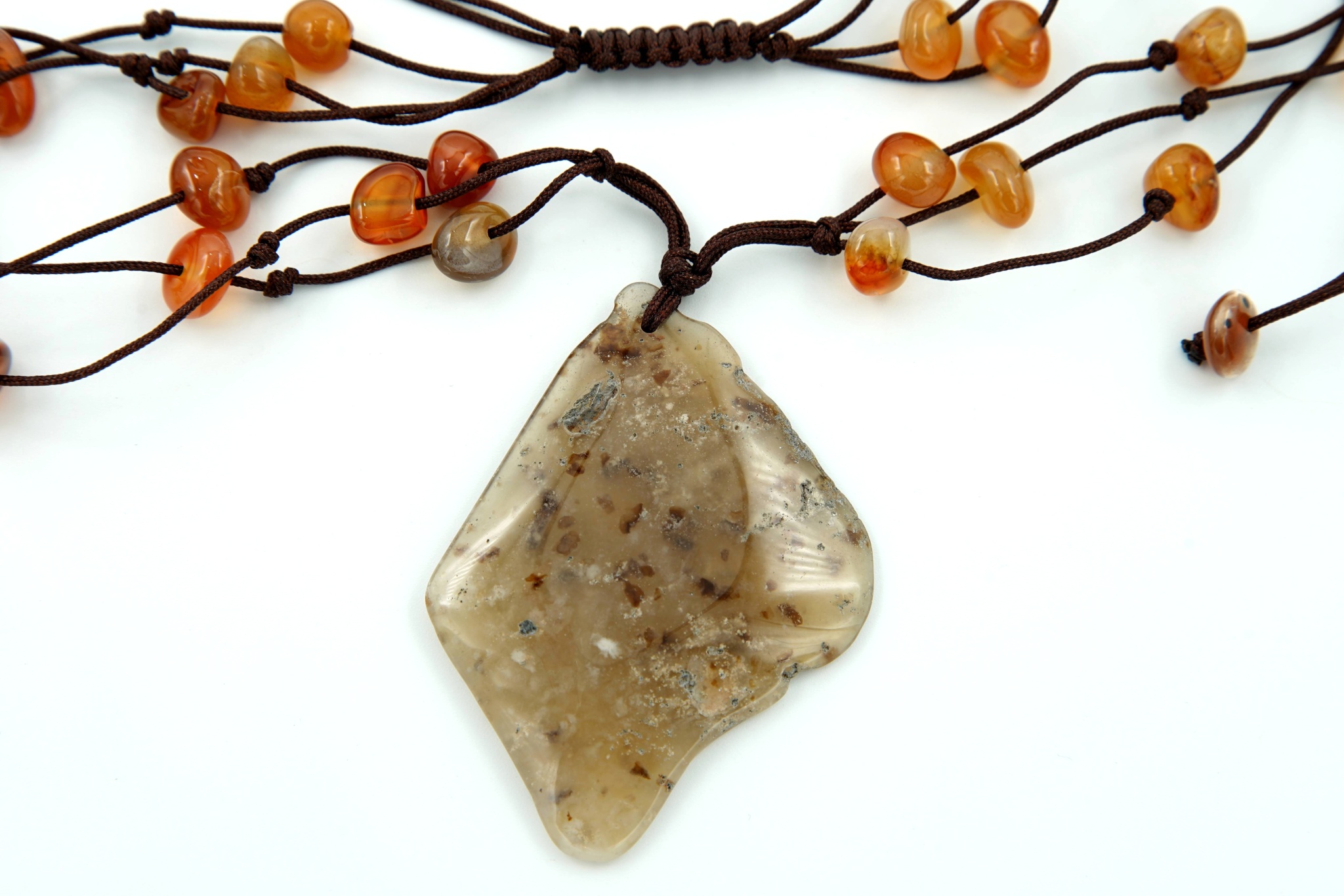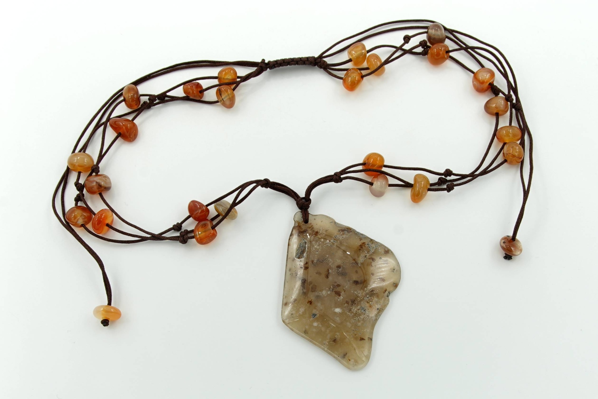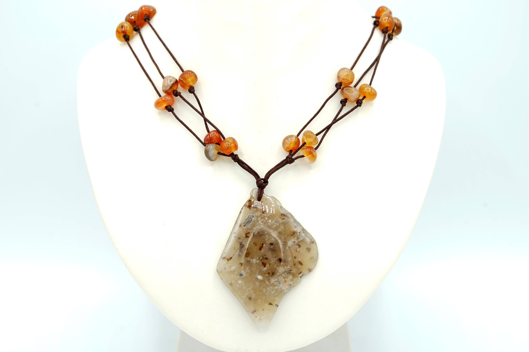 Hlavní kámen (cca 6,3 x 4,7 cm) je zavěšen na třířadé textilní šnůrce s navlečenými achátovými kamínky.