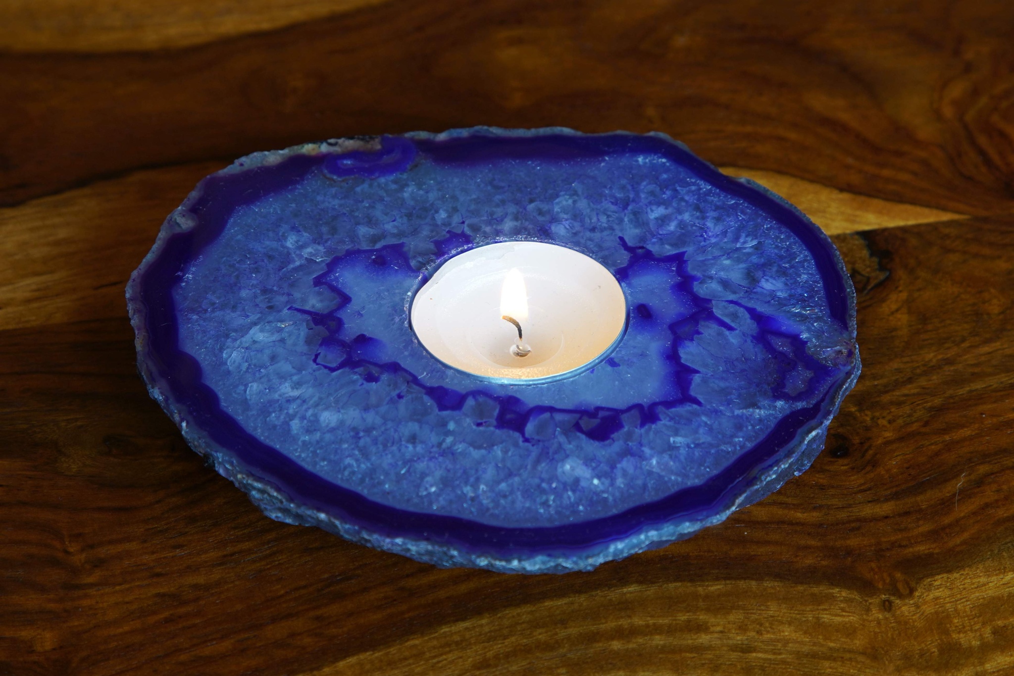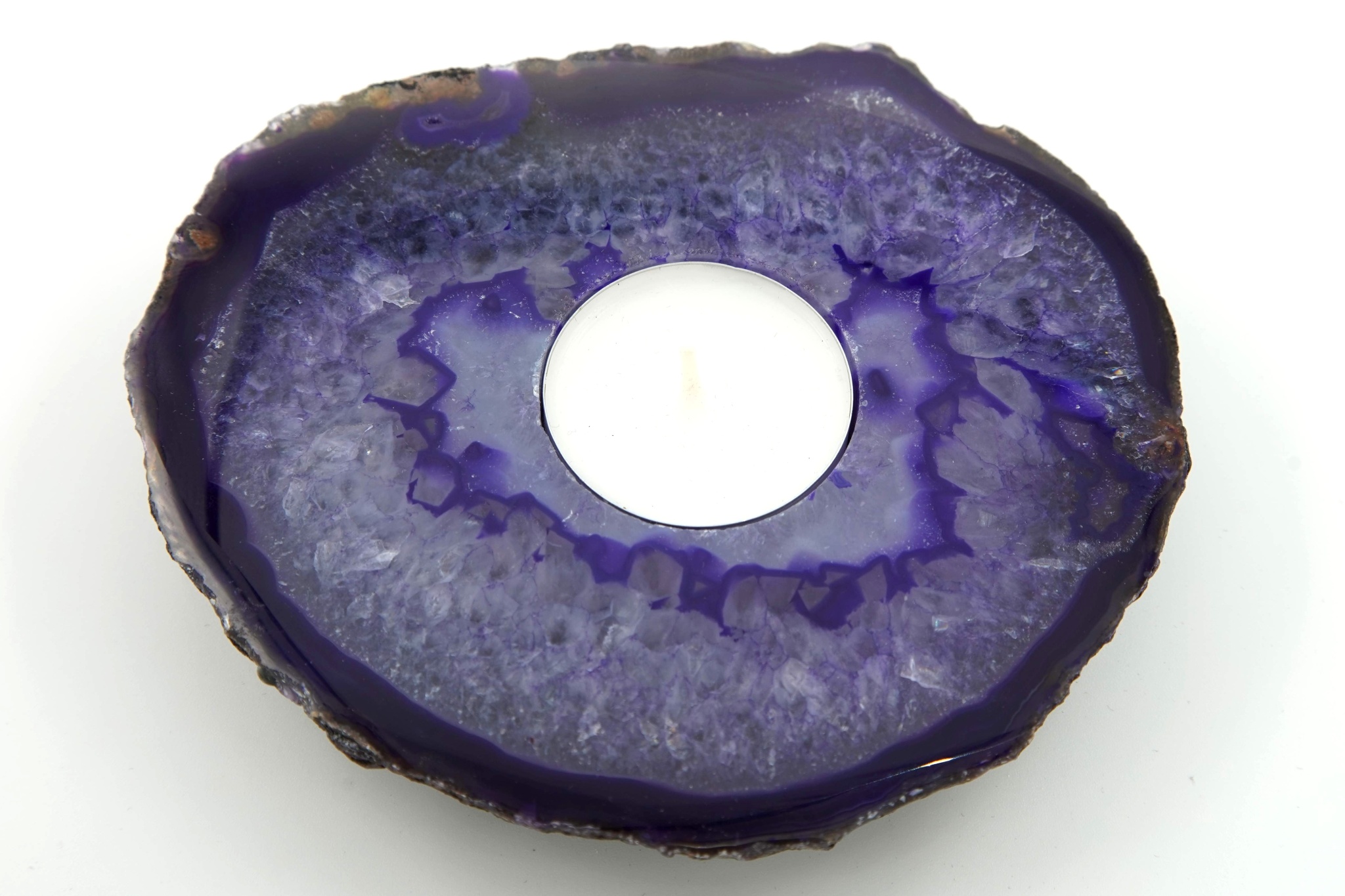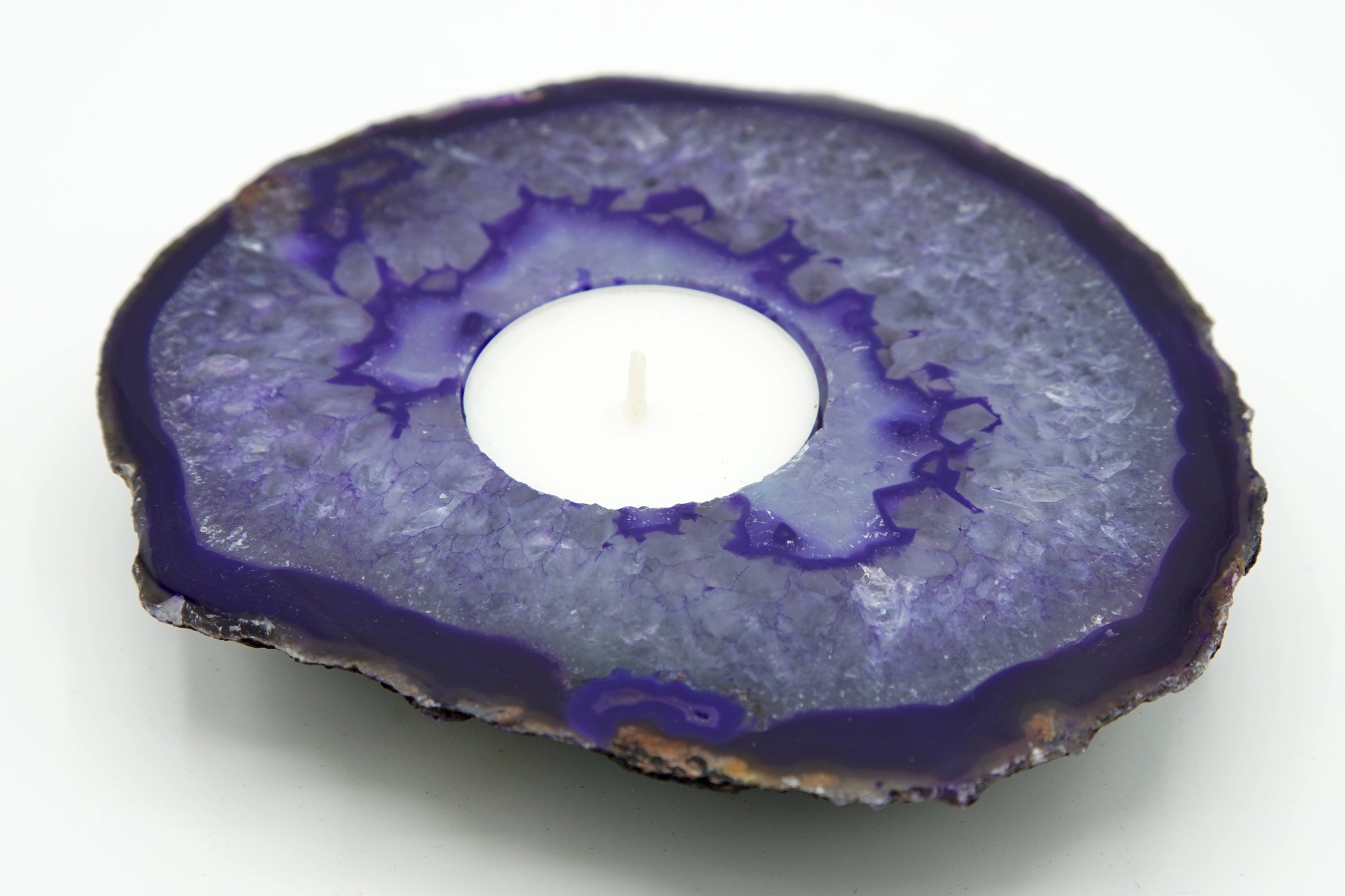Achátový svícen barvený, se zbroušenou a leštěnou jednou plochou.