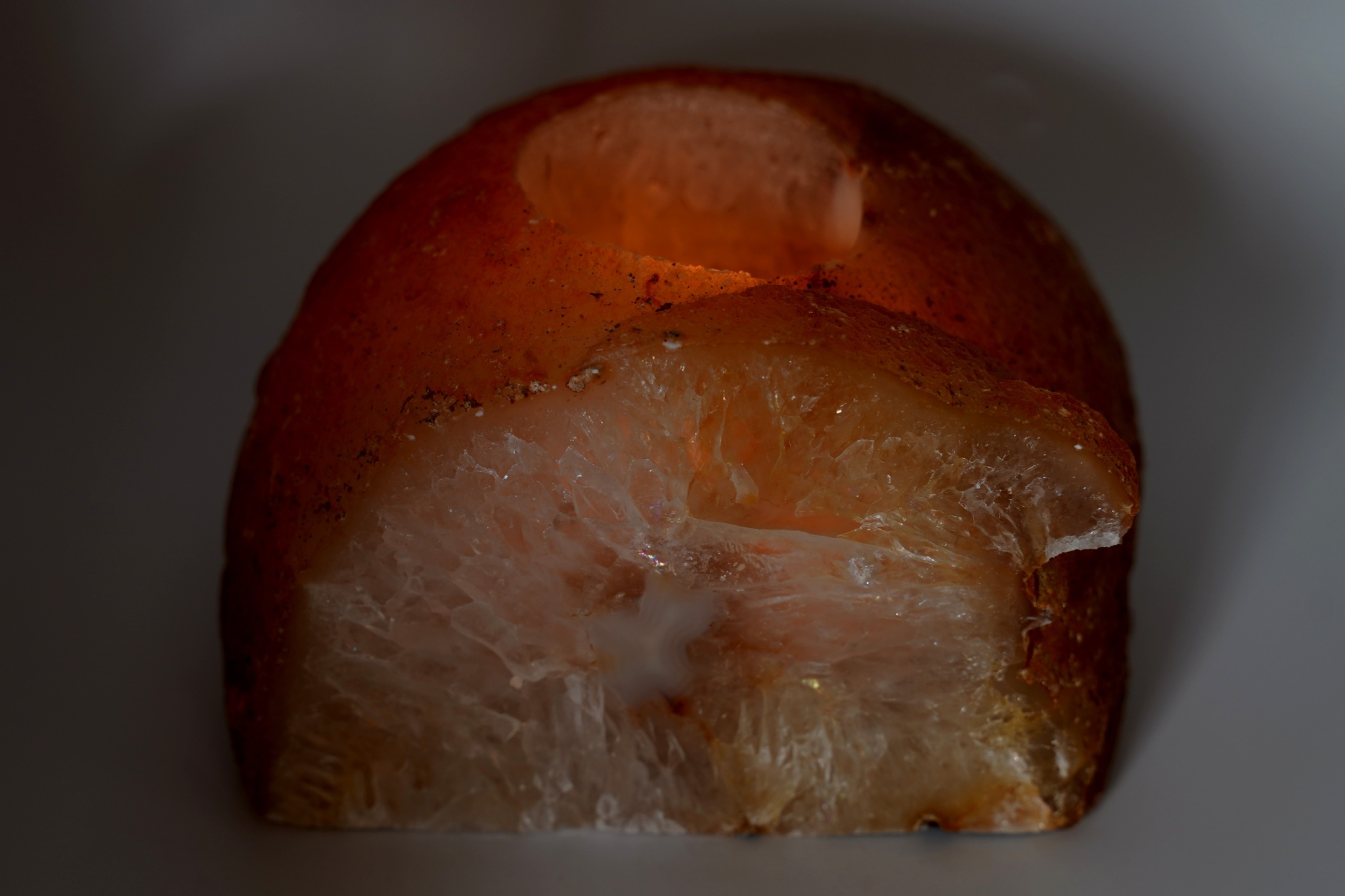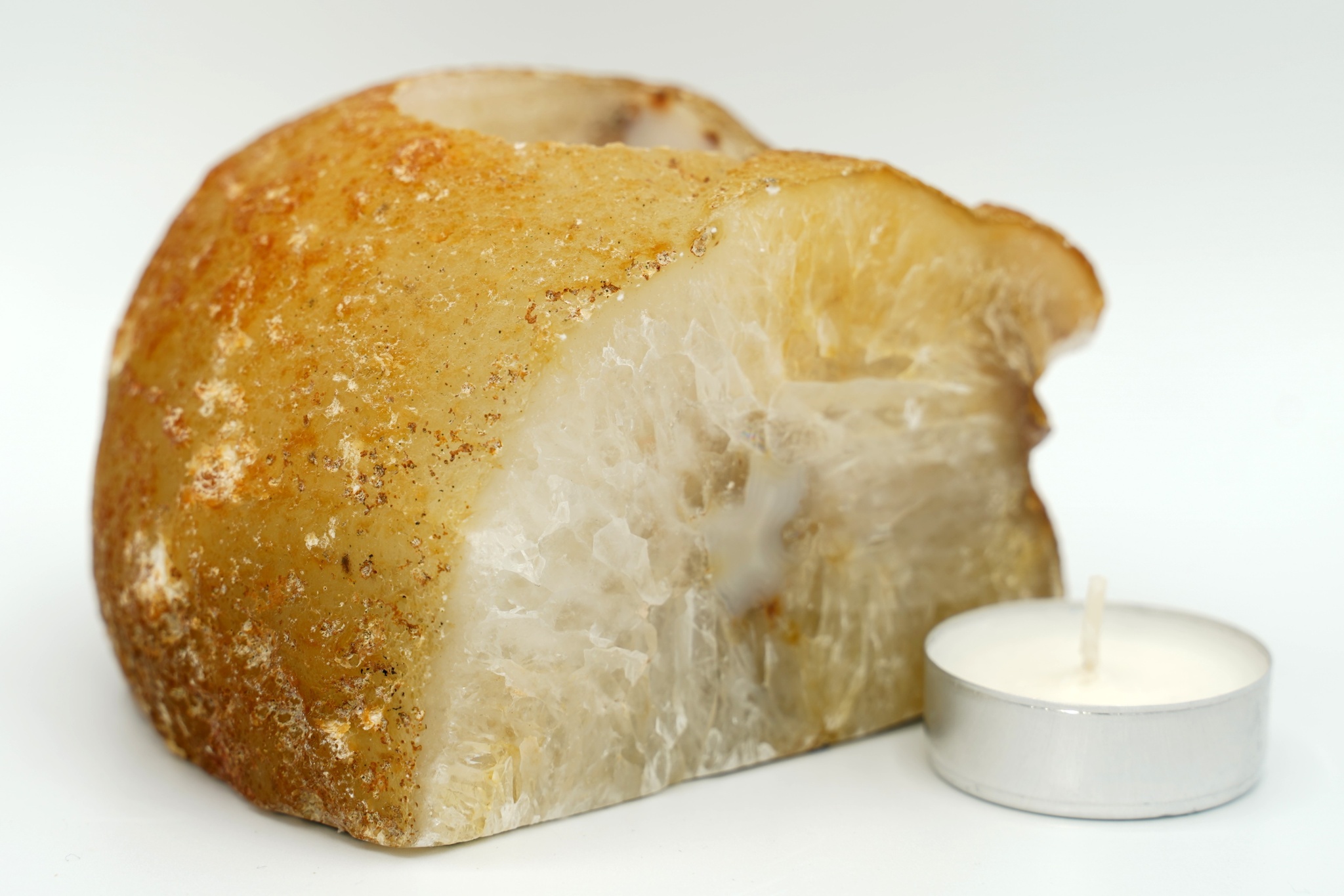 Světlo z hořící svíčky dává vyniknout originální achátové kresbě.