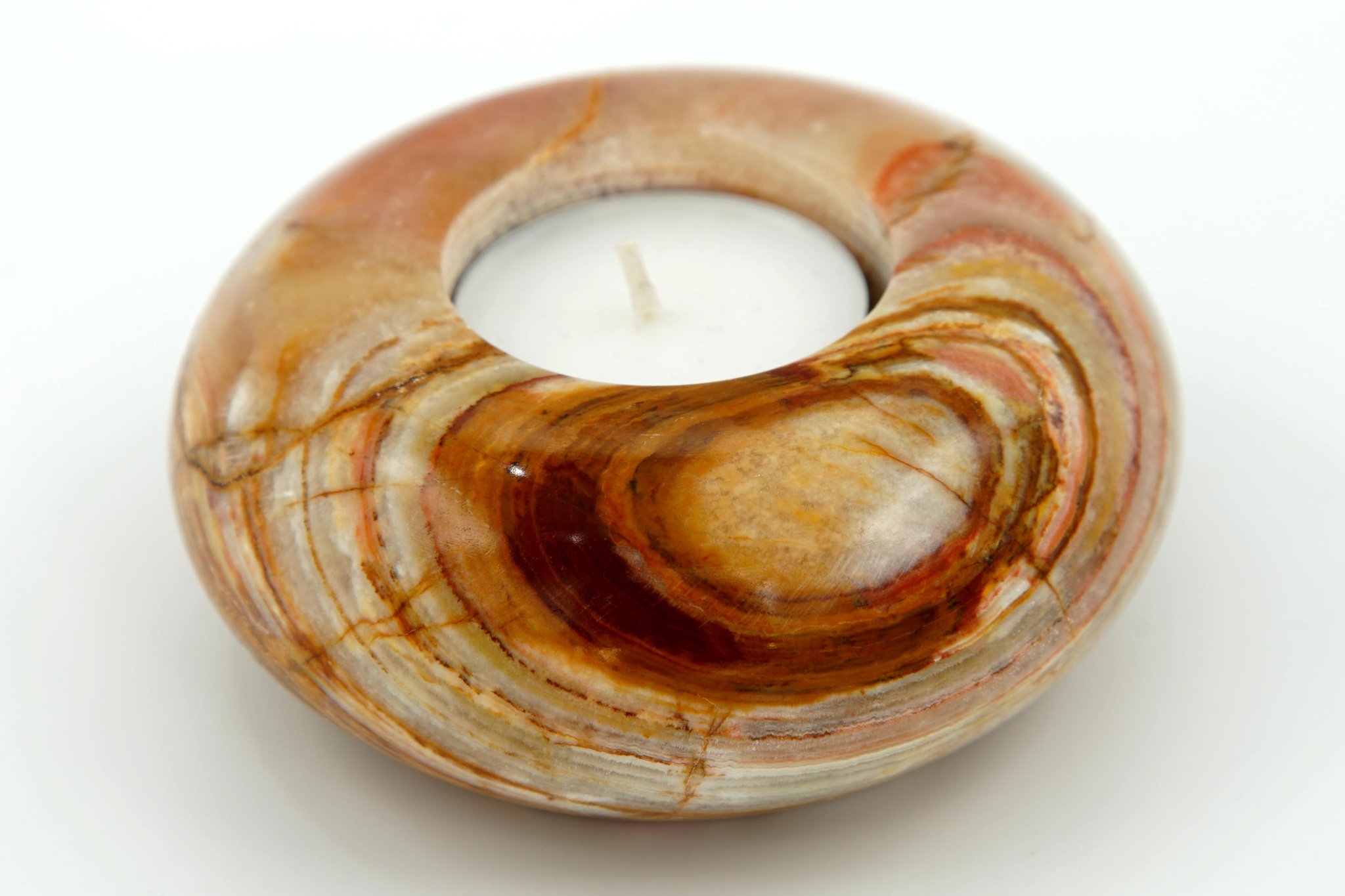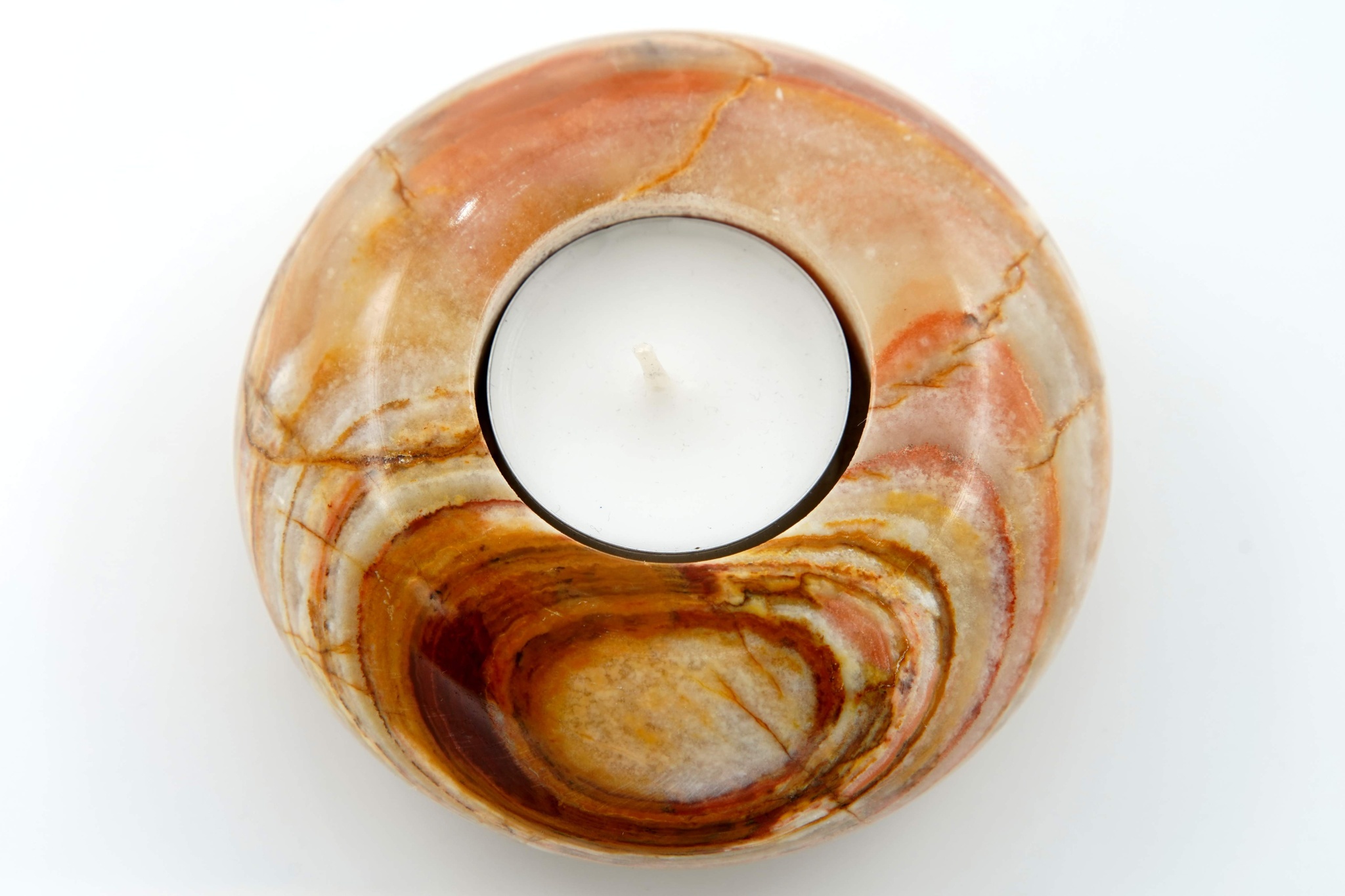 Svícen vybroušený z pákistánského aragonitu na čajovou svíčku.