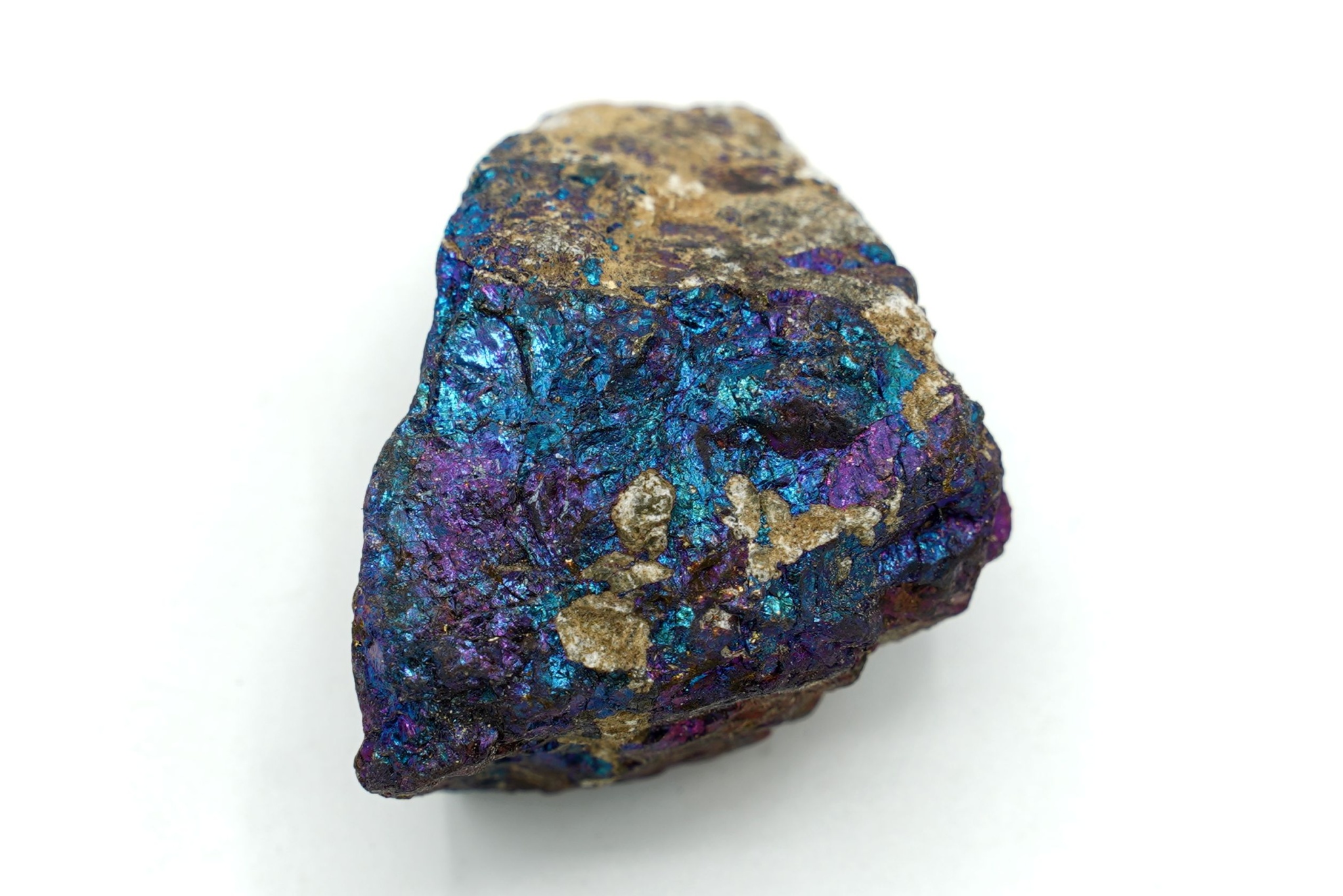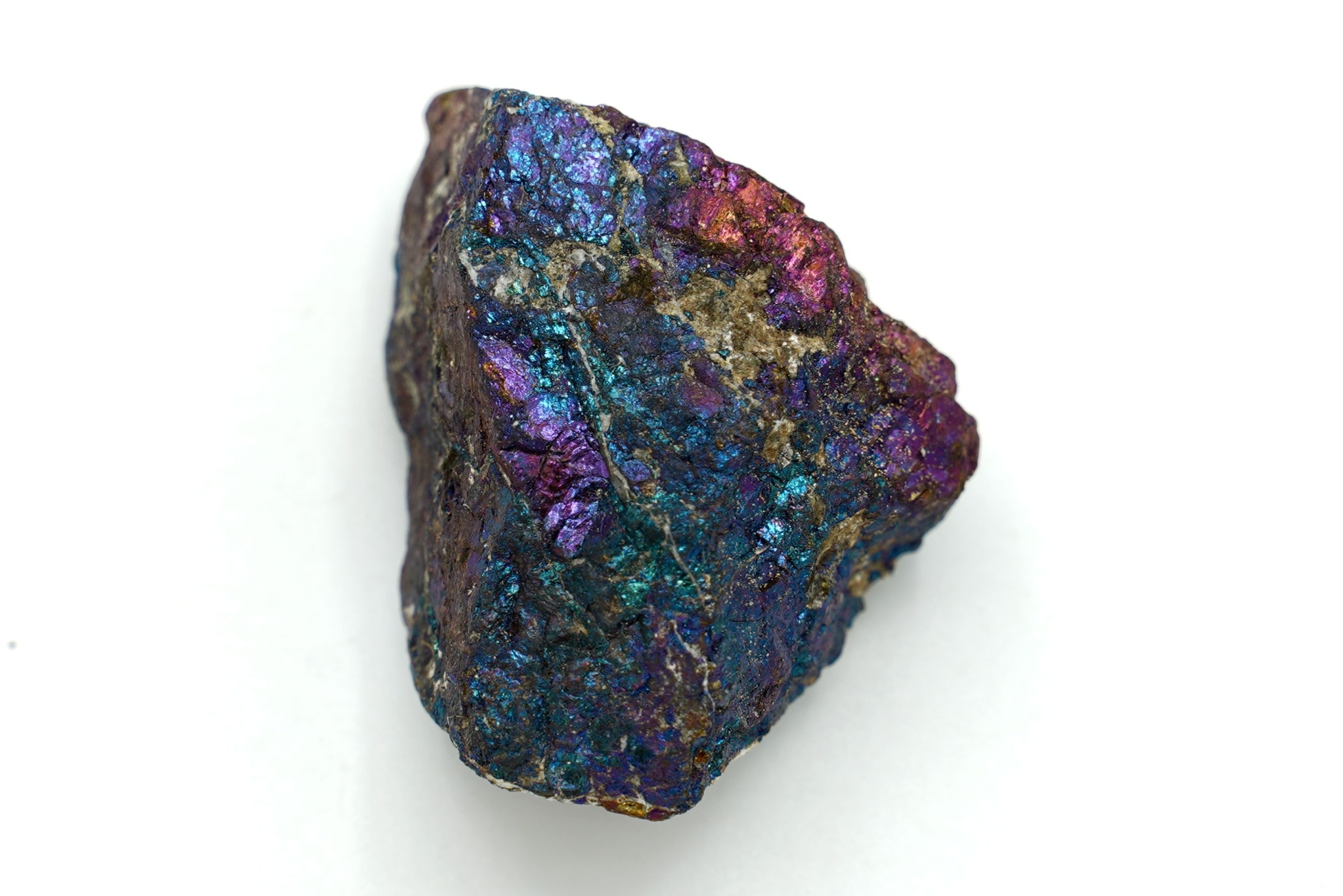 Jedná se o mimerál obsahující měď železo a síru, agregát má pestrou škálu barev (od mosazně žluté a zlato-žluté, po kovově modro-fialovou). Barva je dána stálou oxidací nebo také výskytem dalších minerálů.