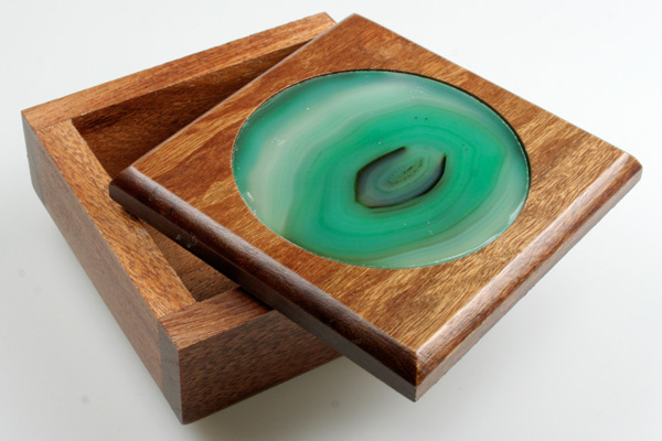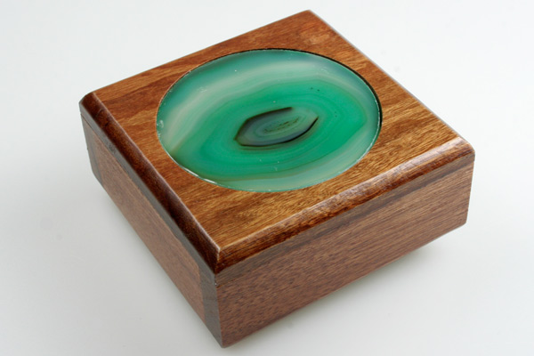 Dřevěná dóza se zapuštěným lěštěným achátem ve víku.