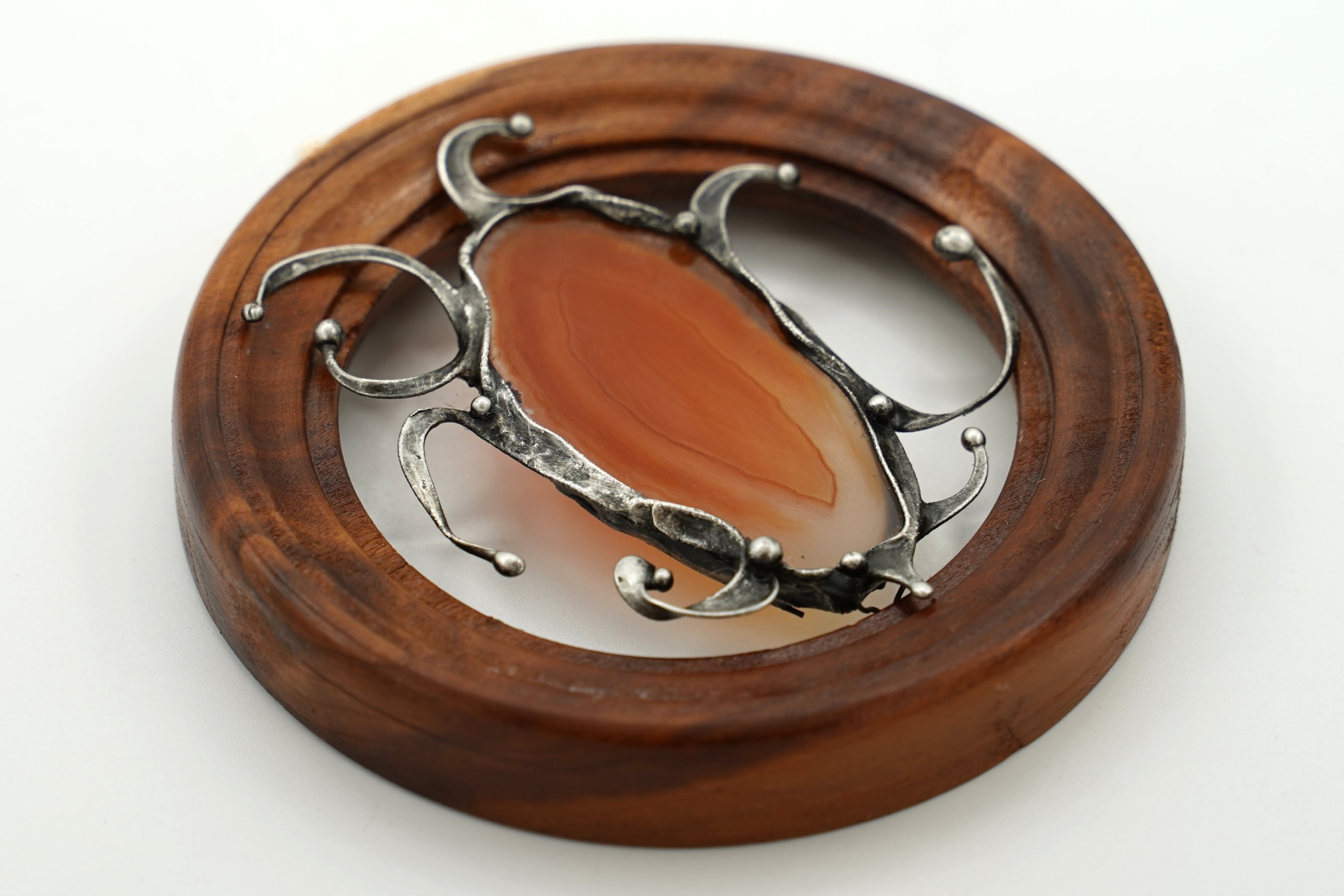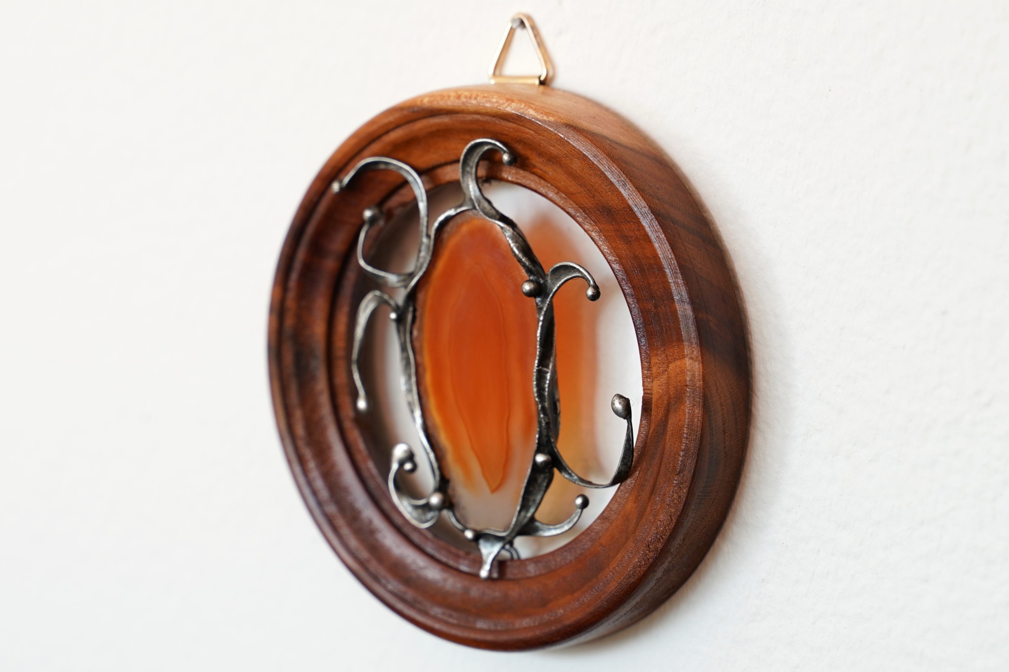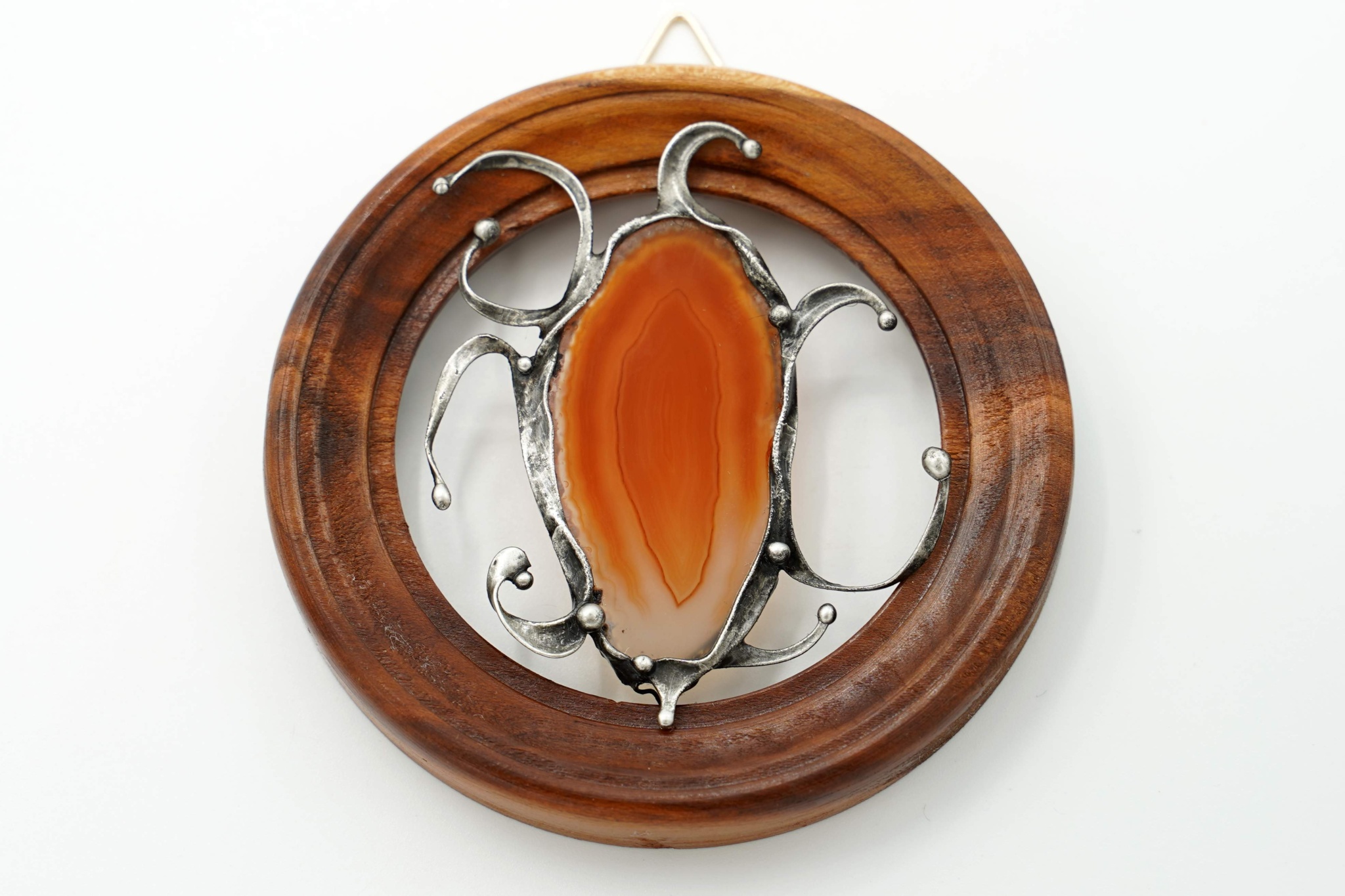 Dekorace - obrázek z achátového plátku, drátu a bezolovnatého cínu. Usazeno v dřevěném rámečku o průměru cca 8,9 cm. Patinováno, leštěno, ošetřeno antioxidantem. Velikost achátu přibližně 5,3 cm.