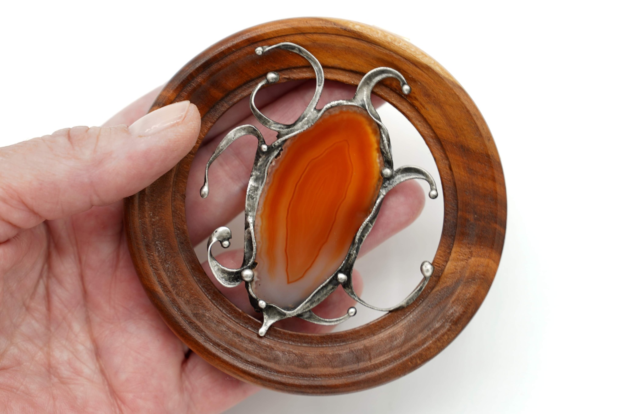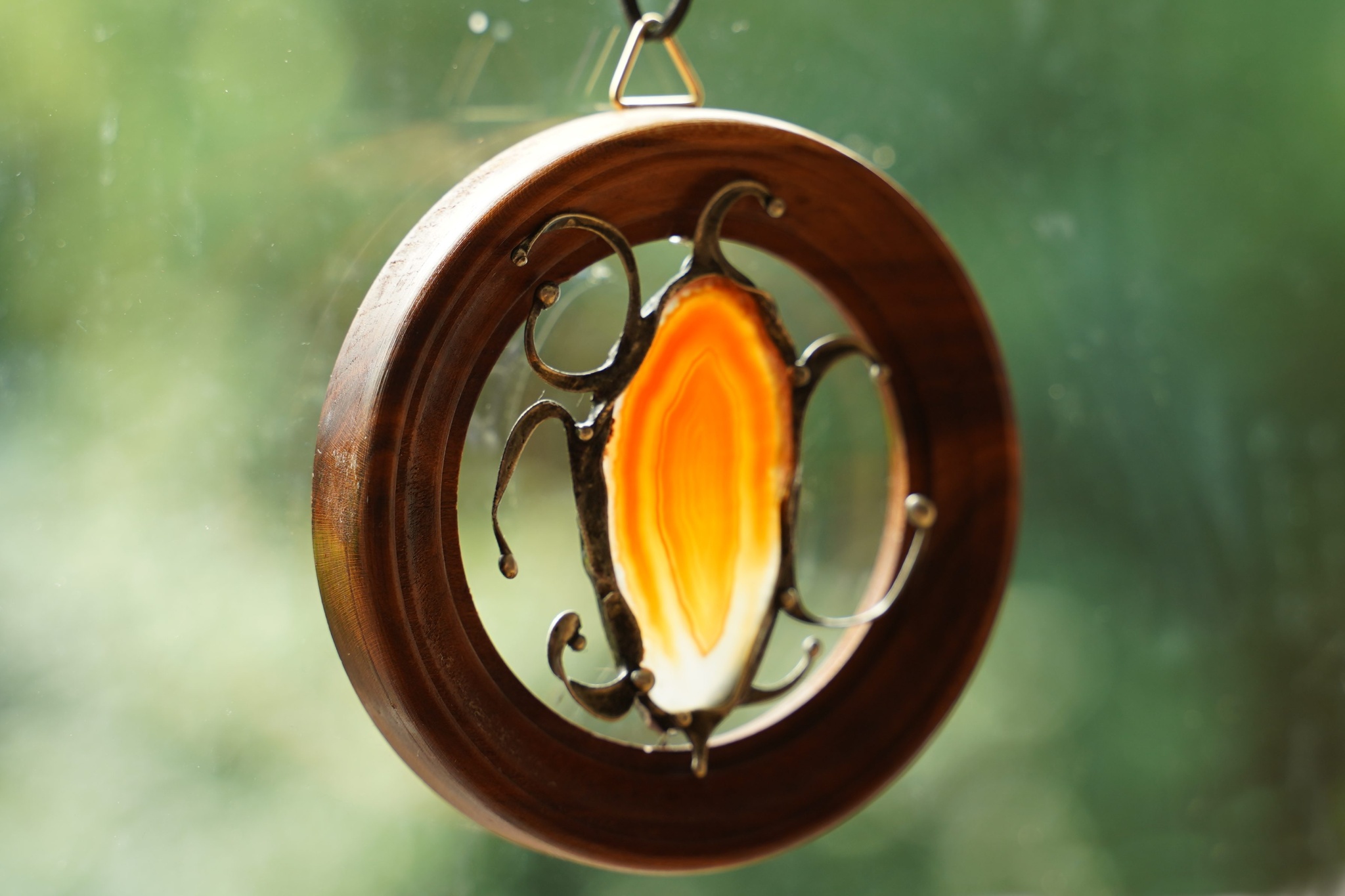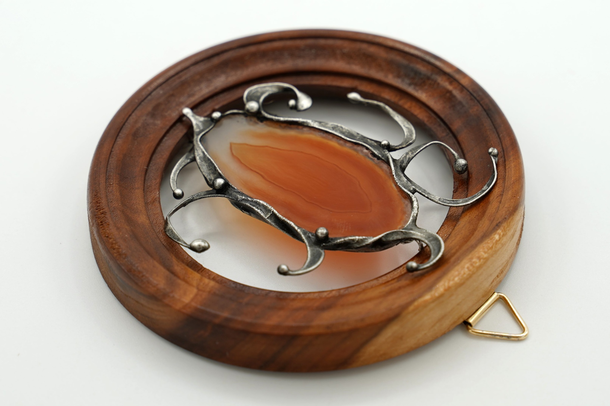 Dekorace - obrázek z achátového plátku, drátu a bezolovnatého cínu. Usazeno v dřevěném rámečku o průměru cca 8,9 cm. Patinováno, leštěno, ošetřeno antioxidantem. Velikost achátu přibližně 5,3 cm.