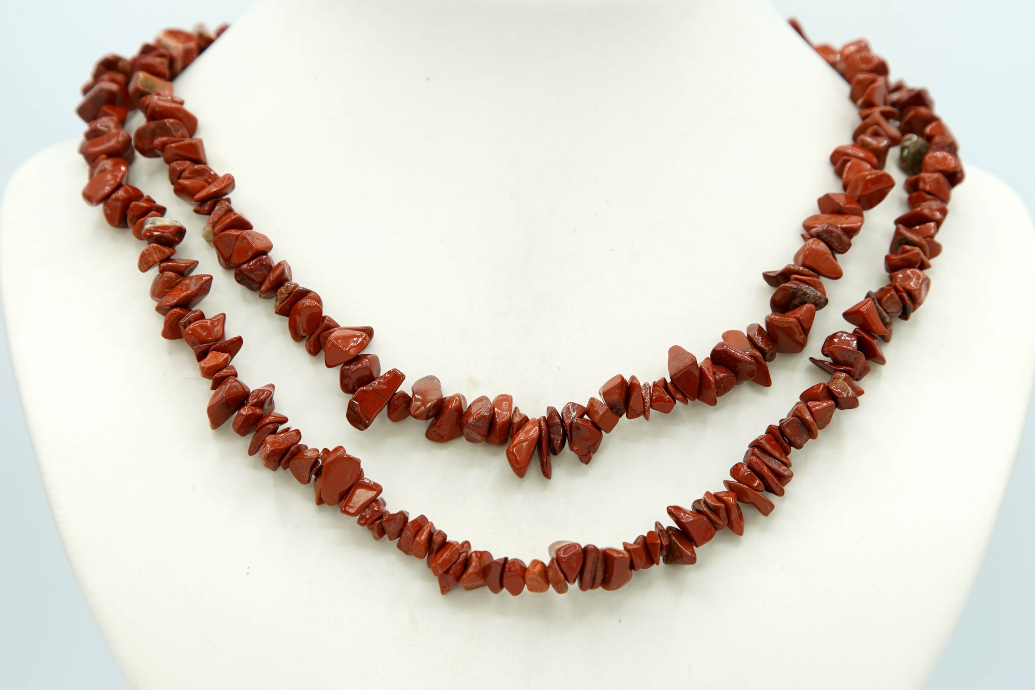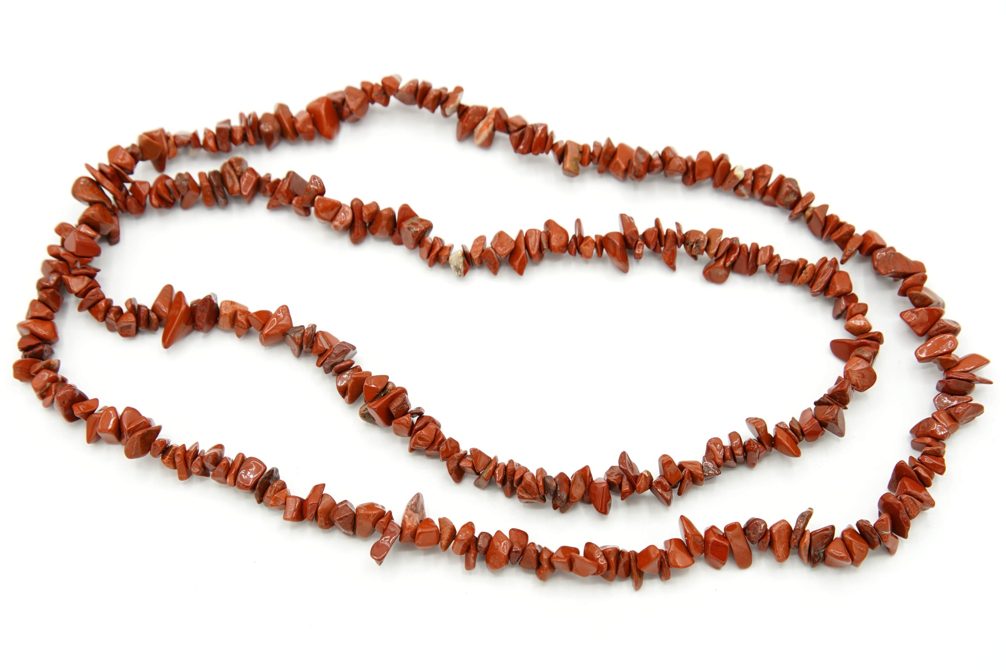 Náhrdelník z drobných, nepravidelných, hladce opracovaných zrn červeného jaspisu délky přibližně 90 cm.