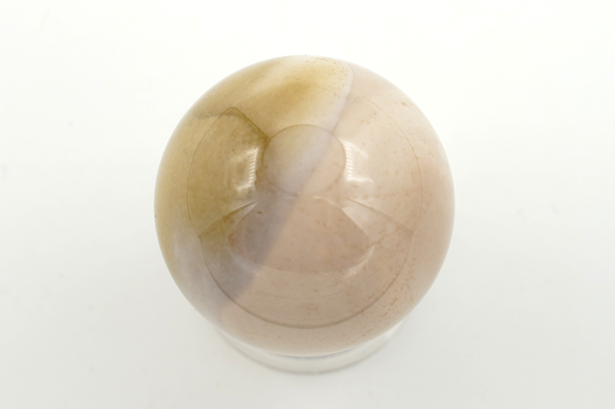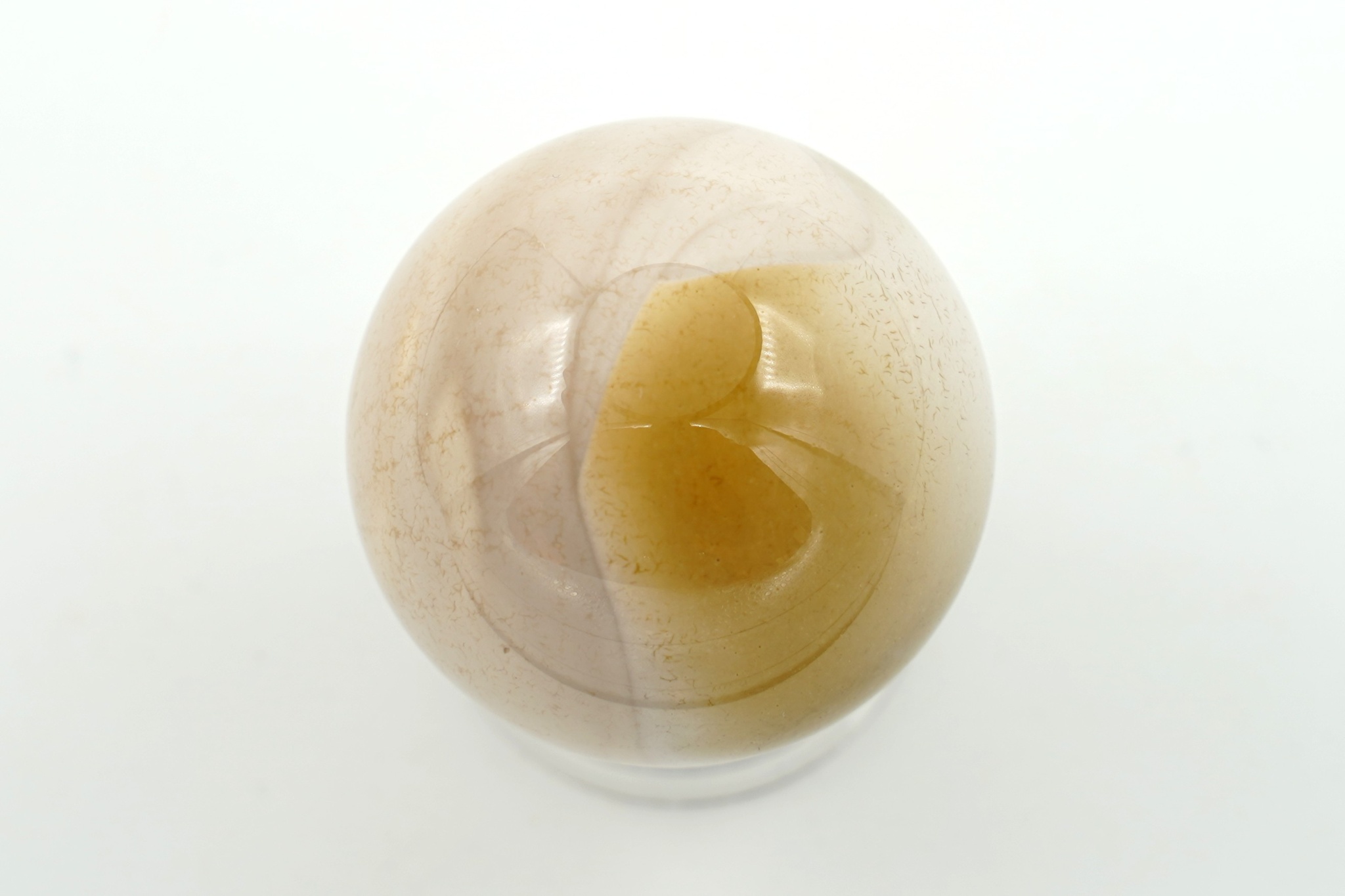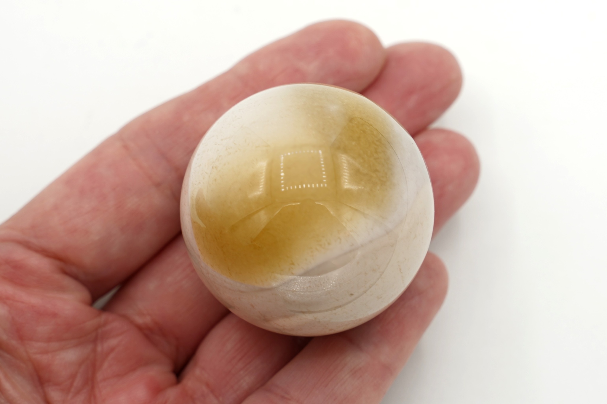 Koule broušená a leštěná z jaspisu mokait. Průměr 3,85 cm, hmotnost 74 g.