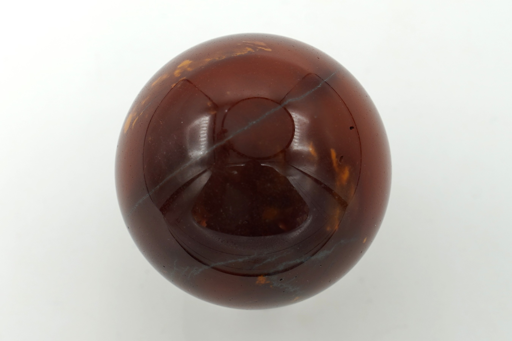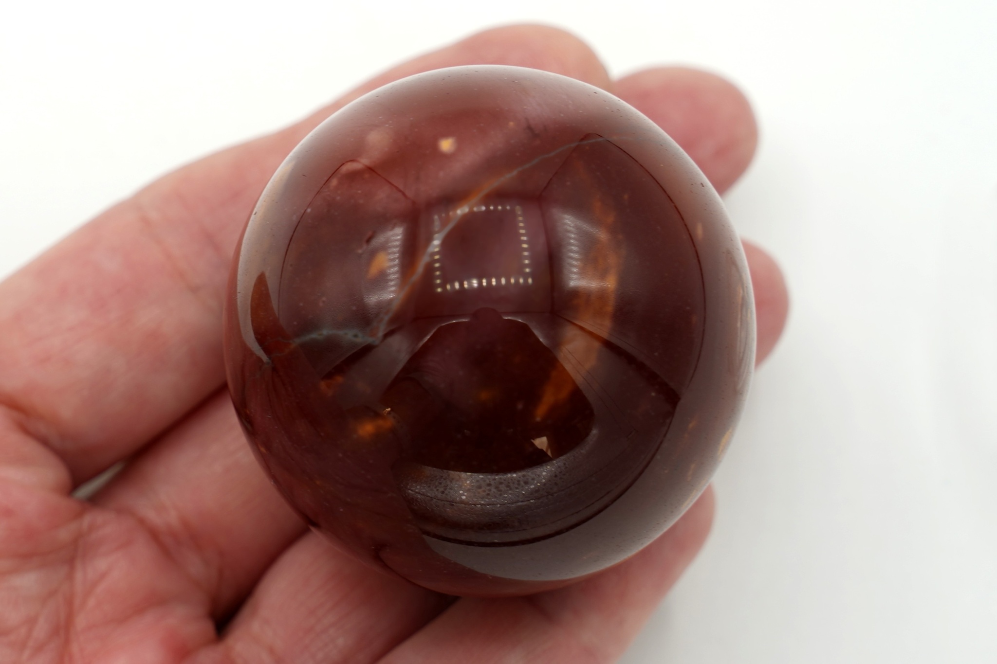Koule broušená a leštěná z jaspisu mokait. Průměr 4,55 cm, hmotnost 128 g.