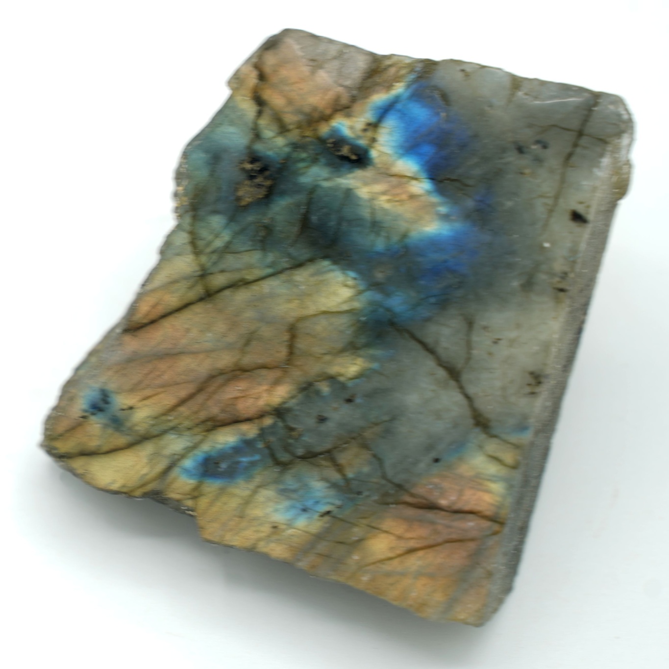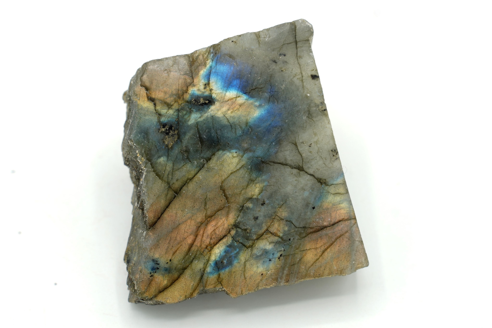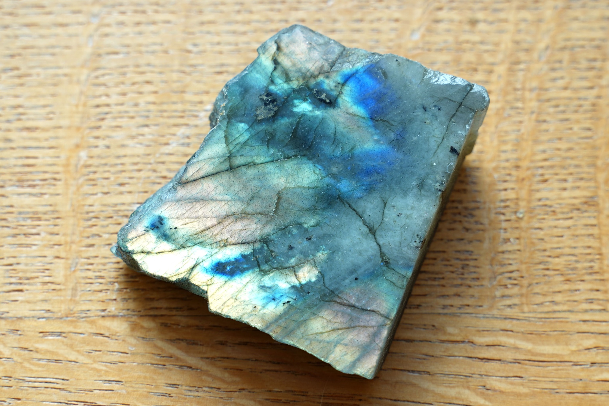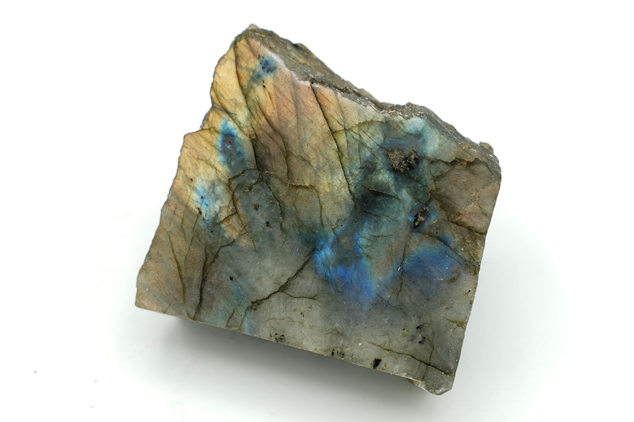 Surový kus labradoritu, který byl seříznutý a z jedné strany vyleštěn.