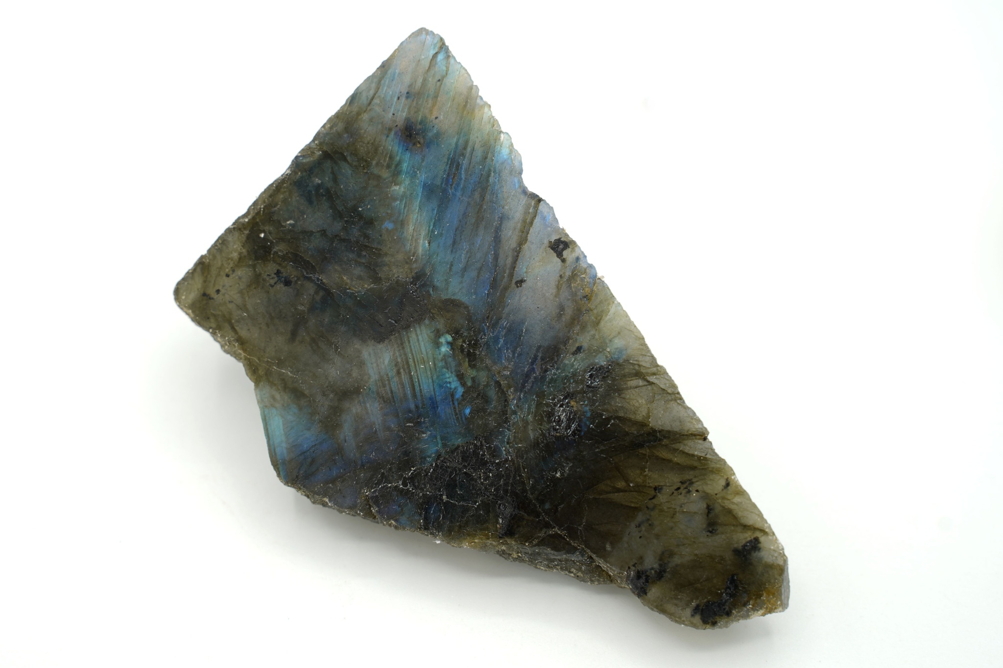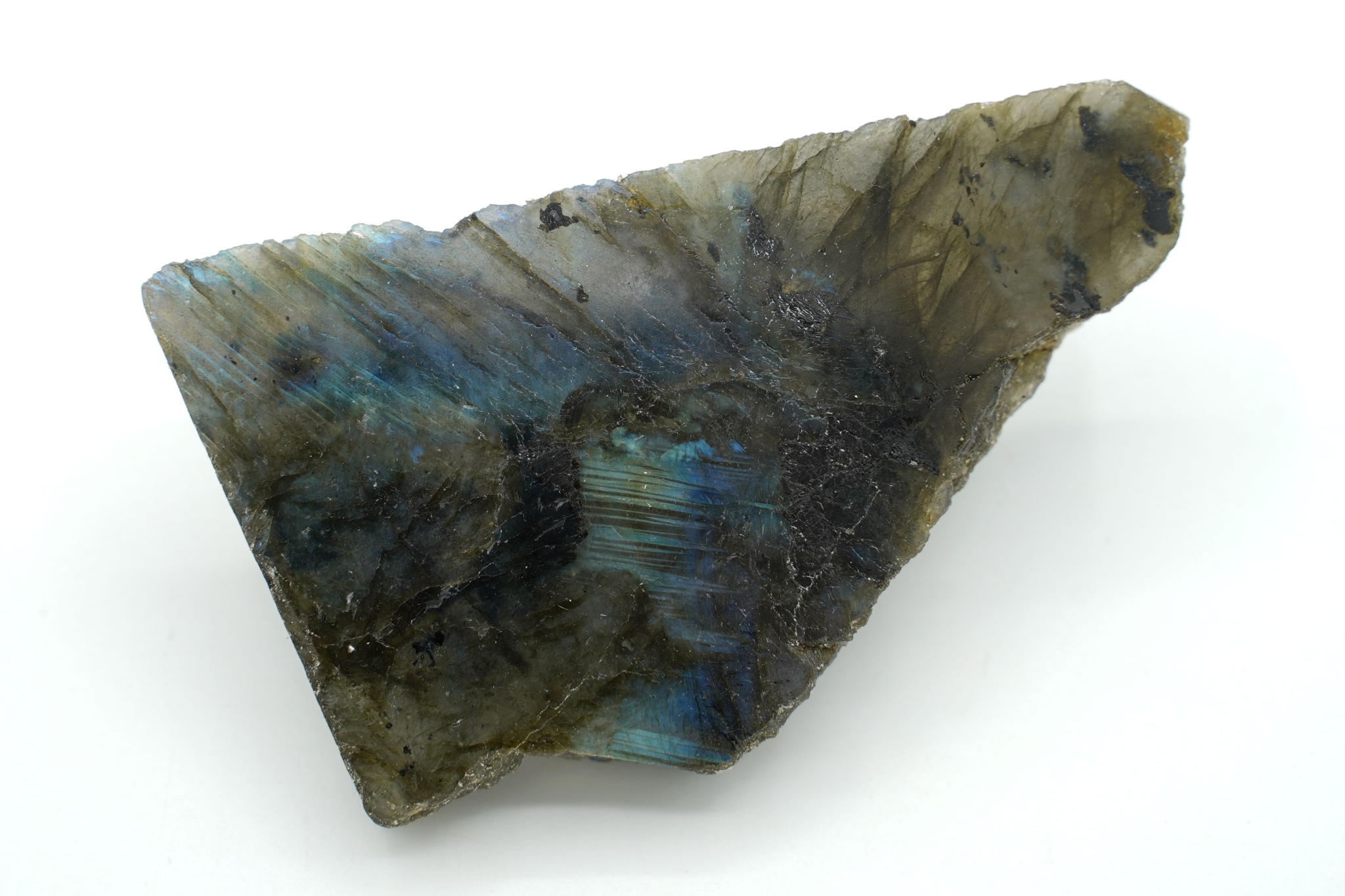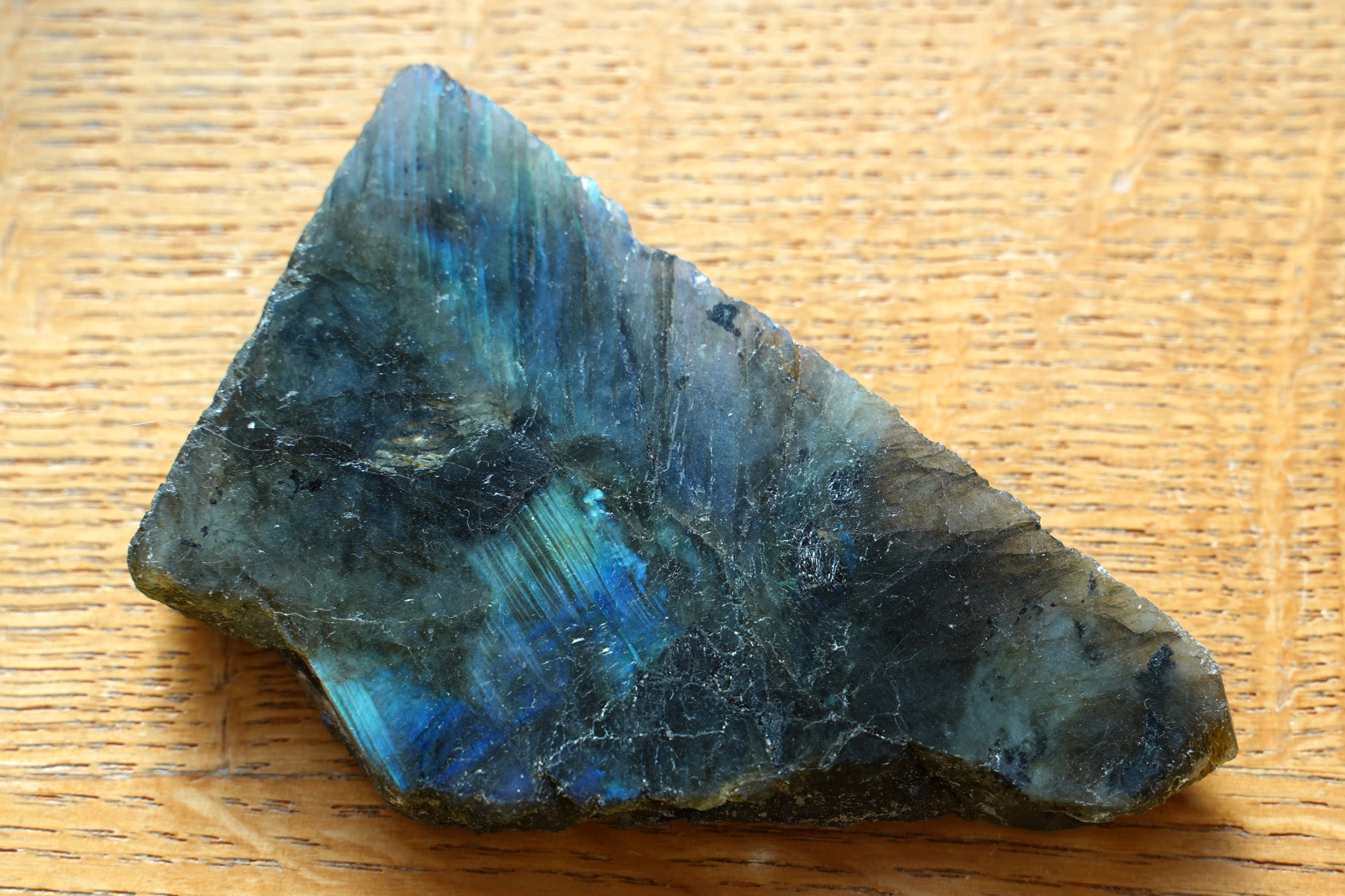 Surový kus labradoritu, který byl seříznutý a z jedné strany vyleštěn.