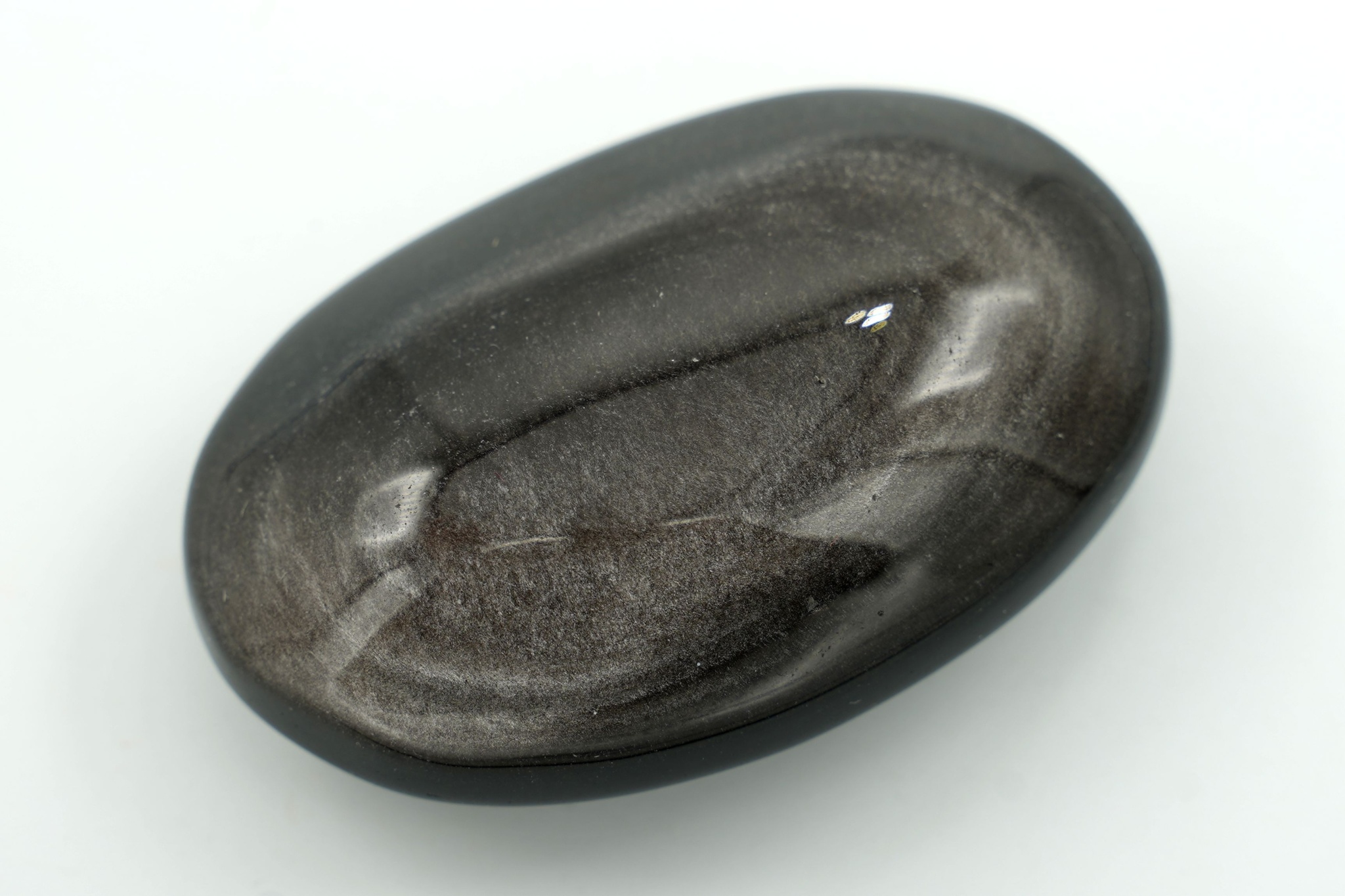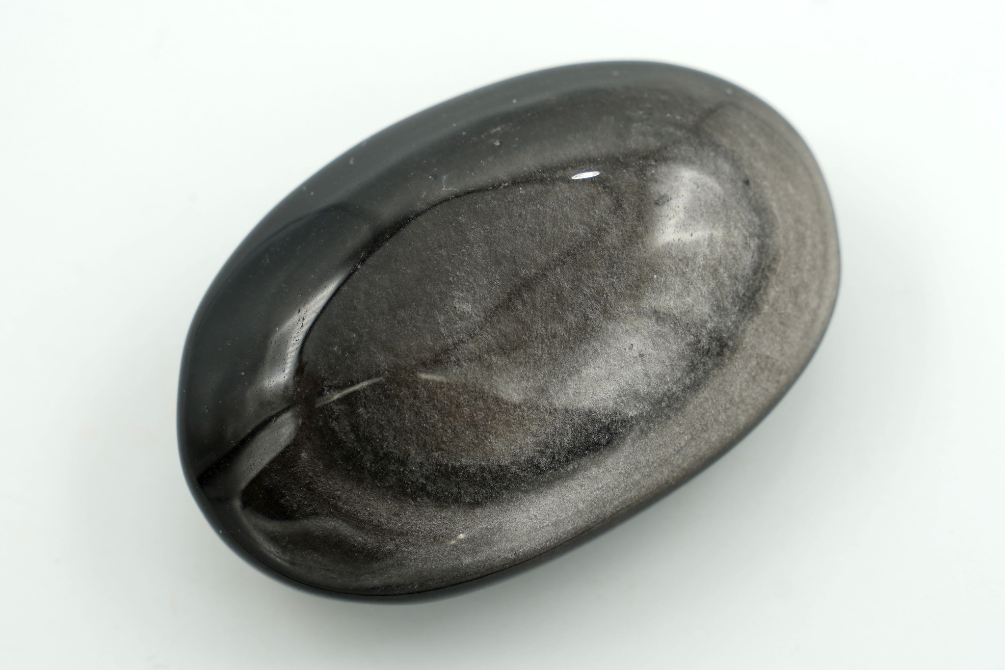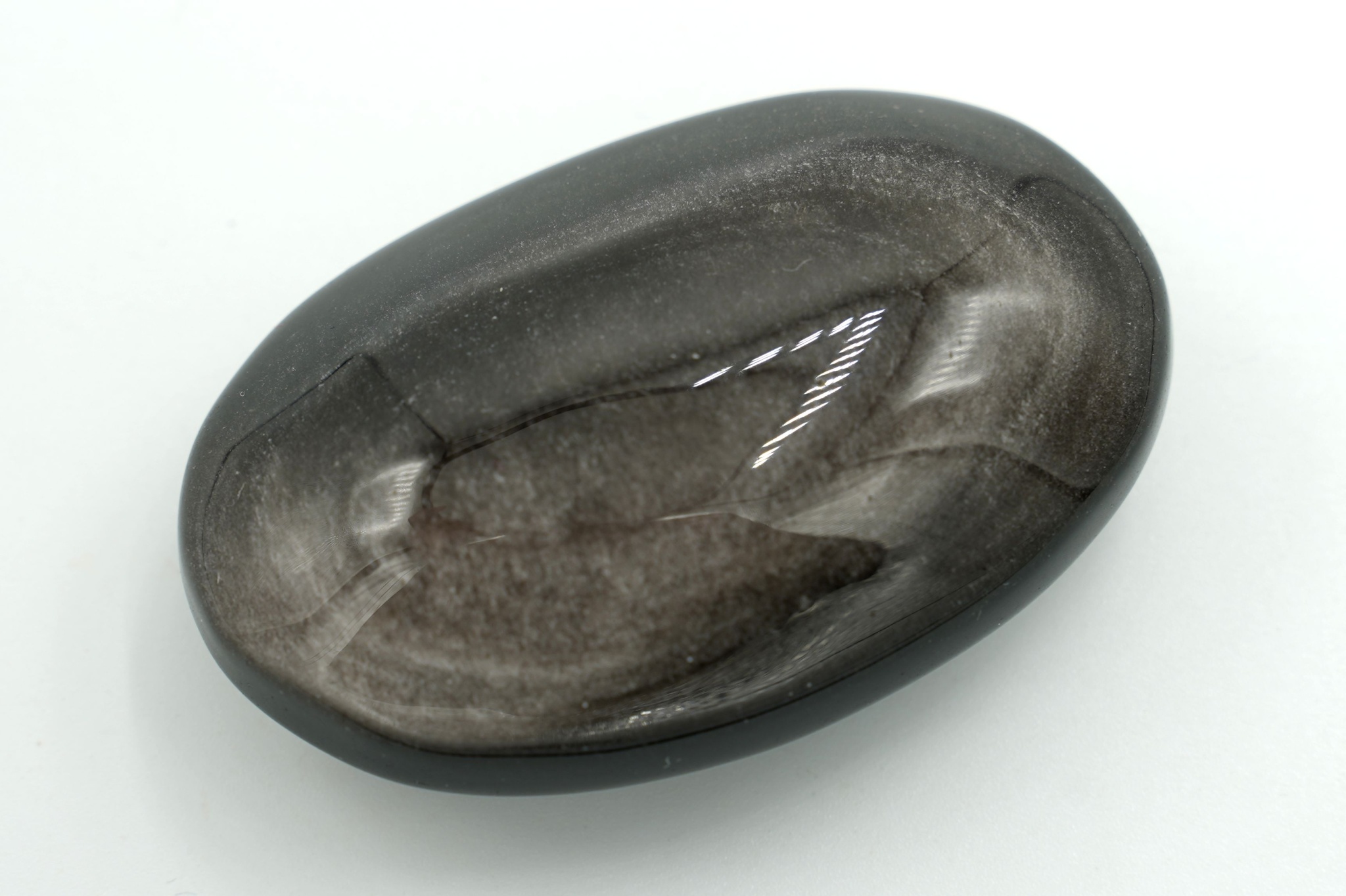 Obsidián stříbrný mýdlo - hmatka, velikost 6,5 x 4,2, tloušťka 2,4 cm.