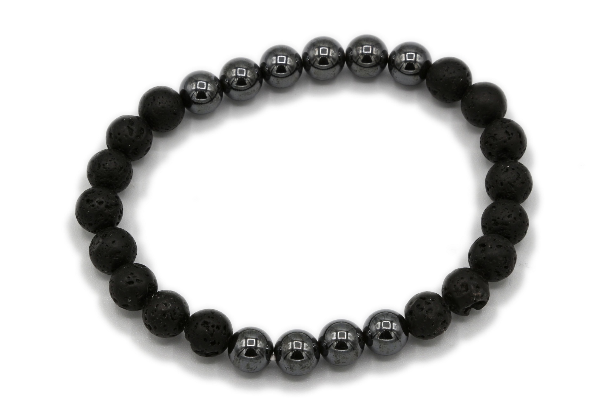 Náramek z hladkých matných kuliček onyxu, doplněno ohnivým achátem a hematitem, o průměru 0,8 cm, které jsou navlečeny na gumičce.