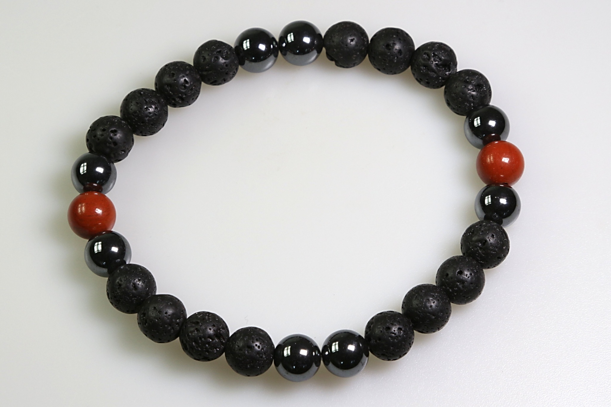 Náramek z kuliček lávy, býčího oka a hematitu o průměru 0,8 cm.