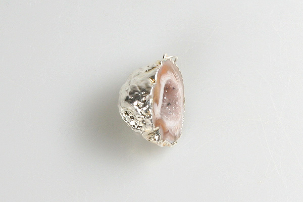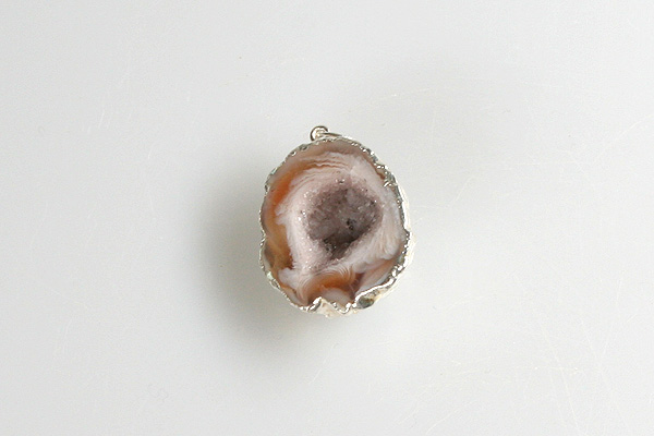 Tenký okraj typický pro peříčkový achát a dutinka vyplněná množstvím křišťálových krystalků.
