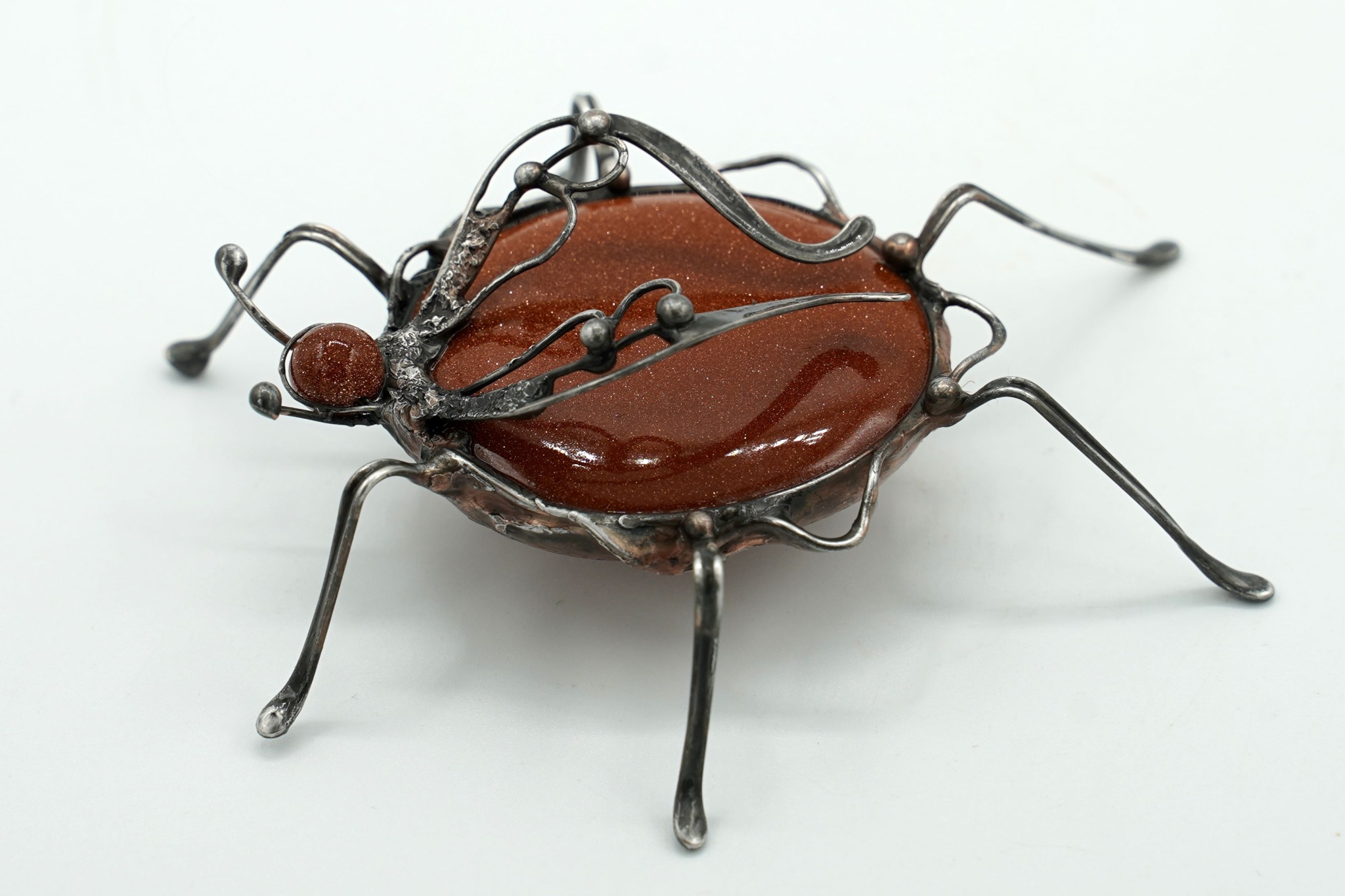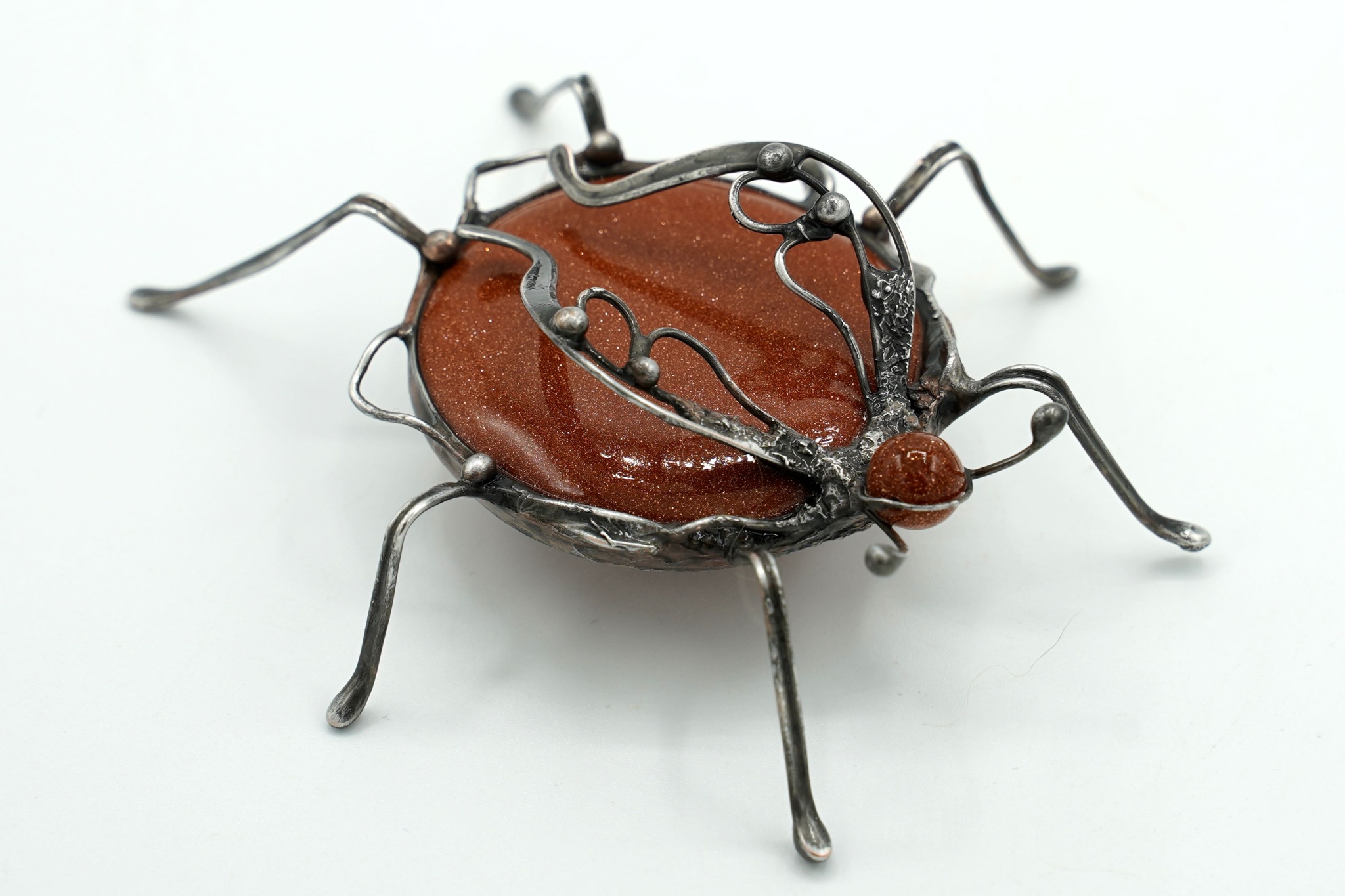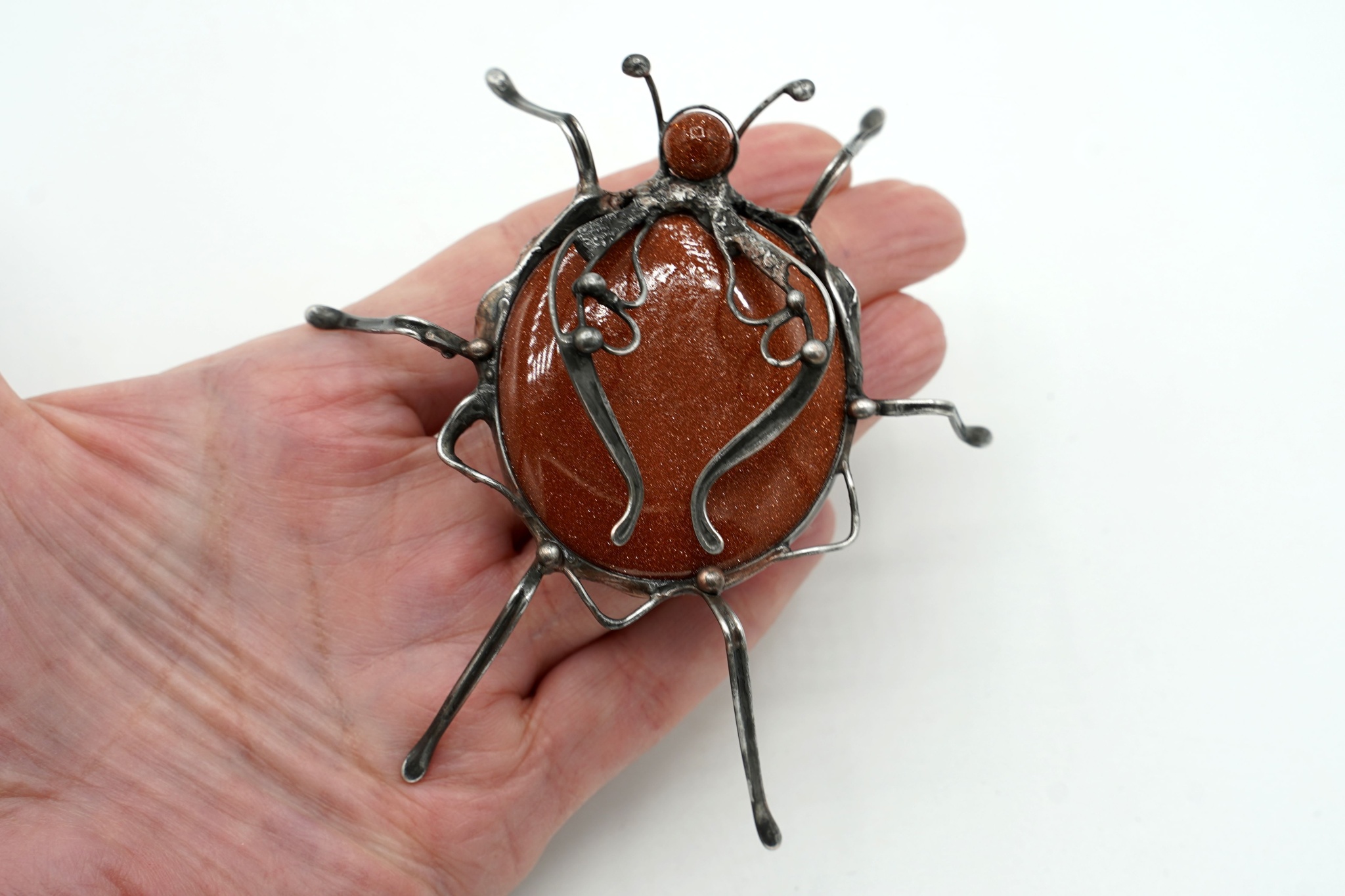 Smůlokaz - Brouček - originální dekorace z plochého valounku zlatého aventurínu (syntetický kámen), drátu a cínu, patinováno, leštěno, ošetřeno antioxidantem. Doplněno aventurínovým korálkem.