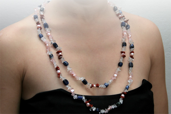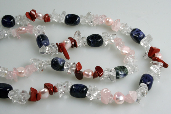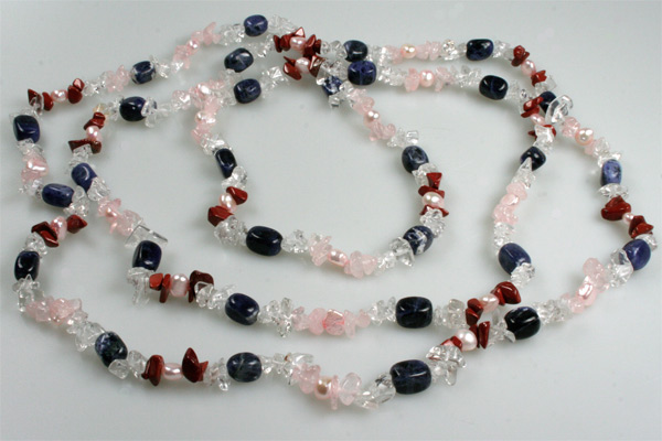 Je složen z pravidelně se střídajících sodalitových oválků 12x9mm, malých perliček a směsi leštěných, nepravidelně sekaných zrn křišťálu, růženínu a červeného jaspisu.