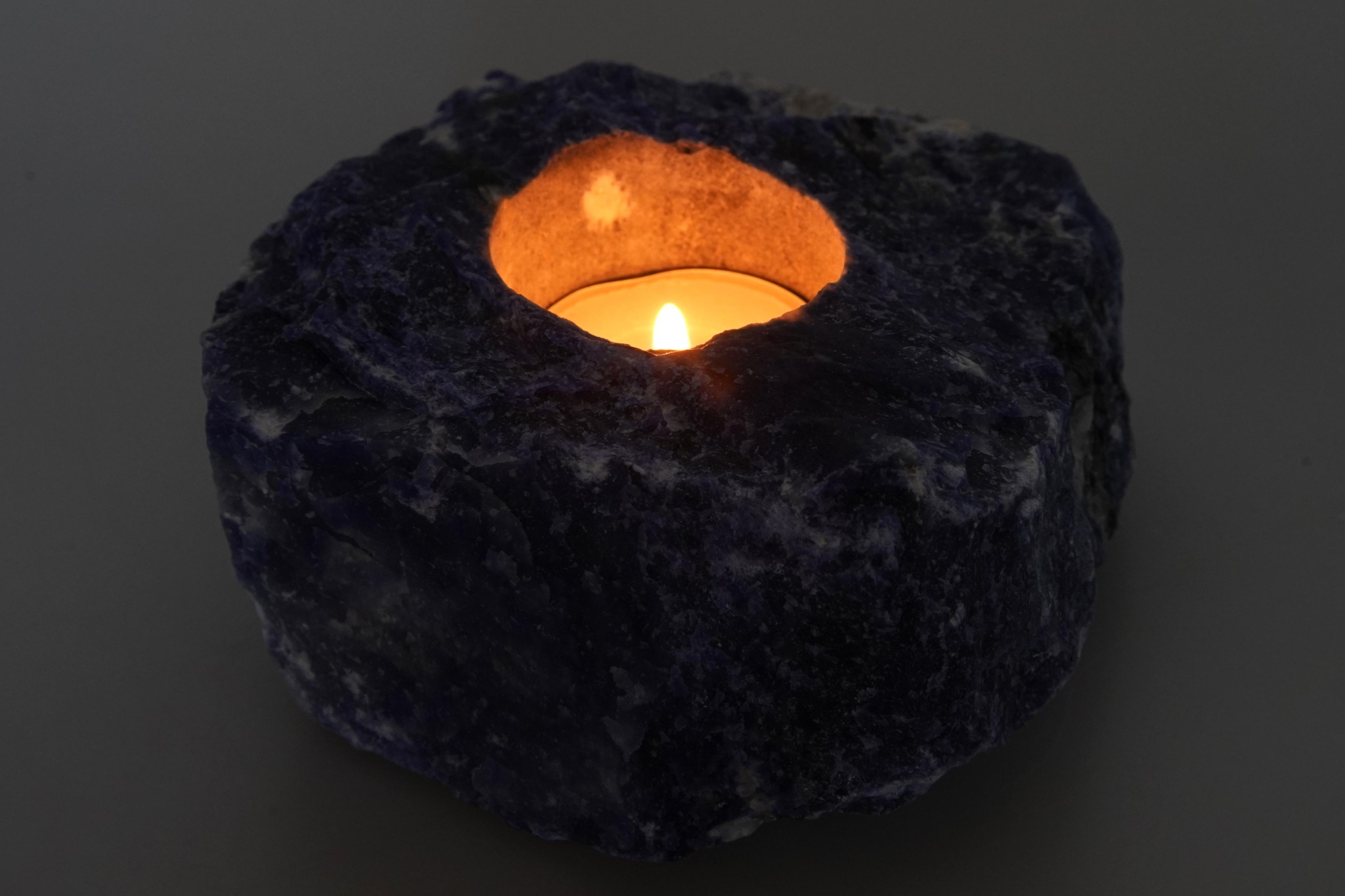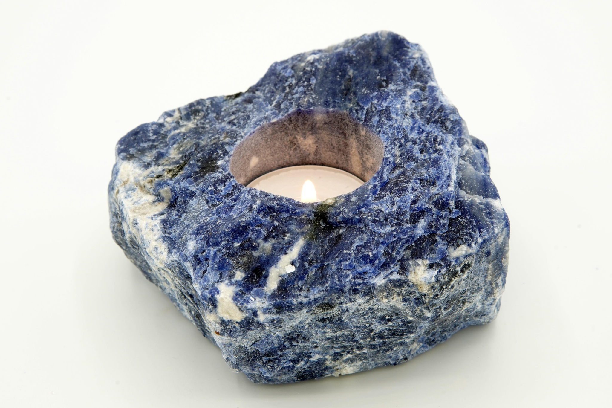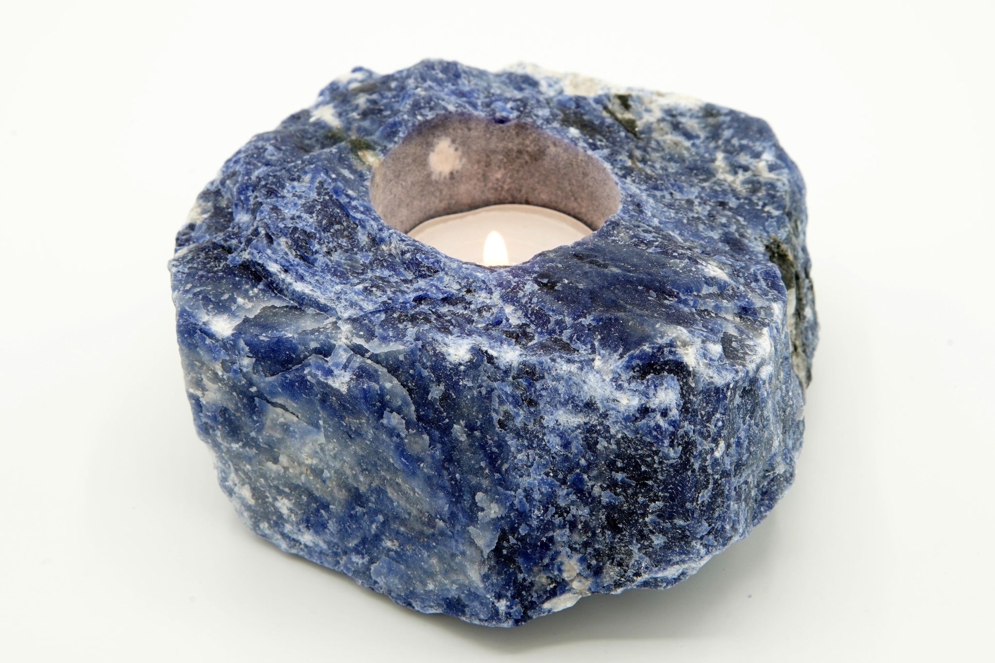 Surový, neleštěný sodalit s vyvrtaným otvorem na čajovou svíčku.