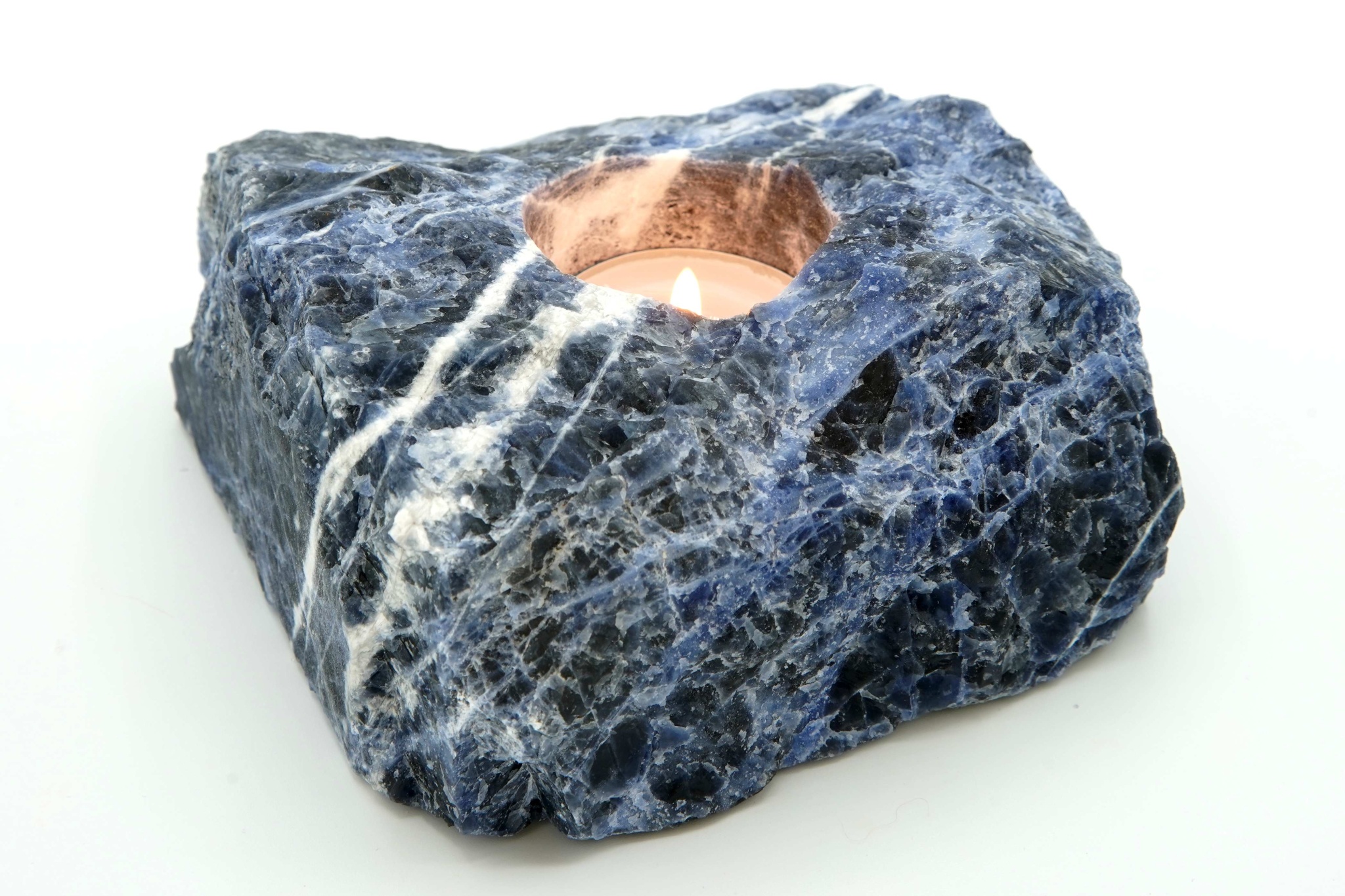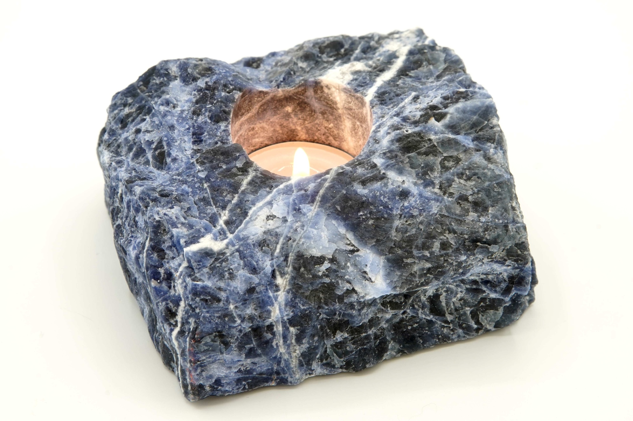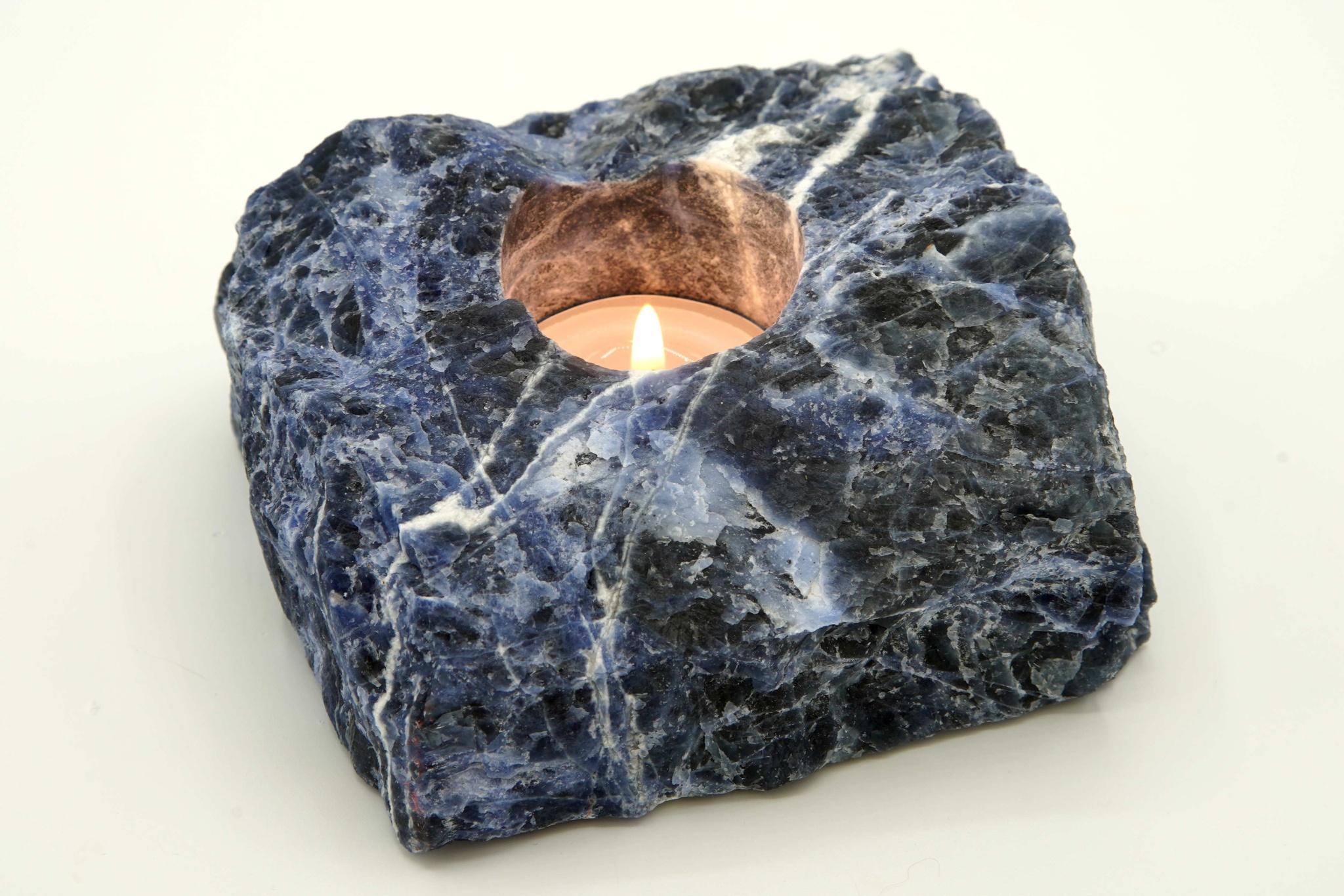 Surový, neleštěný sodalit s vyvrtaným otvorem na čajovou svíčku.