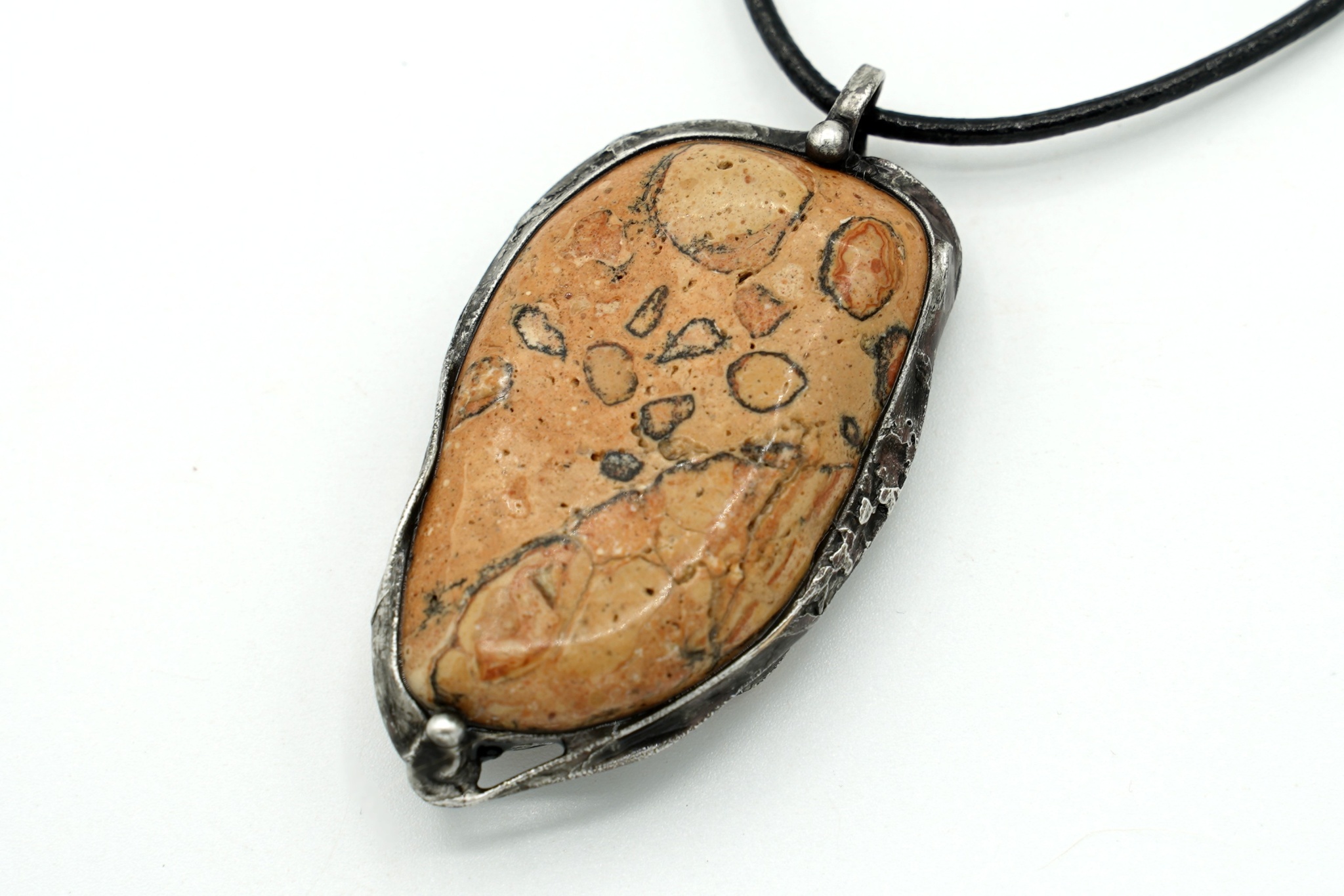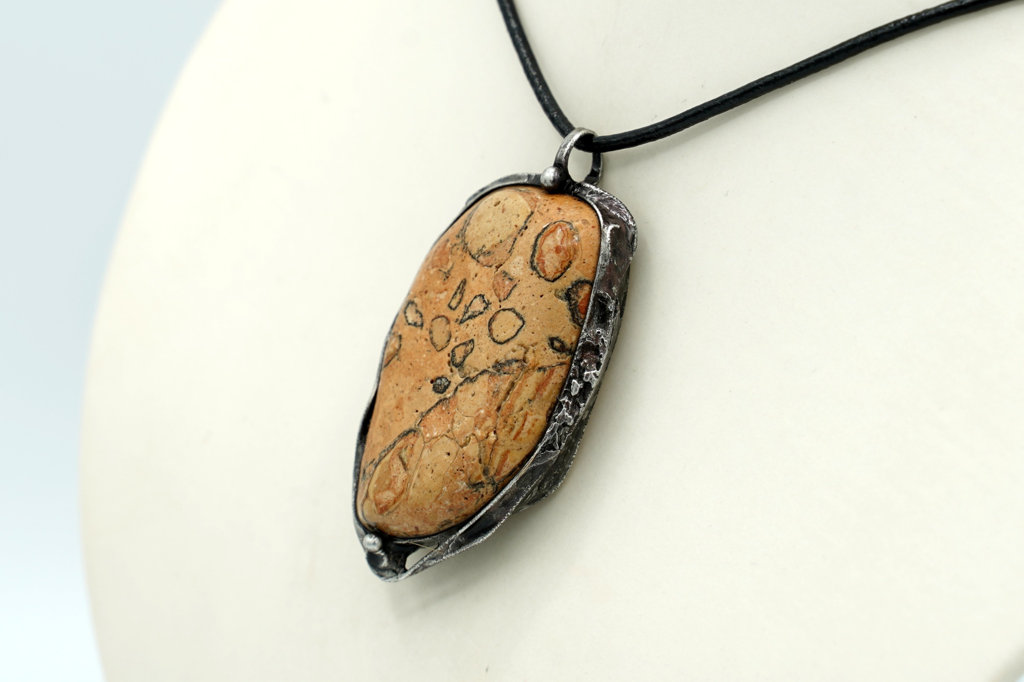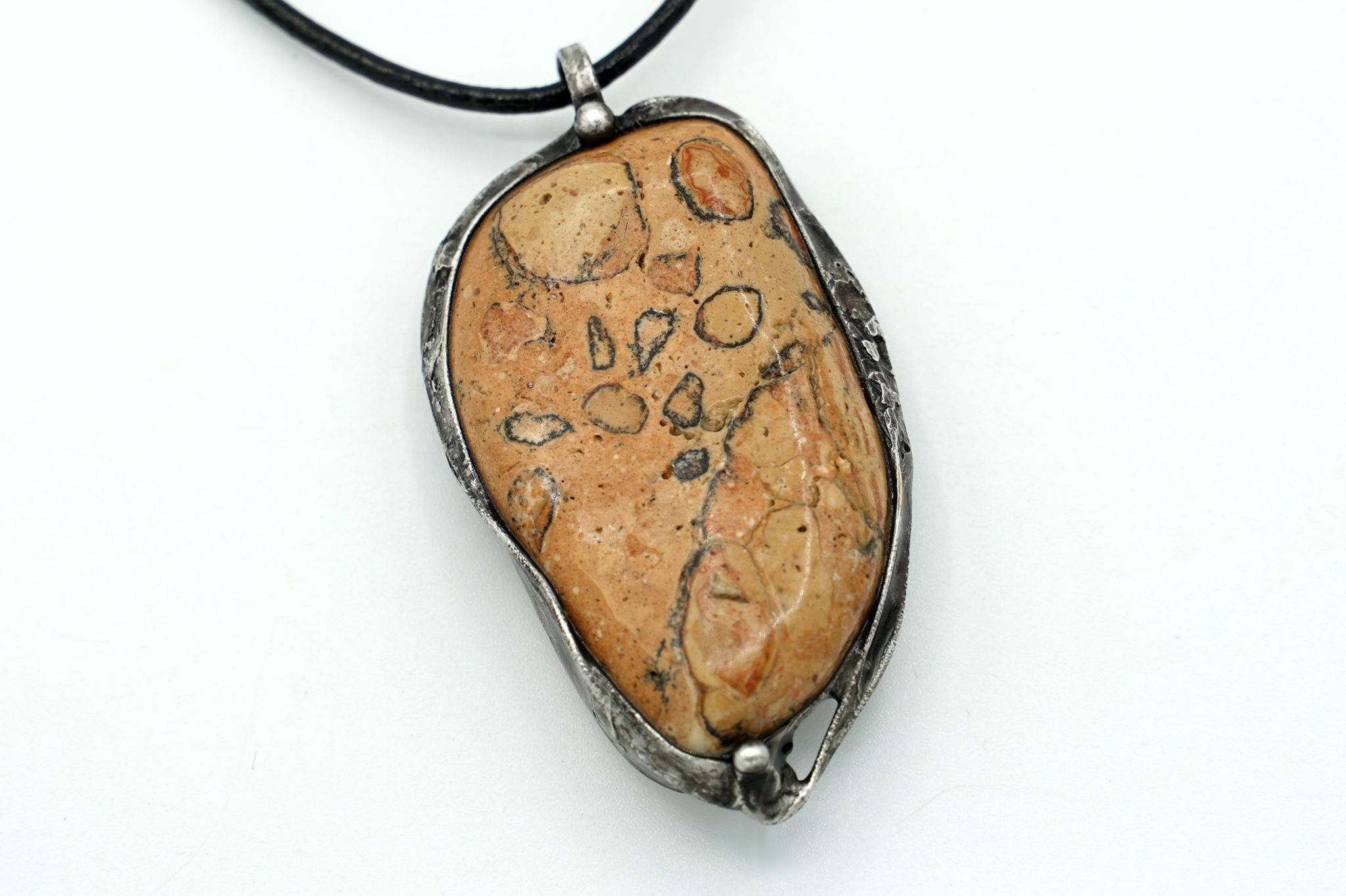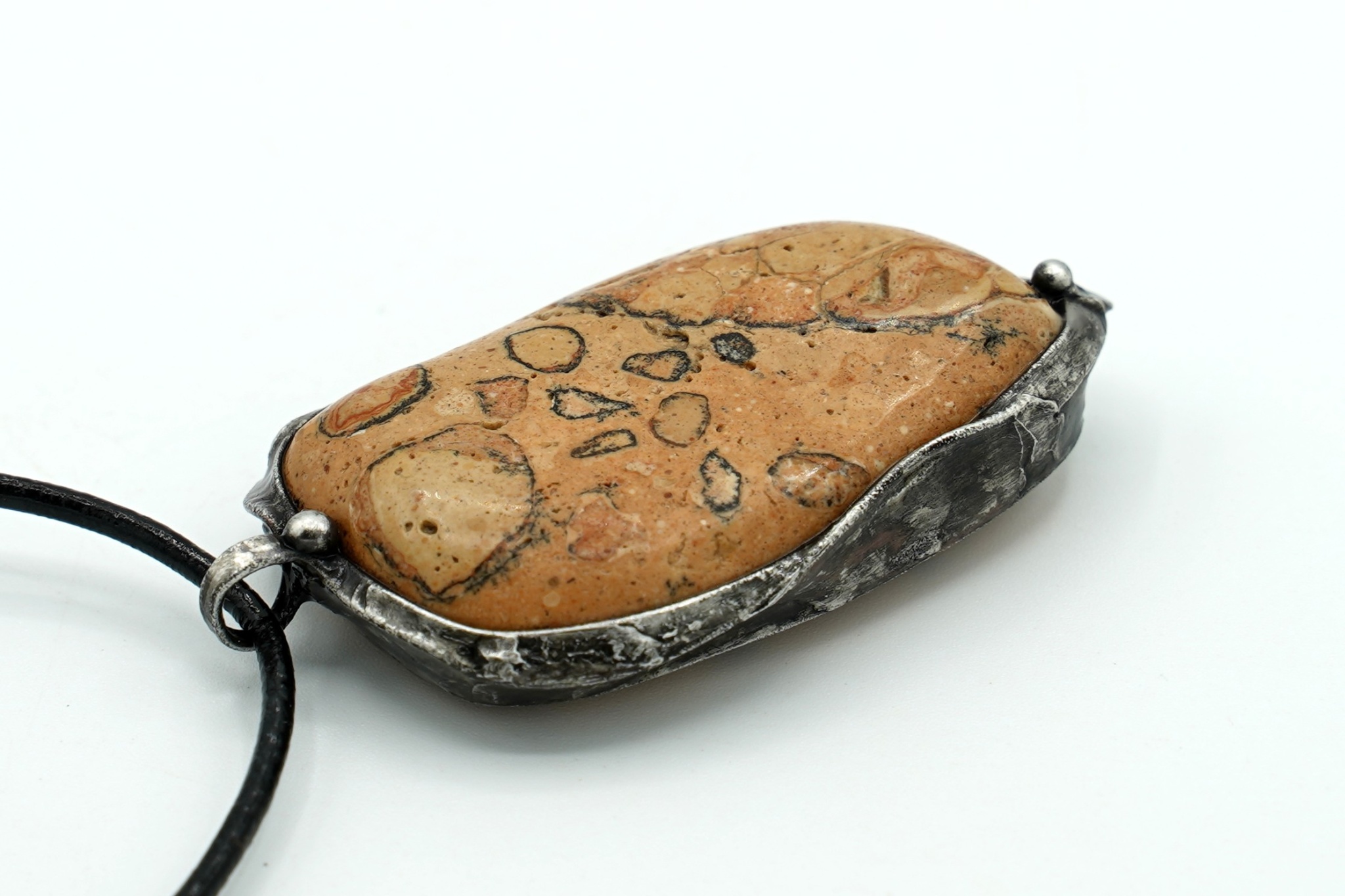 Přívěsek s velmi pěkným valounkem sopečné brekcie (JAR), z bezolovnatého cínu, patinován, ošetřen proti oxidaci.