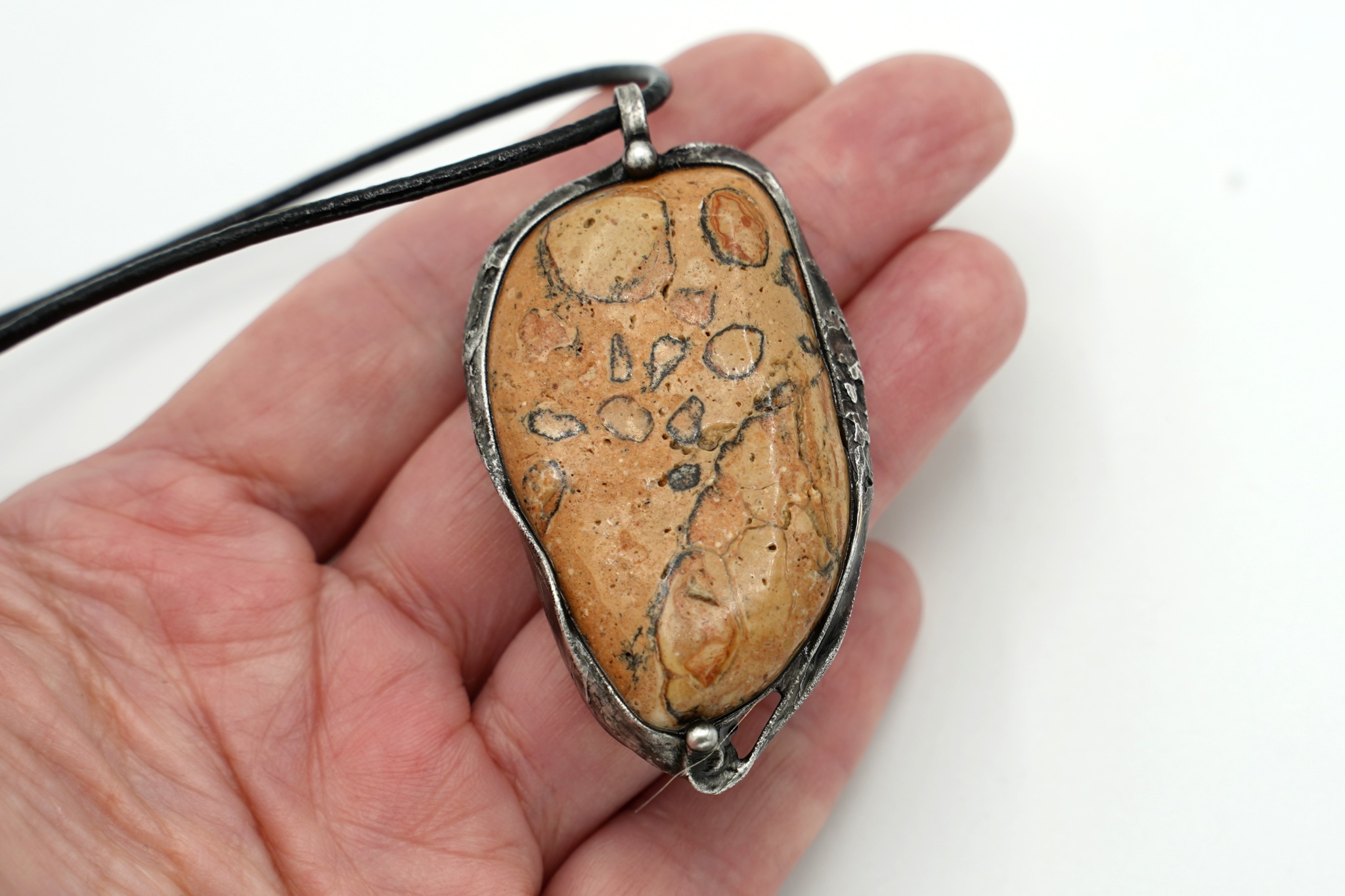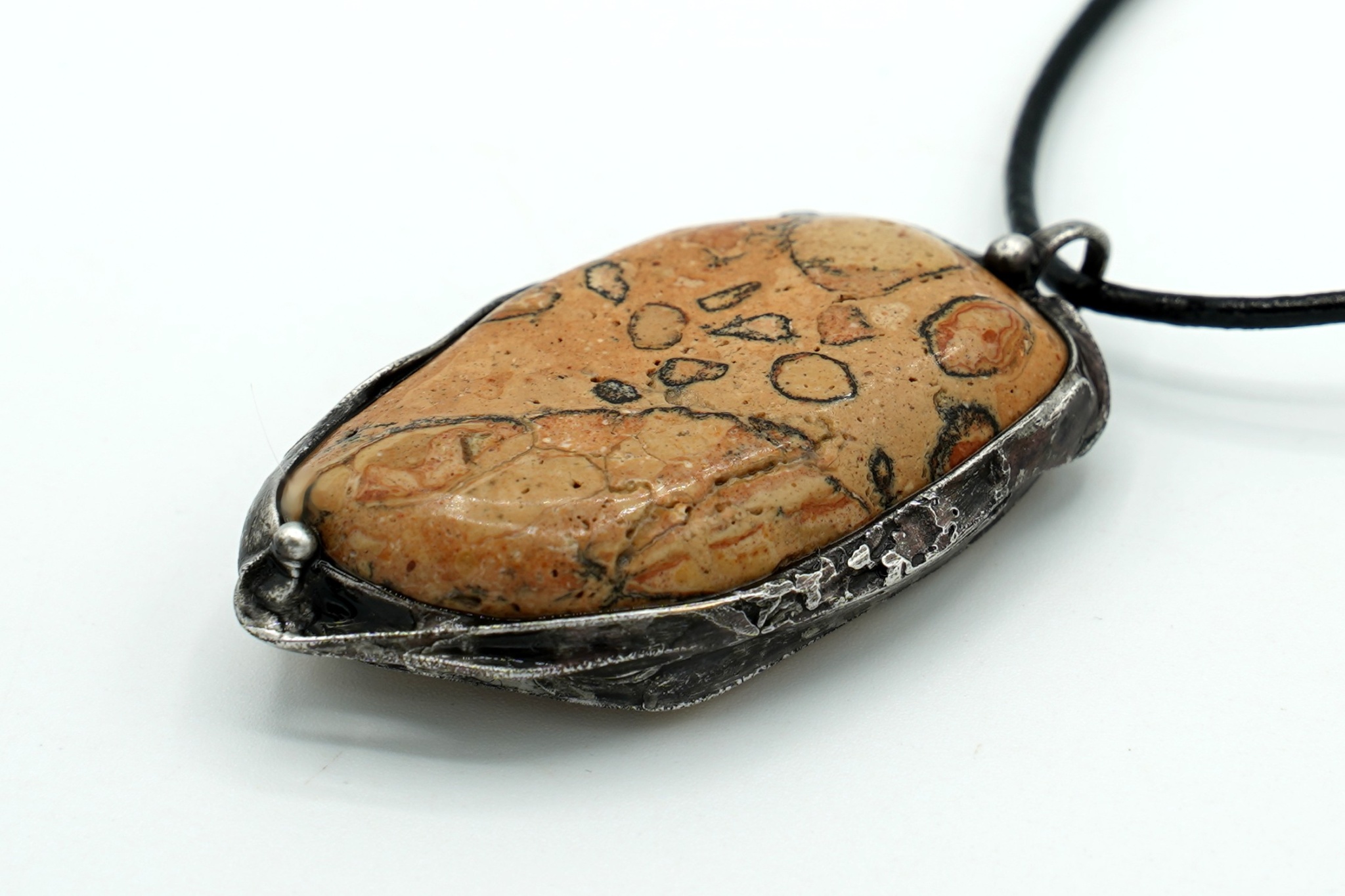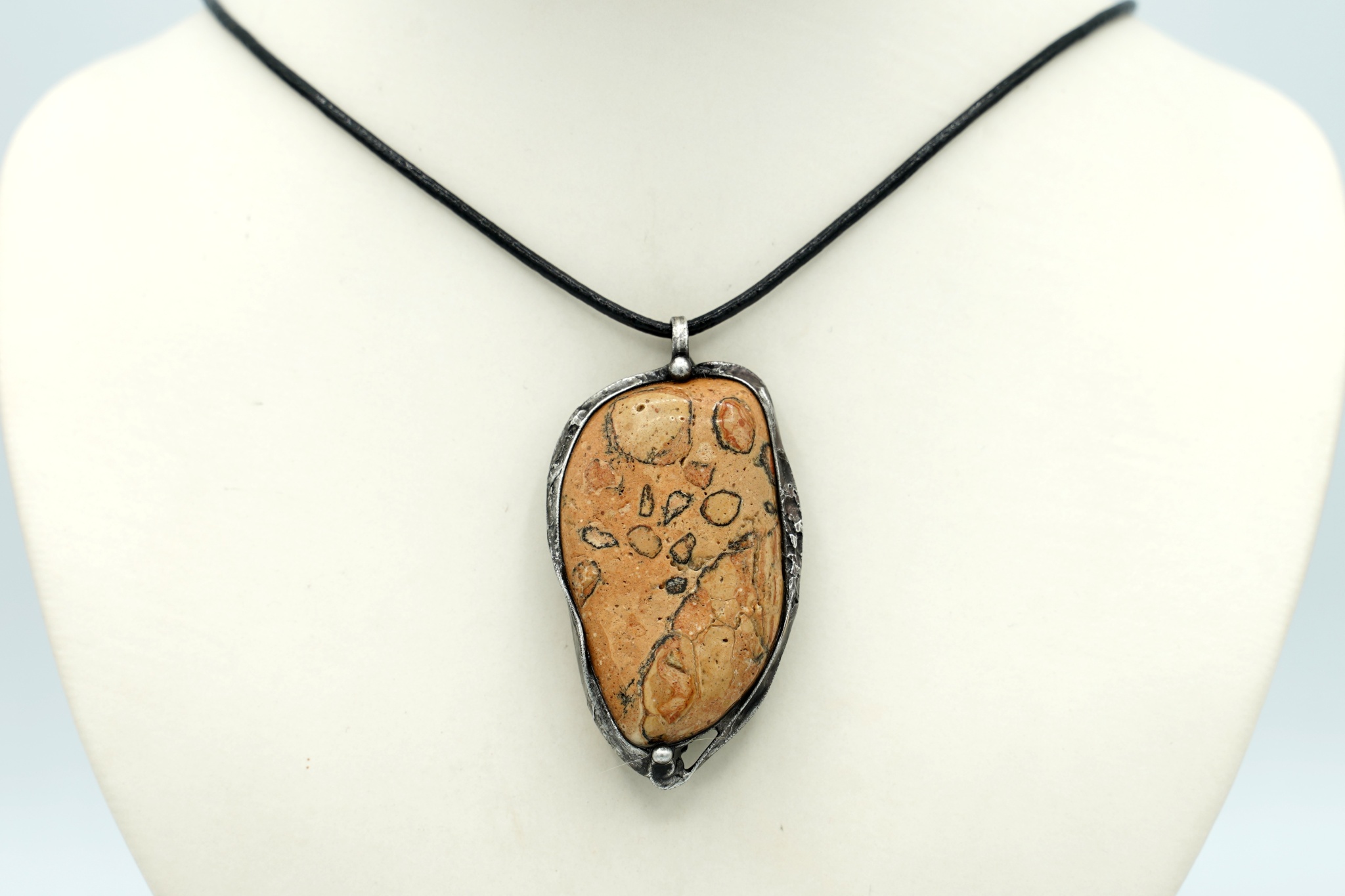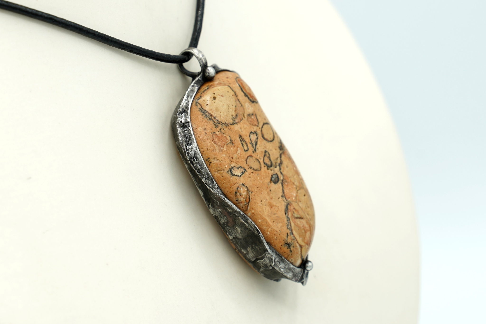 Přívěsek s velmi pěkným valounkem sopečné brekcie (JAR), z bezolovnatého cínu, patinován, ošetřen proti oxidaci.