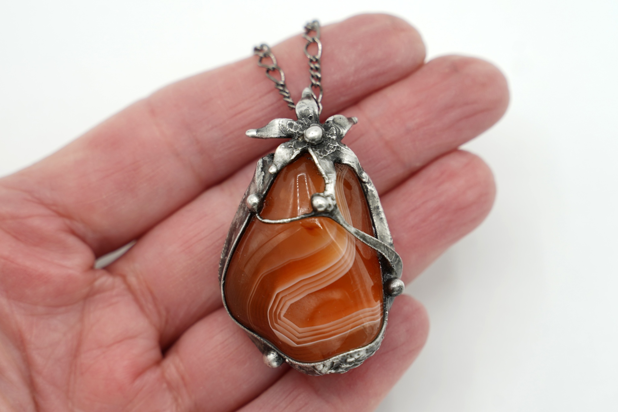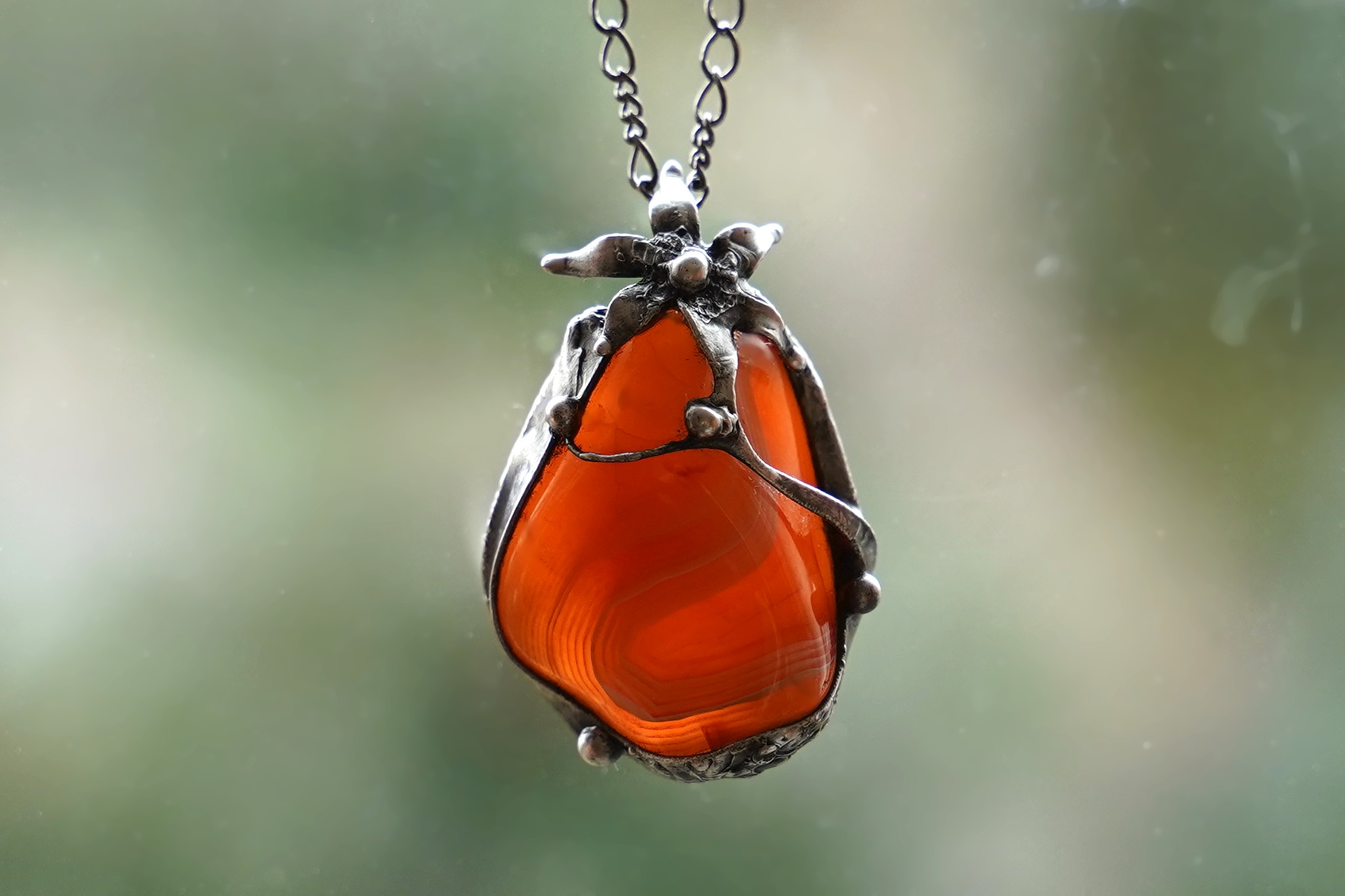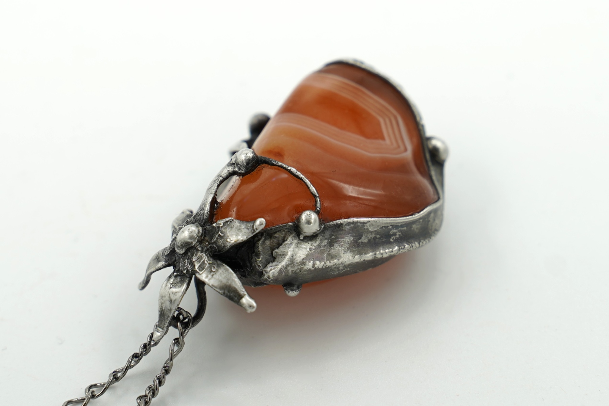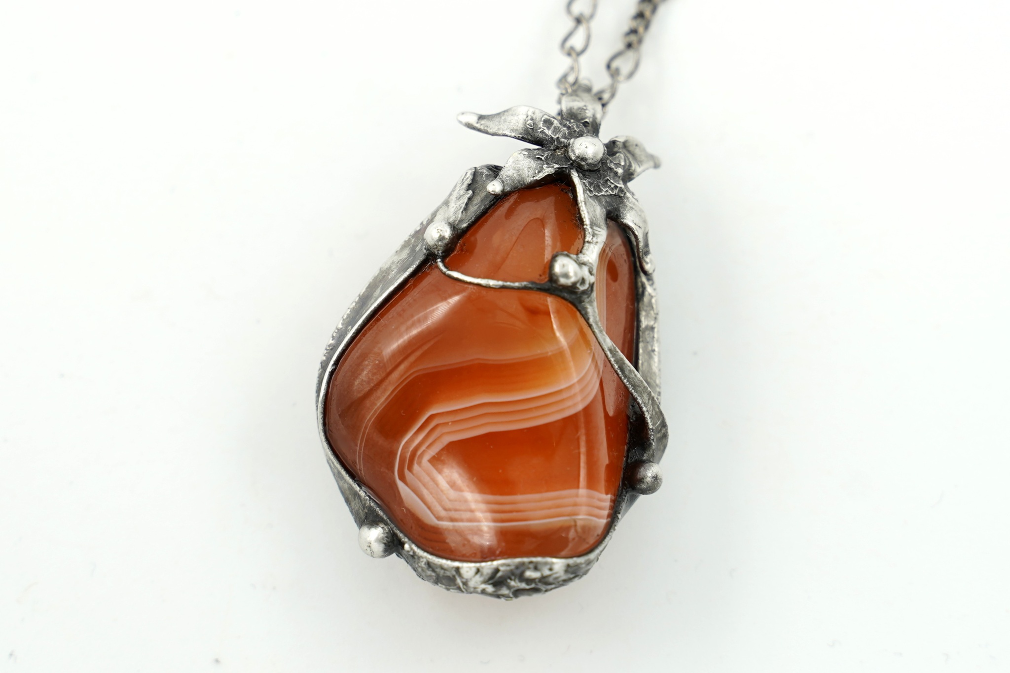 Přívěsek - náhrdelník s valounkem karneolu, z bezolovnatého cínu, patinován, ošetřen proti oxidaci.