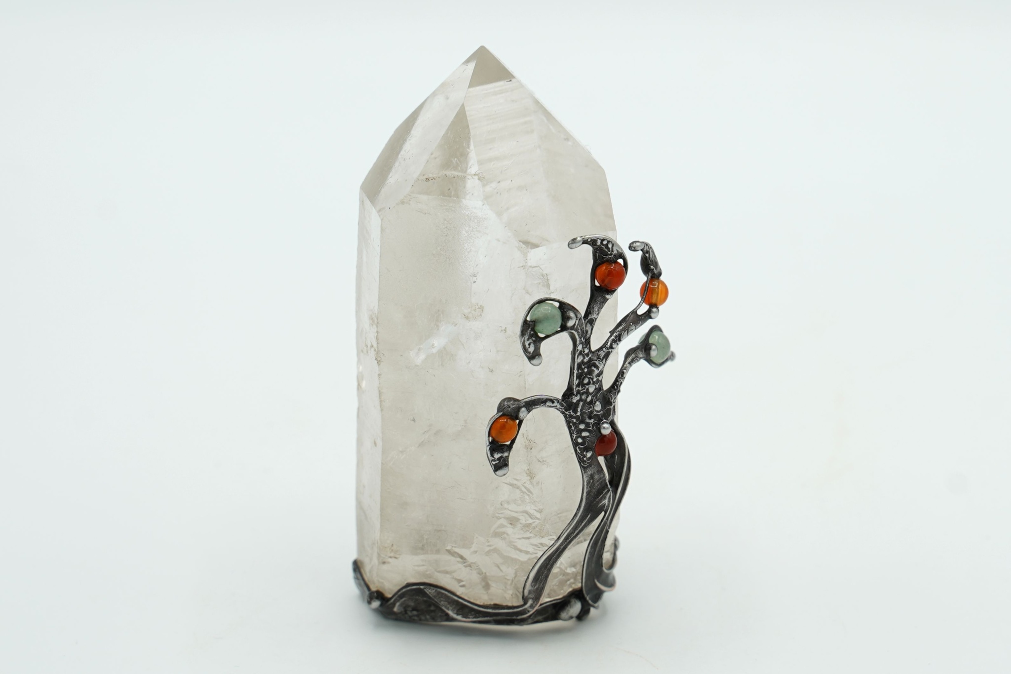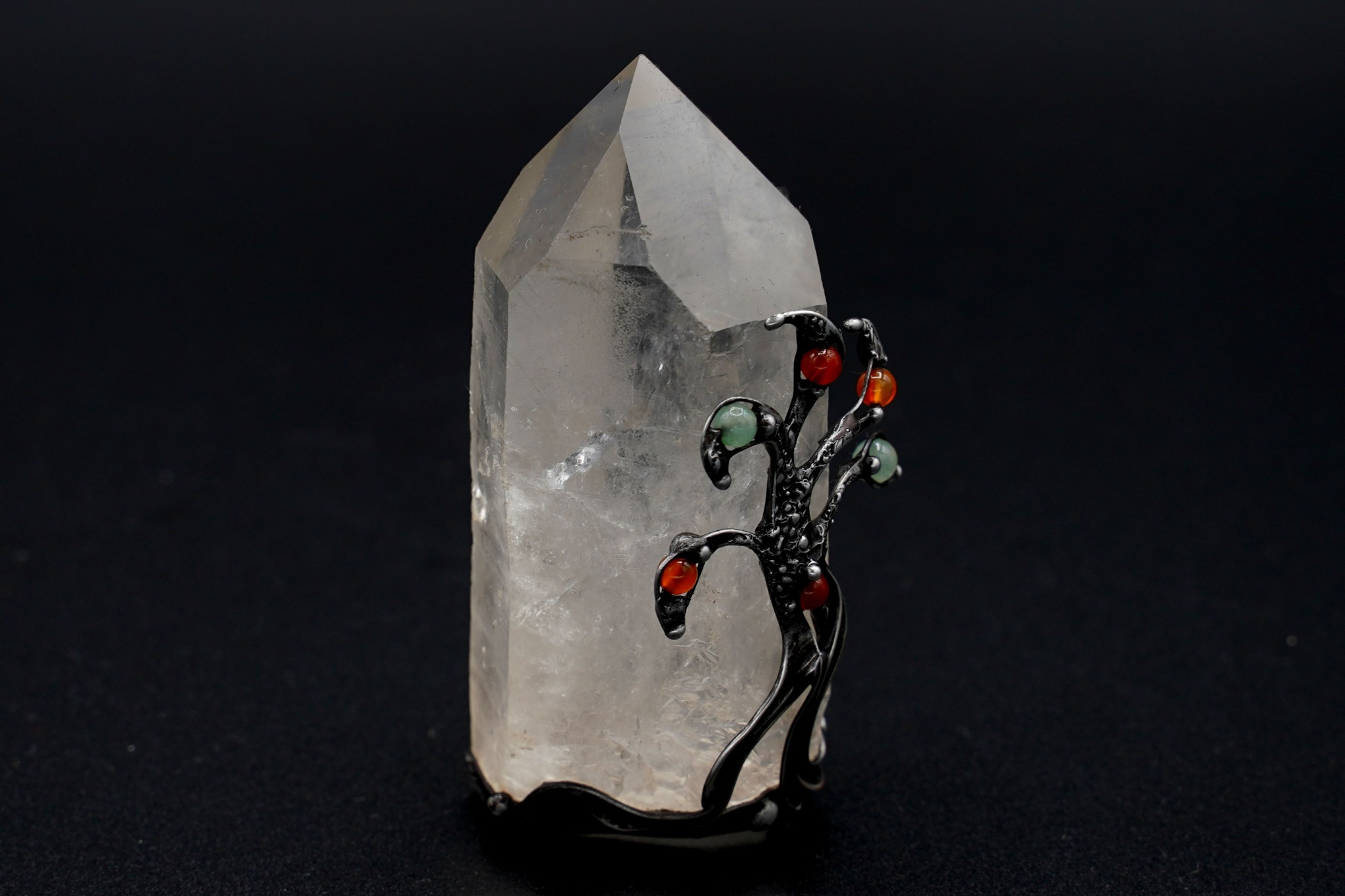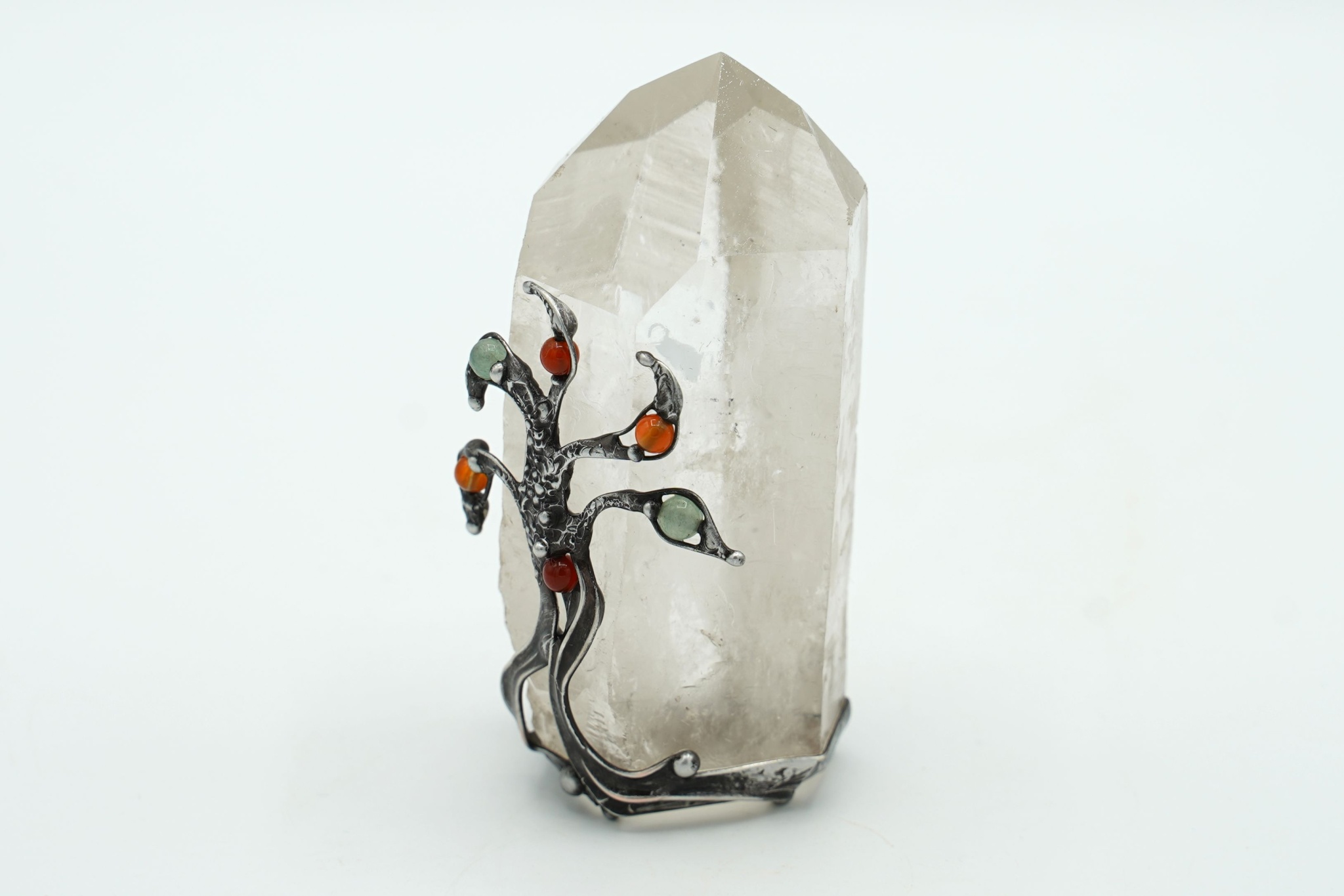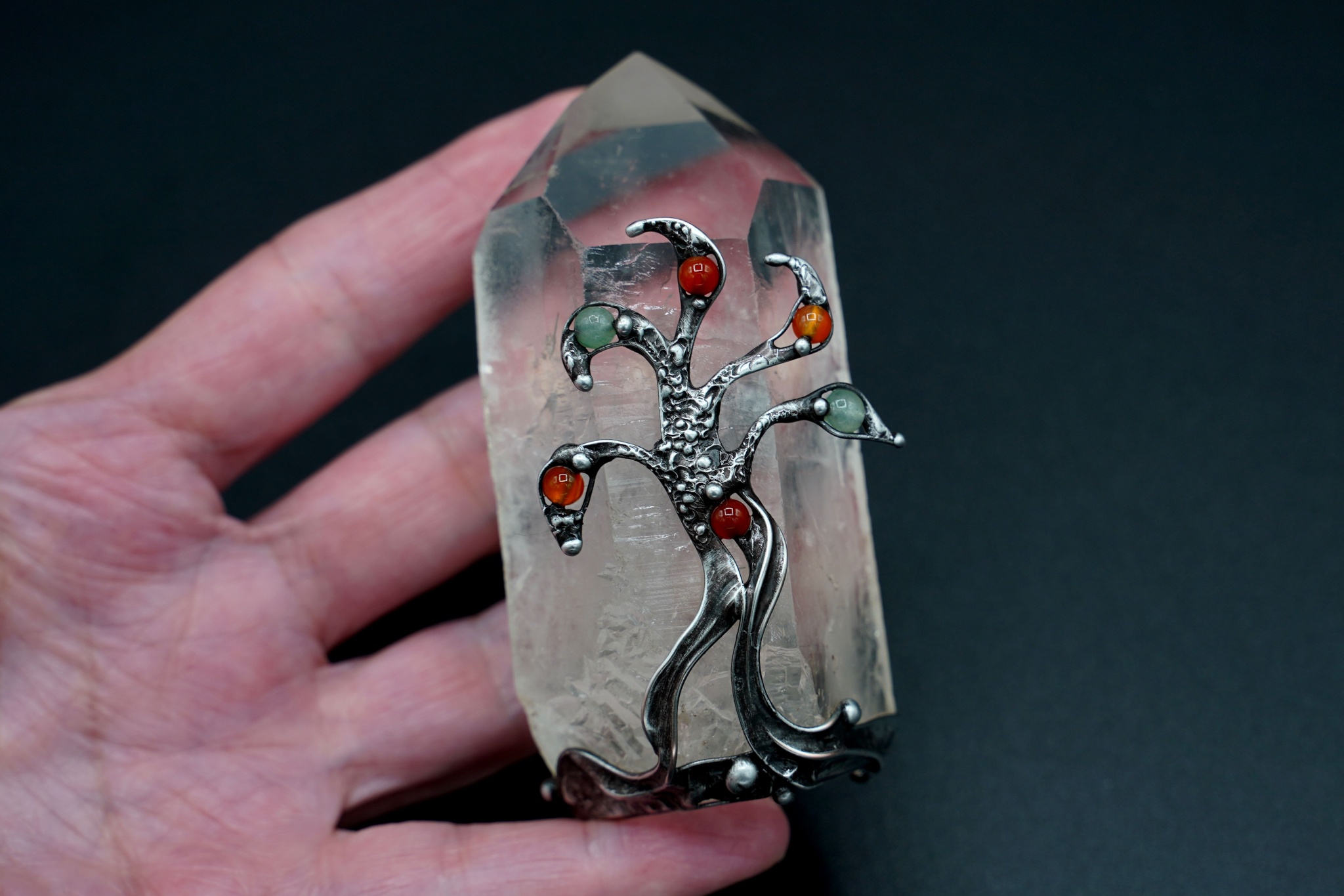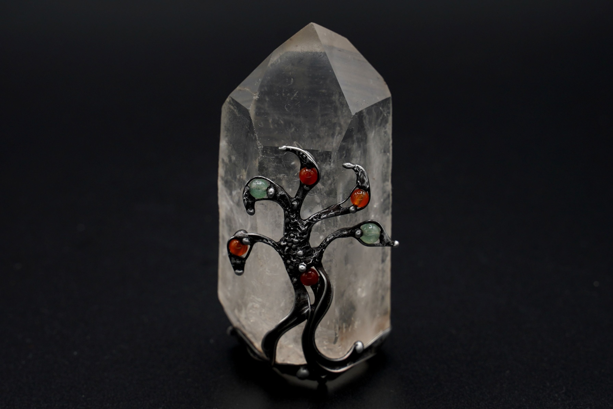 Originální dekorace z křišťálové špice, zdobené drátem a cínem, doplněno korálky karneolu a aventurínu. Patinováno, leštěno, ošetřeno antioxidantem.