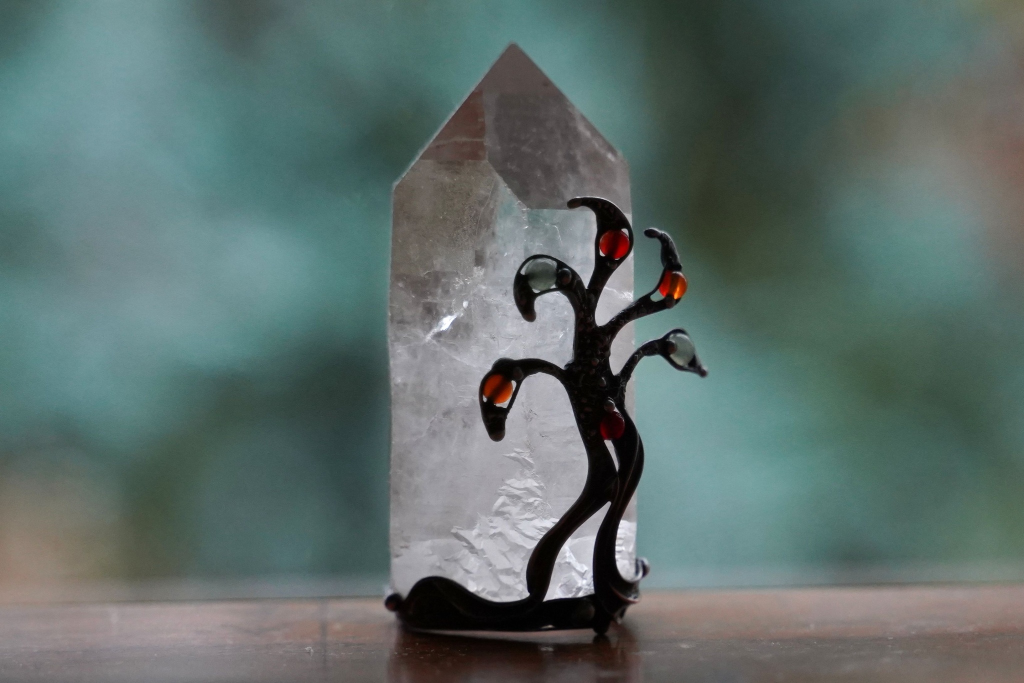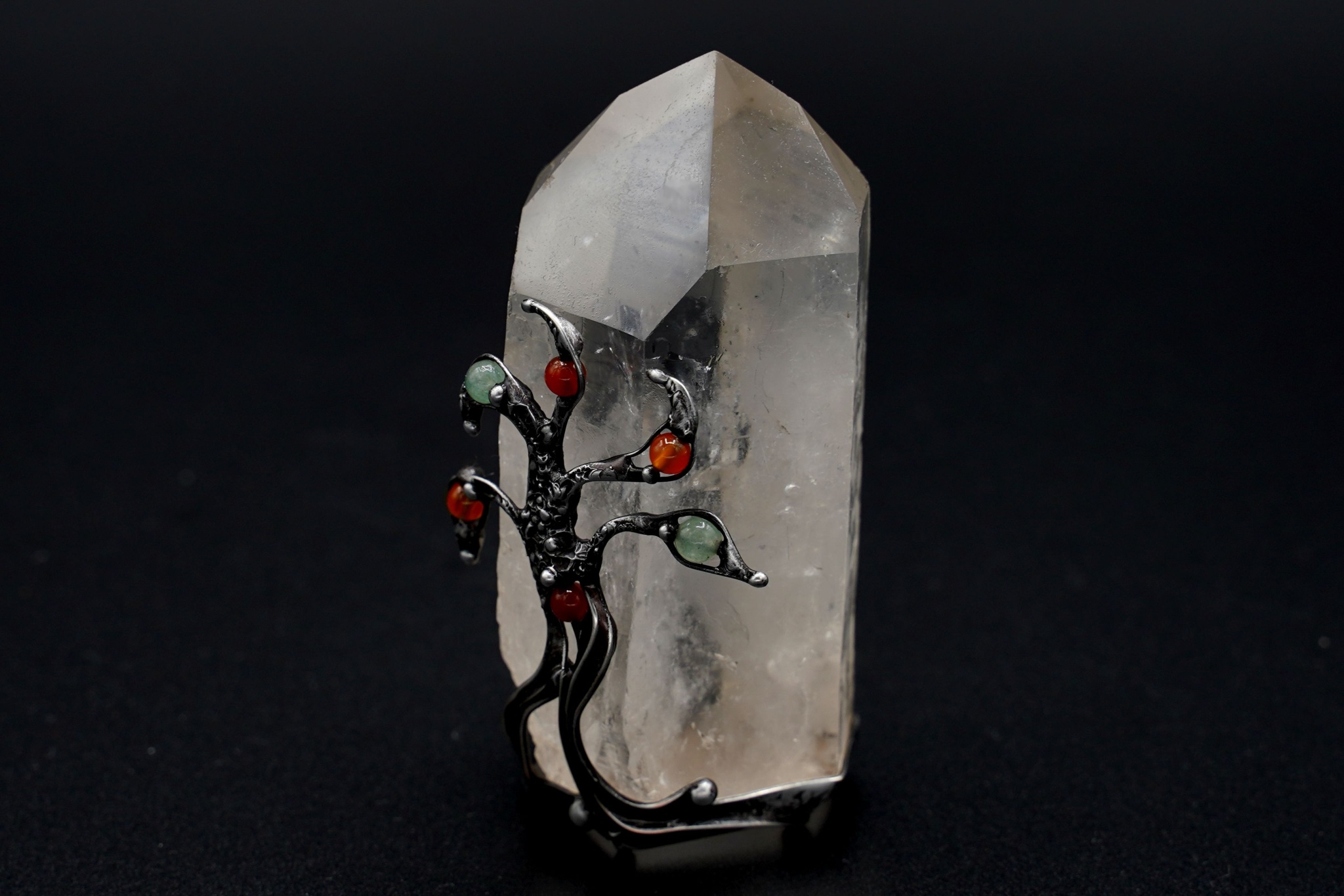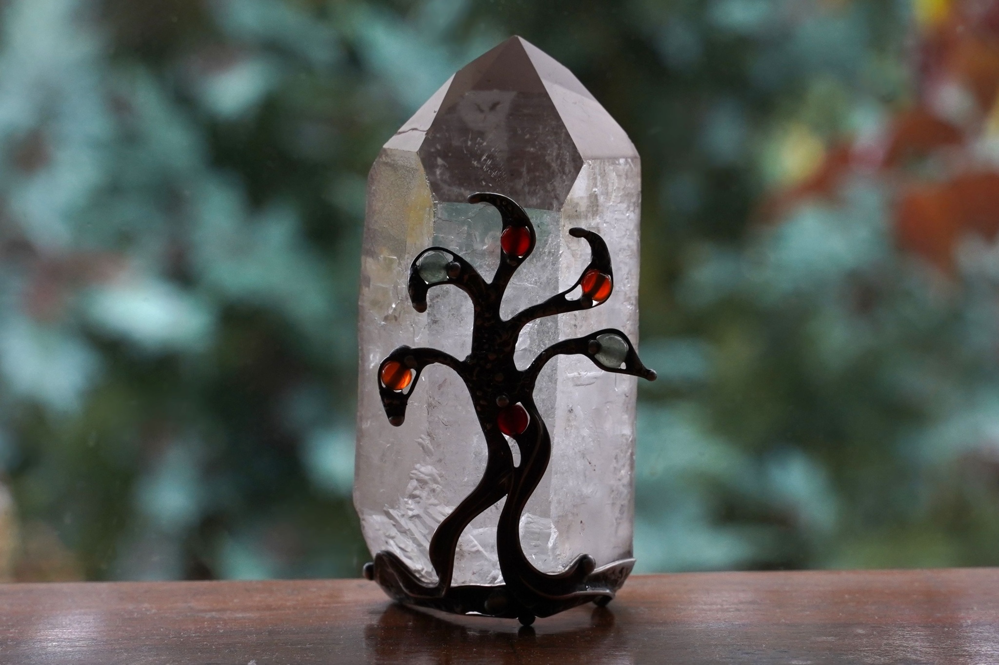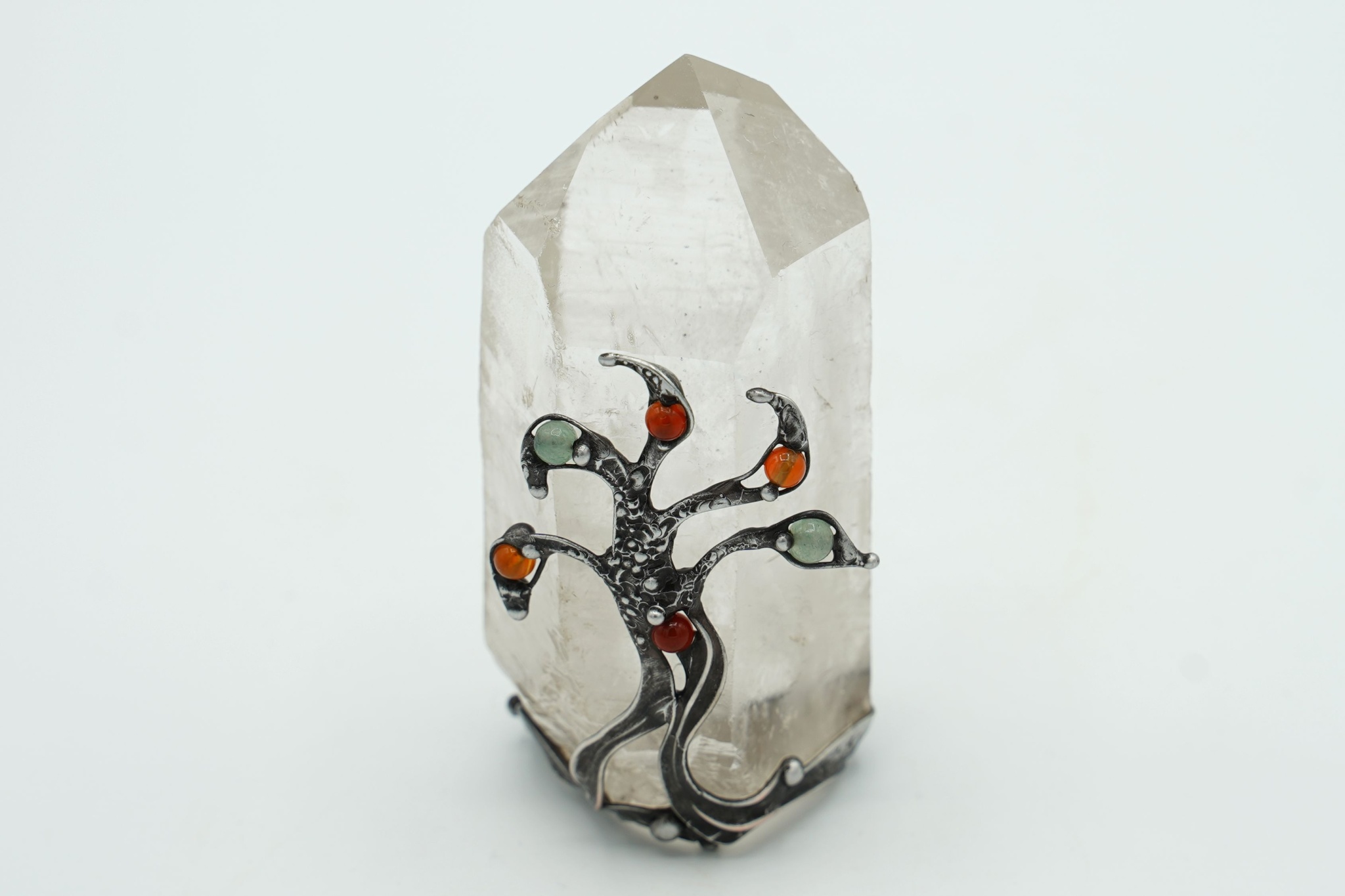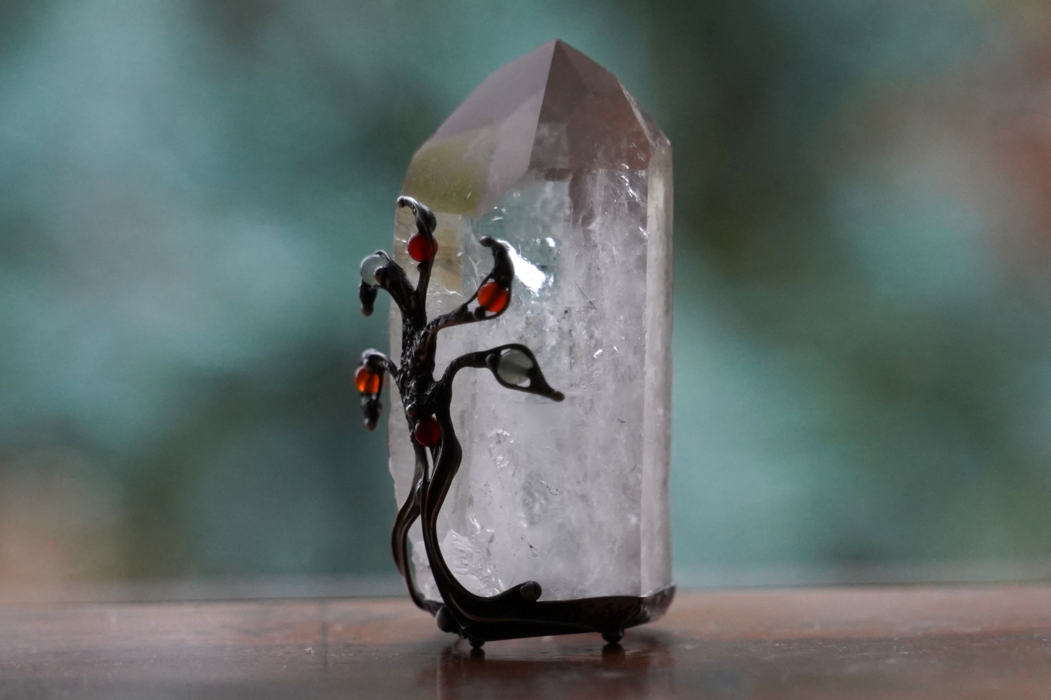 Originální dekorace z křišťálové špice, zdobené drátem a cínem, doplněno korálky karneolu a aventurínu. Patinováno, leštěno, ošetřeno antioxidantem.