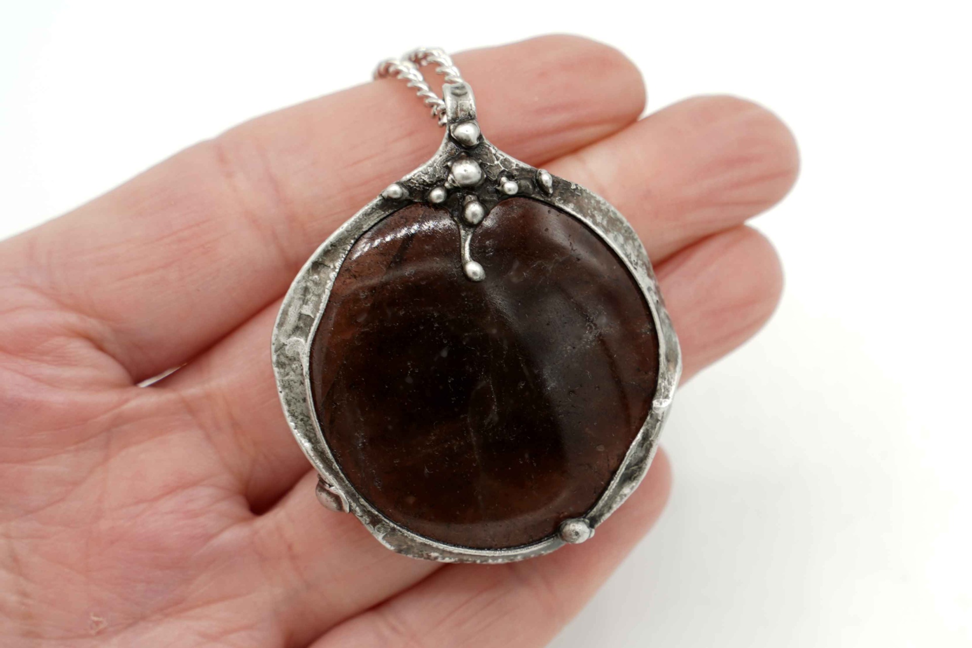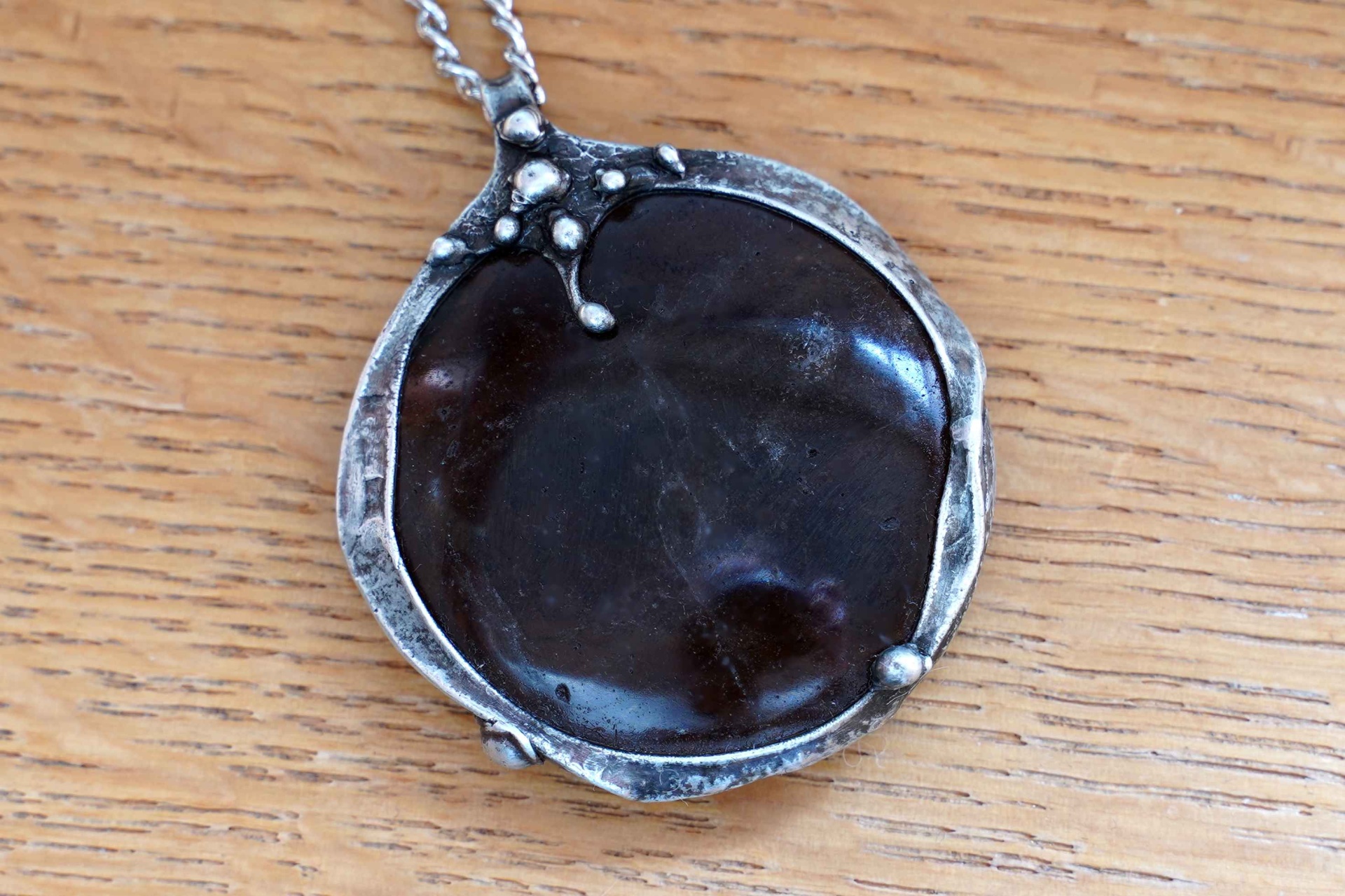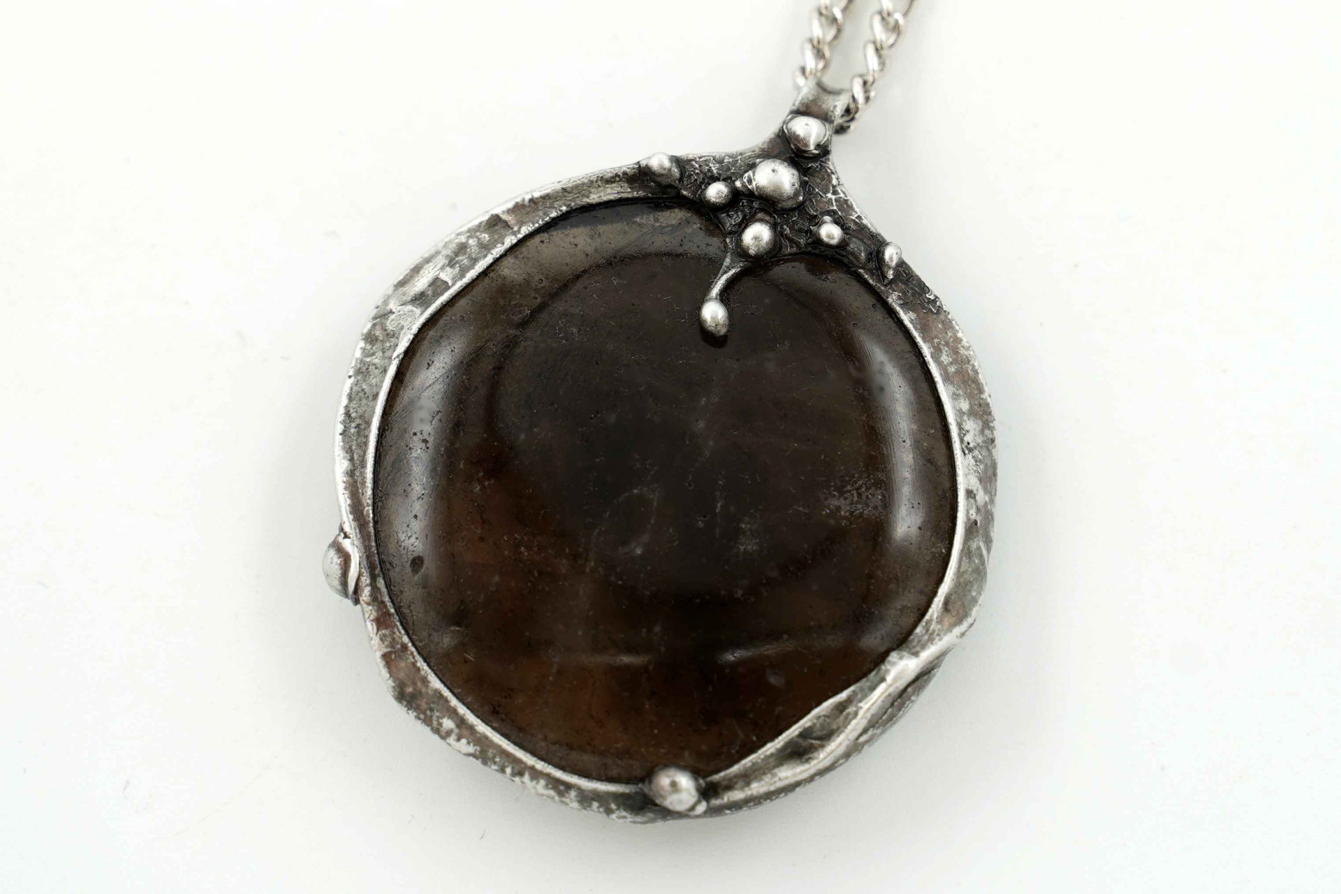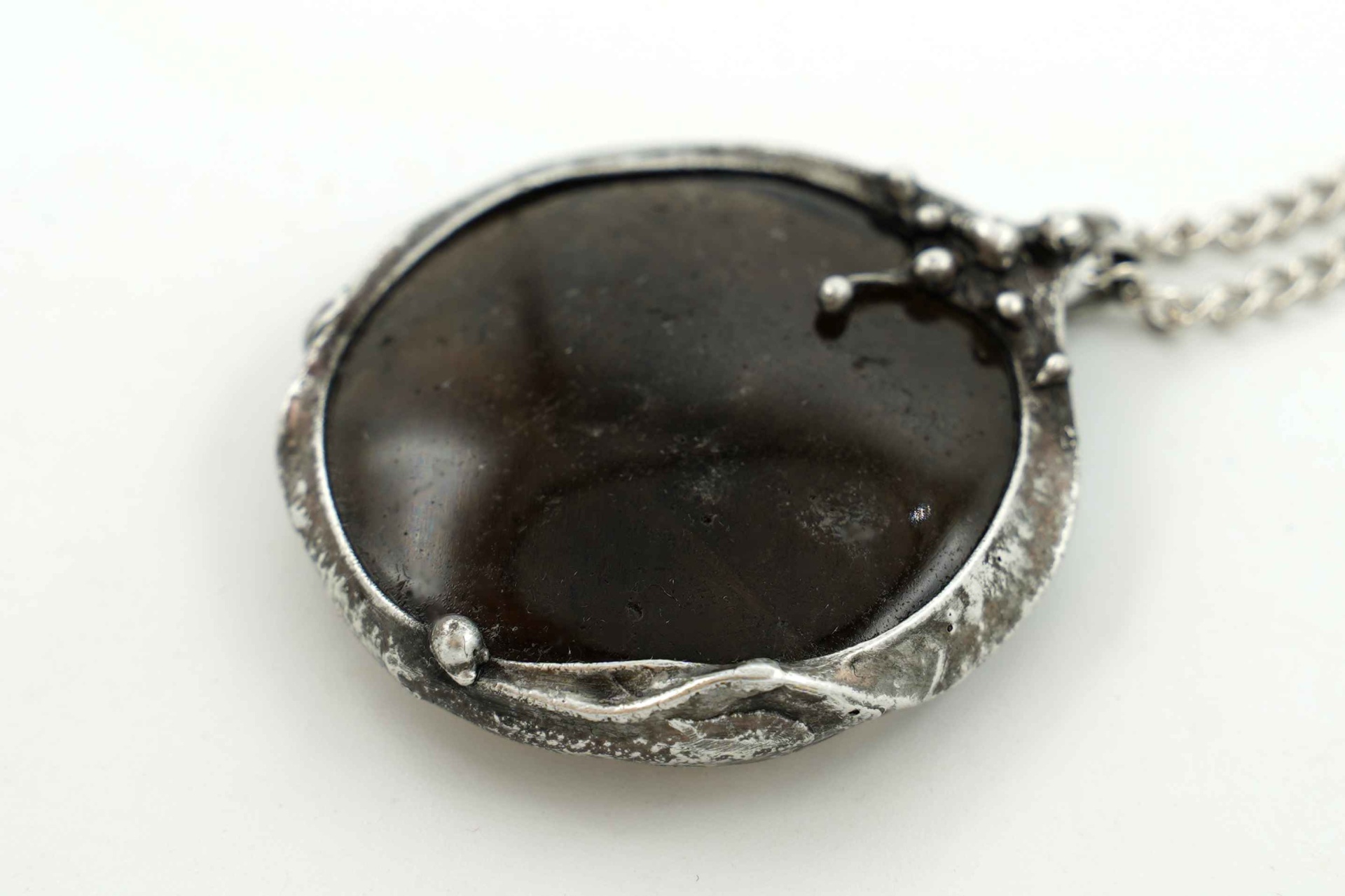 Náhrdelník s plochým valounkem záhnědy, z bezolovnatého cínu, patinován, ošetřen proti oxidaci.