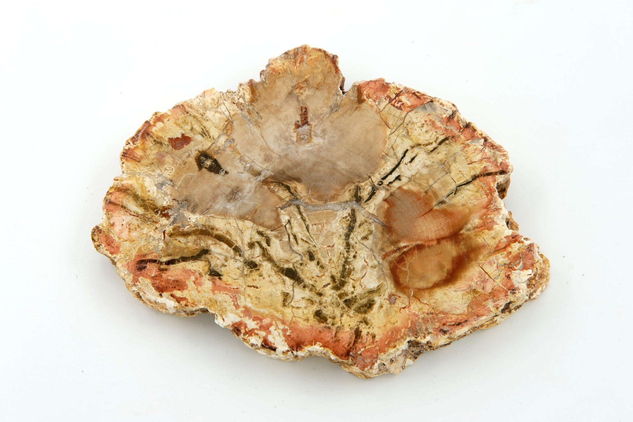 Zkamenělé dřevo plátek je leštěný z jedné strany, hrana ponechána přírodní.