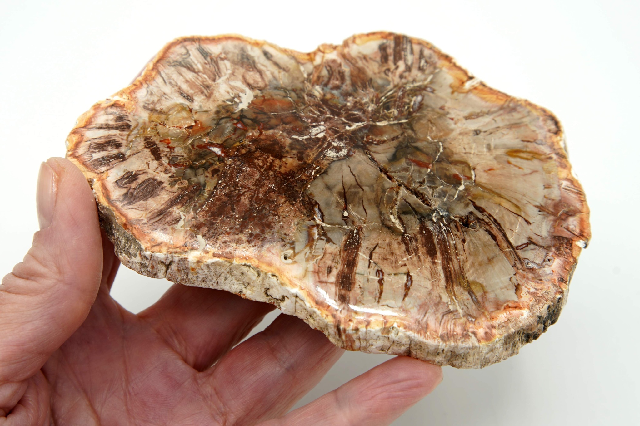 Zkamenělé dřevo plátek je leštěný z obou stran, hrana ponechána přírodní.